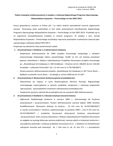 Załącznik do Uchwały Nr 43/622 /09 z dnia 2 czerwca 2009r. Pakiet rozwiązań antykryzysowych w związku z realizacją Regionalnego Programu Operacyjnego Województwa Kujawsko – Pomorskiego na lata 2007-2013 Kryzys gospodarczy zarówno w Polsce jak i na całym świecie spowodował znaczne pogorszenie sytuacji finansowej wielu podmiotów w tym także potencjalnych beneficjentów Regionalnego Programu Operacyjnego Województwa Kujawsko – Pomorskiego na lata 2007-2013. Przekłada się to na zagrożenie niewydatkowania środków w ramach programu. W związku z tym, Zarząd Województwa Kujawsko – Pomorskiego wychodząc naprzeciw powstałym trudnościom stworzył plan usprawniający realizację założeń RPO WK-P. Proponuje się wdrożenie niżej wymienionych zadań: 1. Oś priorytetowa 1 Działanie 1.3 Infrastruktura kolejowa − Zwiększenie dofinansowania do 100% projektu kluczowego związanego z zakupem nowoczesnego kolejowego taboru pasażerskiego. Środki na ten cel zostaną pozyskane poprzez wykreślenie z Wykazu Indywidualnych Projektów Kluczowych projektu kluczowego pn. „Rewitalizacja linii kolejowej nr 208 Działdowo – Chojnice od km 108,845 do km 130,363 Grudziądz – Laskowice Pomorskie” (ok. 1,5 mln euro tj. 6 736 500,00zł*). − Zmiana poziomu dofinansowania projektu „Rewitalizacja linii kolejowej nr 207 Toruń Wsch. – Malbork na odcinku Toruń Wsch. – Grudziądz tj. od km 0,000 do km 57,367”. 2. Oś priorytetowa 5 Wzmocnienie konkurencyjności przedsiębiorstw − Natychmiast po wejściu w życie Rozporządzenia Ministra Rozwoju Regionalnego zmieniającego rozporządzenie w sprawie wydatków związanych z realizacją programów operacyjnych, wprowadziliśmy możliwość zaliczkowania przedsiębiorców. − Zwiększenie poziomu zaliczek dla przedsiębiorców do wysokości 80% dofinansowania. 3. Oś priorytetowa 5 Działanie 5.1 Rozwój instytucji otoczenia biznesu − Ogłoszenie dodatkowego konkursu w czerwcu 2009 r., skierowanego do funduszy pożyczkowych i poręczeniowych. Poziom dofinansowania wynosić będzie 100% kosztów kwalifikowanych. Planowana alokacja na konkurs - 10 mln euro (tj. 44 910 000,00zł*) w wyniku przesunięcia z konkursu zaplanowanego na grudzień 2009 r. oraz 9 mln euro (tj. 40 419 000,00zł*) z projektów kluczowych dotyczących funduszy pożyczkowych i poręczeniowych, które zostaną wykreślone z Wykazu Indywidualnych Projektów Kluczowych ze względu na wymogi dotyczące pomocy publicznej i wezmą udział w niniejszym konkursie + oszczędności pozostałe z realizacji projektów kluczowych (m.in. z działania 5.6 Kompleksowe uzbrojenie terenów pod inwestycje ok. 7 mln euro tj. ok. 31 mln zł*) + z oszczędności 1 Załącznik do Uchwały Nr 43/622 /09 z dnia 2 czerwca 2009r. powstałych w 2008 roku z konkursu na działanie 5.2.1 Wsparcie inwestycji przedsiębiorstw 10 000 000,00zł tj. łącznie ok. 126 mln zł. 4. Oś priorytetowa 5 Działanie 5.2.2 wsparcie inwestycji przedsiębiorstw − Ogłoszenie dodatkowego konkursu w 2009 r. na projekty już zrealizowane bądź z okresem realizacji do 3 miesięcy (schemat de minimis). Środki na konkurs pochodzić będą częściowo z konkursu na 2010 rok - 7 570 045,00 euro (tj. 33 997 072,09zł*) + 5 mln euro (tj. 22 455 000,00zł*) przesunięte z konkursu na 2009 rok, tj. łącznie 56 452 072,09zł – część tej kwoty powiększy alokację na konkurs ogłoszony w październiku 2008 roku (w trakcie oceny). 5. Oś priorytetowa 7 Wspieranie przemian w miastach i w obszarach wymagających odnowy Działanie 7.1 Rewitalizacja zdegradowanych dzielnic miast − Skrócenie czasu na ocenę Lokalnych Programów Rewitalizacji dokonywaną przez pracowników Urzędu Marszałkowskiego, ocena formalna skrócona z 10 do 5 dni, ocena merytoryczna z 30 do 20 dni. − Wprowadzenie zasady, iż każde miasto powinno wykorzystać kwotę w wysokości ok. 1/7 przyznanej alokacji z EFRR do 30.09.2010 r. − Wyznacza się termin złożenia Lokalnego Programu Rewitalizacji do Departamentu Polityki Regionalnej do oceny formalnej na koniec sierpnia 2009 roku. Termin złożenia wniosku o dofinansowanie na projekty na kwoty gwarantujące poziom wydatkowania wynikający z powyższej zasady – do końca roku oraz terminu na realizację projektów (na podstawie informacji o stopniu przygotowania LPR uzyskanych od miast. − Ogłoszenie dodatkowego konkursu planowanego na połowę 2010 roku na projekty w ramach LPR. Kwota alokacji na ten konkurs pochodzić będzie z różnicy kursowej powstałej w wyniku przeliczenia kwoty alokacji wg kursu euro na dzień ogłoszenia konkursu (luty 2009r. – 3,5650zł=1euro) a bieżącym kursem (czerwiec 2009r. – 4,491zł=1euro) i wynosi 65 166 586,06zł. − złożenie wniosku o dofinansowanie możliwe będzie po zakończeniu oceny formalnej LPR, a w trakcie oceny merytorycznej prowadzonej przez Departament Planowania Strategicznego i Gospodarczego. 6. Projekty kluczowe - Przeprowadzenie naboru uzupełniającego do Indykatywnego Wykazu Indywidualnych Projektów Kluczowych na projekty beneficjentów, którzy zrealizowali już inny projekt w ramach Regionalnego Programu Operacyjnego Województwa Kujawsko – Pomorskiego na lata 2007-2013 (oprócz działania 5.5). 2 Załącznik do Uchwały Nr 43/622 /09 z dnia 2 czerwca 2009r. − Dodatkowy nabór projektów kluczowych dot. dróg wojewódzkich na wartość oszczędności poprzetargowych powstałych przy realizacji projektów kluczowych obejmujących drogi wojewódzkie, znajdujących się w Indykatywnym Wykazie Indywidualnych Projektów Kluczowych (3 610 150,00 zł) + kwota alokacji przeznaczona na konkurs w ramach działania 1.2 Infrastruktura transportu publicznego (1 329 111,00 euro tj. 5 969 037,50zł*) + część kwoty powstałej w wyniku wykreślenia z Wykazu Indywidualnych Projektów Kluczowych projektu kluczowego pn. „Rewitalizacja linii kolejowej nr 208 Działdowo – Chojnice od km 108,845 do km 130,363 Grudziądz 