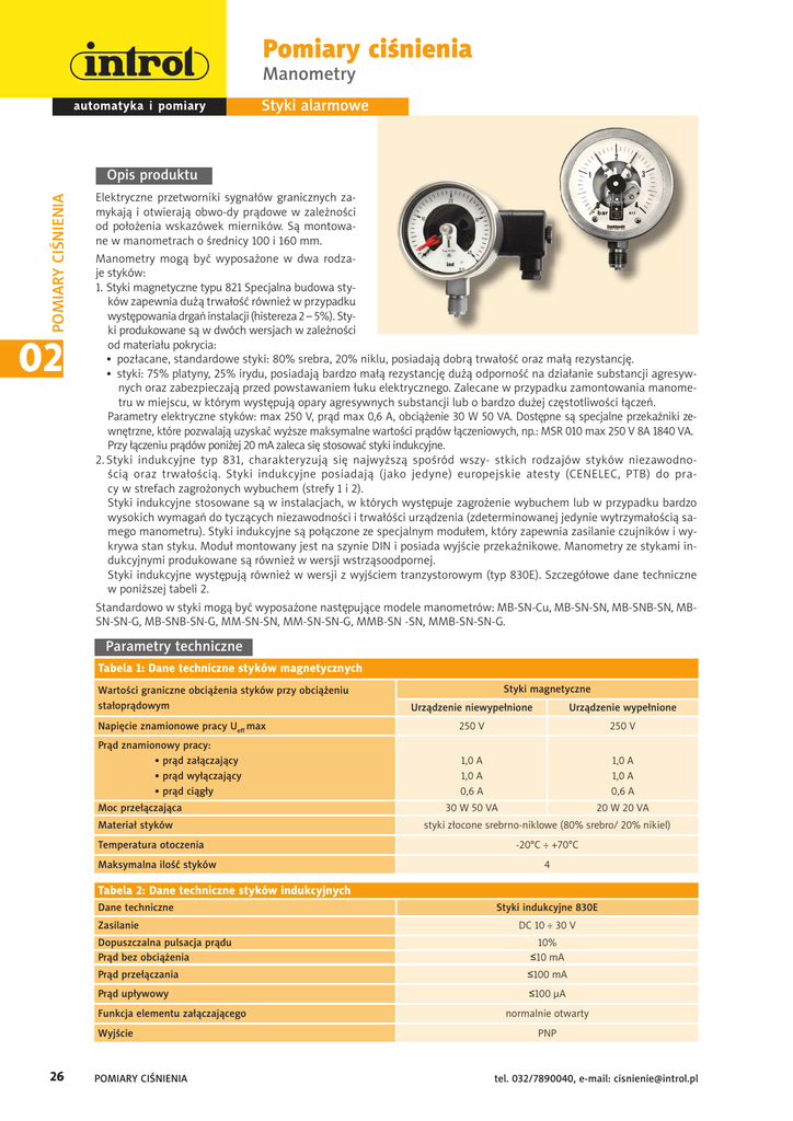 Pomiary ciśnienia Manometry Styki alarmowe POMIARY CIŚNIENIA Opis produktu 02 Elektryczne przetworniki sygnałów granicznych zamykają i otwierają obwo-dy prądowe w zależności od położenia wskazówek mierników. Są montowane w manometrach o średnicy 100 i 160 mm. Manometry mogą być wyposażone w dwa rodzaje styków: 1. Styki magnetyczne typu 821 Specjalna budowa styków zapewnia dużą trwałość również w przypadku występowania drgań instalacji (histereza 2 – 5%). Styki produkowane są w dwóch wersjach w zależności od materiału pokrycia: • pozłacane, standardowe styki: 80% srebra, 20% niklu, posiadają dobrą trwałość oraz małą rezystancję. • styki: 75% platyny, 25% irydu, posiadają bardzo małą rezystancję dużą odporność na działanie substancji agresywnych oraz zabezpieczają przed powstawaniem łuku elektrycznego. Zalecane w przypadku zamontowania manometru w miejscu, w którym występują opary agresywnych substancji lub o bardzo dużej częstotliwości łączeń. Parametry elektryczne styków: max 250 V, prąd max 0,6 A, obciążenie 30 W 50 VA. Dostępne są specjalne przekaźniki zewnętrzne, które pozwalają uzyskać wyższe maksymalne wartości prądów łączeniowych, np.: MSR 010 max 250 V 8A 1840 VA. Przy łączeniu prądów poniżej 20 mA zaleca się stosować styki indukcyjne. 2. Styki indukcyjne typ 831, charakteryzują się najwyższą spośród wszy- stkich rodzajów styków niezawodnością oraz trwałością. Styki indukcyjne posiadają (jako jedyne) europejskie ate sty (CENELEC, PTB) do pracy w strefach zagrożonych wybuchem (strefy 1 i 2). Styki indukcyjne stosowane są w instalacjach, w których występuje zagrożenie wybuchem lub w przypadku bardzo wysokich wymagań do tyczących niezawodności i trwałóści urządzenia (zdeterminowanej jedynie wytrzymałością samego manometru). Styki indukcyjne są połączone ze specjalnym modułem, który zapewnia zasilanie czujników i wykrywa stan styku. Moduł montowany jest na szynie DIN i posiada wyjście przekaźnikowe. Manometry ze stykami indukcyjnymi produkowane są również w wersji wstrząsoodpornej. Styki indukcyjne występują również w wersji z wyjściem tranzystorowym (typ 830E). Szczegółowe dane techniczne w poniższej tabeli 2. Standardowo w styki mogą być wyposażone następujące modele manometrów: MB-SN-Cu, MB-SN-SN, MB-SNB-SN, MBSN-SN-G, MB-SNB-SN-G, MM-SN-SN, MM-SN-SN-G, MMB-SN -SN, MMB-SN-SN-G. Parametry techniczne Tabela 1: Dane techniczne styków magnetycznych Wartości graniczne obciążenia styków przy obciążeniu stałoprądowym Styki magnetyczne Urządzenie niewypełnione Urządzenie wypełnione Napięcie znamionowe pracy Ueff max 250 V 250 V Prąd znamionowy pracy: • prąd załączający • prąd wyłączający • prąd ciągły 1,0 A 1,0 A 0,6 A 1,0 A 1,0 A 0,6 A 30 W 50 VA 20 W 20 VA Moc przełączająca Materiał styków Temperatura otoczenia Maksymalna ilość styków styki złocone srebrno-niklowe (80% srebro/ 20% nikiel) -20°C ÷ +70°C 4 Tabela 2: Dane techniczne styków indukcyjnych Dane techniczne Zasilanie DC 10 ÷ 30 V Dopuszczalna pulsacja prądu Prąd bez obciążenia 10% 10 mA Prąd przełączania 100 mA Prąd upływowy 100 µA Funkcja elementu załączającego Wyjście 26 Styki indukcyjne 830E POMIARY CIŚNIENIA normalnie otwarty PNP tel. 032/7890040, e-mail: [email protected] Pomiary ciśnienia Manometry Tabela 3: Funkcje przełączające w stykach magnetycznych i indukcyjnych Zestyk pojedyńczy 1) Ruch wskazówki zgodnie z ruchem wskazówek zegara Funkcja przełączająca Typ styku z oznaczeniem funkcji przełączającej Styk indukcyjny Styk magnetyczny Styk zamyka przy przekroczeniu wartości zadanej (NO - normalnie otwarty) 831.1 821.1 Styk otwiera przy przekroczeniu wartości zadanej (NC - normalnie zamknięty) 831.2 821.2 POMIARY CIŚNIENIA Połączenia 02 SPDT: styk przełącza (zestyk przełączny), 1 zestyk otwiera i 2 zestyk zamyka przy przekroczeniu wartości zadanej 831.3 821.3 1 i 2 styk zamyka przy przekroczeniu wartości zadanej 831.11 821.11 1 styk zamyka przy przekroczeniu wartości zadanej 2 styk otwiera przy przekroczeniu wartości zadanej 831.12 821.12 1 styk otwiera przy przekroczeniu wartości zadanej 2 styk zamyka przy przekroczeniu wartości zadanej 831.21 821.21 1 i 2 styk otwiera przy przekroczeniu wartości zadanej 831.22 821.22 831.212 821.212 Zestyk podwójny 1) Zestyk potrójny 1) 1 styk otwiera przy przekroczeniu 2 styk zamyka przy przekroczeniu 3 styk otwiera przy przekroczeniu wartości zadanej 1) Przy zamówieniu należy do numeru typu styku dopisać liczbę charakteryzującą wymagane funkcje przełączające (kolejność 1, 2, 3 styk); przykład 811.212 względnie 821.212. Zaciski przyłączeniowe względnie żyły przyłączeniowe oznakowane są zgodnie z powyższą tabelą. Przewód uziemiający zielono-żółty. tel. 032/7890040, e-mail: [email protected] POMIARY CIŚNIENIA 27
