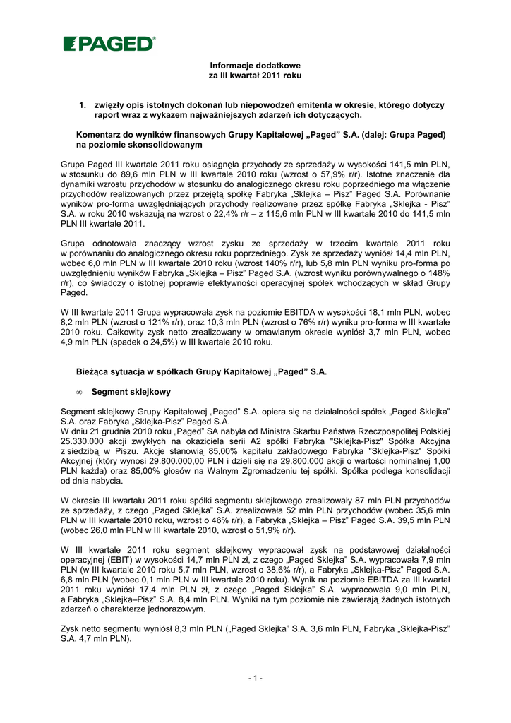Informacje dodatkowe za III kwartał 2011 roku 1. zwięzły opis istotnych dokonań lub niepowodzeń emitenta w okresie, którego dotyczy raport wraz z wykazem najważniejszych zdarzeń ich dotyczących. Komentarz do wyników finansowych Grupy Kapitałowej „Paged” S.A. (dalej: Grupa Paged) na poziomie skonsolidowanym Grupa Paged III kwartale 2011 roku osiągnęła przychody ze sprzedaży w wysokości 141,5 mln PLN, w stosunku do 89,6 mln PLN w III kwartale 2010 roku (wzrost o 57,9% r/r). Istotne znaczenie dla dynamiki wzrostu przychodów w stosunku do analogicznego okresu roku poprzedniego ma włączenie przychodów realizowanych przez przejętą spółkę Fabryka „Sklejka – Pisz” Paged S.A. Porównanie wyników pro-forma uwzględniających przychody realizowane przez spółkę Fabryka „Sklejka - Pisz” S.A. w roku 2010 wskazują na wzrost o 22,4% r/r – z 115,6 mln PLN w III kwartale 2010 do 141,5 mln PLN III kwartale 2011. Grupa odnotowała znaczący wzrost zysku ze sprzedaży w trzecim kwartale 2011 roku w porównaniu do analogicznego okresu roku poprzedniego. Zysk ze sprzedaży wyniósł 14,4 mln PLN, wobec 6,0 mln PLN w III kwartale 2010 roku (wzrost 140% r/r), lub 5,8 mln PLN wyniku pro-forma po uwzględnieniu wyników Fabryka „Sklejka – Pisz” Paged S.A. (wzrost wyniku porównywalnego o 148% r/r), co świadczy o istotnej poprawie efektywności operacyjnej spółek wchodzących w skład Grupy Paged. W III kwartale 2011 Grupa wypracowała zysk na poziomie EBITDA w wysokości 18,1 mln PLN, wobec 8,2 mln PLN (wzrost o 121% r/r), oraz 10,3 mln PLN (wzrost o 76% r/r) wyniku pro-forma w III kwartale 2010 roku. Całkowity zysk netto zrealizowany w omawianym okresie wyniósł 3,7 mln PLN, wobec 4,9 mln PLN (spadek o 24,5%) w III kwartale 2010 roku. Bieżąca sytuacja w spółkach Grupy Kapitałowej „Paged” S.A. • Segment sklejkowy Segment sklejkowy Grupy Kapitałowej „Paged” S.A. opiera się na działalności spółek „Paged Sklejka” S.A. oraz Fabryka „Sklejka-Pisz” Paged S.A. W dniu 21 grudnia 2010 roku „Paged” SA nabyła od Ministra Skarbu Państwa Rzeczpospolitej Polskiej 25.330.000 akcji zwykłych na okaziciela serii A2 spółki Fabryka "Sklejka-Pisz" Spółka Akcyjna z siedzibą w Piszu. Akcje stanowią 85,00% kapitału zakładowego Fabryka "Sklejka-Pisz" Spółki Akcyjnej (który wynosi 29.800.000,00 PLN i dzieli się na 29.800.000 akcji o wartości nominalnej 1,00 PLN każda) oraz 85,00% głosów na Walnym Zgromadzeniu tej spółki. Spółka podlega konsolidacji od dnia nabycia. W okresie III kwartału 2011 roku spółki segmentu sklejkowego zrealizowały 87 mln PLN przychodów ze sprzedaży, z czego „Paged Sklejka” S.A. zrealizowała 52 mln PLN przychodów (wobec 35,6 mln PLN w III kwartale 2010 roku, wzrost o 46% r/r), a Fabryka „Sklejka – Pisz” Paged S.A. 39,5 mln PLN (wobec 26,0 mln PLN w III kwartale 2010, wzrost o 51,9% r/r). W III kwartale 2011 roku segment sklejkowy wypracował zysk na podstawowej działalności operacyjnej (EBIT) w wysokości 14,7 mln PLN zł, z czego „Paged Sklejka” S.A. wypracowała 7,9 mln PLN (w III kwartale 2010 roku 5,7 mln PLN, wzrost o 38,6% r/r), a Fabryka „Sklejka-Pisz” Paged S.A. 6,8 mln PLN (wobec 0,1 mln PLN w III kwartale 2010 roku). Wynik na poziomie EBITDA za III kwartał 2011 roku wyniósł 17,4 mln PLN zł, z czego „Paged Sklejka” S.A. wypracowała 9,0 mln PLN, a Fabryka „Sklejka–Pisz” S.A. 8,4 mln PLN. Wyniki na tym poziomie nie zawierają żadnych istotnych zdarzeń o charakterze jednorazowym. Zysk netto segmentu wyniósł 8,3 mln PLN („Paged Sklejka” S.A. 3,6 mln PLN, Fabryka „Sklejka-Pisz” S.A. 4,7 mln PLN). -1- • Segment meblowy Segment meblowy Grupy Kapitałowej „Paged” S.A. opiera się na działalności spółki produkcyjnej Paged Meble S.A. oraz spółki brytyjskiej BUK Ltd. (powiązanej kapitałowo z Paged Meble S.A). Główny obszar działalności segmentu meblowego to projektowanie, produkcja i dystrybucja mebli. Spółka posiada 3 zakłady produkcyjne: zakład w Sędziszowie Małopolskim produkujący stoły i krzesła stolarskie, zakład w Jasienicy produkujący głównie krzesła i zakład w Jarocinie produkujący meble skrzyniowe (jadalnie, sypialnie etc.). Oferta skierowana jest na: • rynek kontraktowy – hotele, restauracje, kawiarnie, hurtownicy i inni pośrednicy, • rynek mieszkaniowy – meble do mieszkań, głównie rynek polski, rosyjski, czeski, węgierski i słowacki. Decydujące znaczenie dla całego segmentu, zarówno pod względem przychodów, jak i kosztów, mają wyniki spółki Paged Meble S.A. W III kwartale 2011 roku spółki segmentu meblowego uzyskały przychody ze sprzedaży w wysokości 37,7 mln PLN (wobec 37,6 mln PLN w III kwartale 2010, wzrost o 0,3%). Za III kwartał 2011 roku segment meblowy poniósł stratę na sprzedaży w wysokości 0,9 mln PLN (w III kwartale 2010 roku zysk 0,9 mln PLN), na działalności operacyjnej (EBIT) 1,2 mln PLN (w III kwartale 2010 roku zysk 0,3 mln PLN). EBITDA segmentu za III kwartał 2011 roku wyniosła 0,2 mln PLN (w III kwartale 2010 roku 1,6 mln PLN). Wynik netto wyniósł -2,4 mln PLN (w III kwartale 2010 roku 0,4 mln PLN) • Segment handlowy Handel produktami przemysłu drzewnego prowadzony jest przez Paged S.A. Działalność handlowa prowadzona jest w formie sieci składów handlowych na terenie Polski (obecnie 14 lokalizacji). Główny obszar działalności to sprzedaż sklejki i płyt drewnopochodnych. Spółka zajmuje się bezpośrednio sprzedażą materiałów drzewnych i drewnopochodnych (sklejki, okleiny, płyty wiórowe: zwykłe, laminowane i fornirowane, płyty stolarskie, płyty OSB, płyty pilśniowe, płyty MDF i HDF, tarcica, stolarka budowlana i inne). W okresie III kwartału 2011 roku przychody segmentu handlowego wyniosły 19 mln PLN i były o 1,6% wyższe od przychodów uzyskanych w analogicznym okresie roku ubiegłego (przychody w III kw. 2010r. wyniosły 18