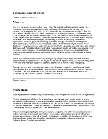 Dojrzewanie naszych dzieci czwartek, 01 kwietnia 2010 17:03 Mateusz Mój syn, Mateusz, skończy w tym roku 14 lat. Od początku ubiegłego roku zaczęły się problemy związane najprawdopodobniej z okresem dojrzewania. W okresie tym zauważyliśmy "cofanie się", jeśli chodzi o wcześniej skorygowane stereotypie i infantylne zachowania. Nasiliło się trzepotanie, machanie różnymi przedmiotami przed twarzą albo obok prawego oka, wkładanie wszystkiego do ust, wąchanie i lizanie. Ponadto pojawiły się nowe, niepokojące zachowania. Wybucha, wydawałoby się, bez przyczyny, albo z błahych powodów. Jest bardzo niespokojny, niecierpliwy, a nawet pojawiły się zachowania agresywne. Krzyczy, gdy normalny bieg wydarzeń zostaje zakłócony. Obserwujemy zamknięcie się w swojej własnej fizyczności, gdzie kilka stereotypowych ruchów może dostarczyć mu przyjemności. Leży na brzuchu i delikatnie porusza się, albo leżąc pod kocem dotyka swoich narządów płciowych (rodzaj masturbacji). Zachowania te pojawiają się, kiedy nie ma co robić. Męczące również jest ciągłe odczuwanie przez syna nieugaszalnego pragnienia, zmuszające nas do zabierania "picia" (głównie herbaty, tylko ciepłej) w każde miejsce. Zanim syn wszedł w wiek dorastania, kierując się zasłyszanymi opiniami osób trzecich, spodziewałam się problemów - ale chyba nie aż takich. Tym bardziej, że w literaturze pisano również o przypadkach cudownej poprawy zachowań, a nawet ilorazu inteligencji. Staramy się z synem pracować jak dotychczas. Pomimo, że głośno manifestował swoje niezadowolenie z pobytu w szkole, nadal uczęszcza na wybrane zajęcia (chociaż niekiedy obecność opiekuna jest konieczna). Staramy się, aby nie popadał w nudę, wtedy nie pojawiają się zachowania mające charakter masturbacji. Renata Langer Magdalena Moje wyobrażenie o okresie dojrzewania mojej córki, Magdaleny, która ma 15 lat, było różne. Przede wszystkim myślałam, że wrócą dawne zachowania, oczywiście negatywne, np. agresywne postępowanie w stosunku do dzieci, napady złości, wyginanie ciała, uciekanie i że noszenie wkładek higienicznych będzie dla niej trudne. Z tego, co wymieniłam, nic się nie sprawdziło. Natomiast pojawił się problem z odkrywaniem własnego ciała (dotykaniem). Cały czas pracuję nad tym, wypełniam czas, kiedy się nudzi. W zachowaniu jest spokojna, mniej chaotyczna, pogodna, ma jakby lepsze zrozumienie w wykonywaniu podstawowych czynności. Nie wykazuje zainteresowania płcią odmienną, chociaż uśmiecha do młodych chłopców (i młodzieży w ogóle) - chyba dlatego, że ich zna doprowadzając czasem do kłopotliwych sytuacji i zmuszając mnie do wybierania "odosobnionych" miejsc w autobusie. Innym poradziłabym mówienie dziecku jasno, często, z pokazywaniem na sobie: jakie będą zmiany, co wolno robić i gdzie to należy robić, również czego nie wolno. Zaczęłam jej to wszystko tłumaczyć, gdy zauważyłam rozwój fizyczny, a było to, gdy miała 9 lat. Na dzień dzisiejszy wszystko przebiega dosyć sprawnie. Magda nie mówi, nie wiem ile rozumie z moich pouczeń, ale efekt jest, bo potrafi sama zmienić wkładkę, umyć się, wie, że należy posprzątać za sobą i wiele innych czynności – tylko trzeba jej przypominać. Jolanta Zatorska