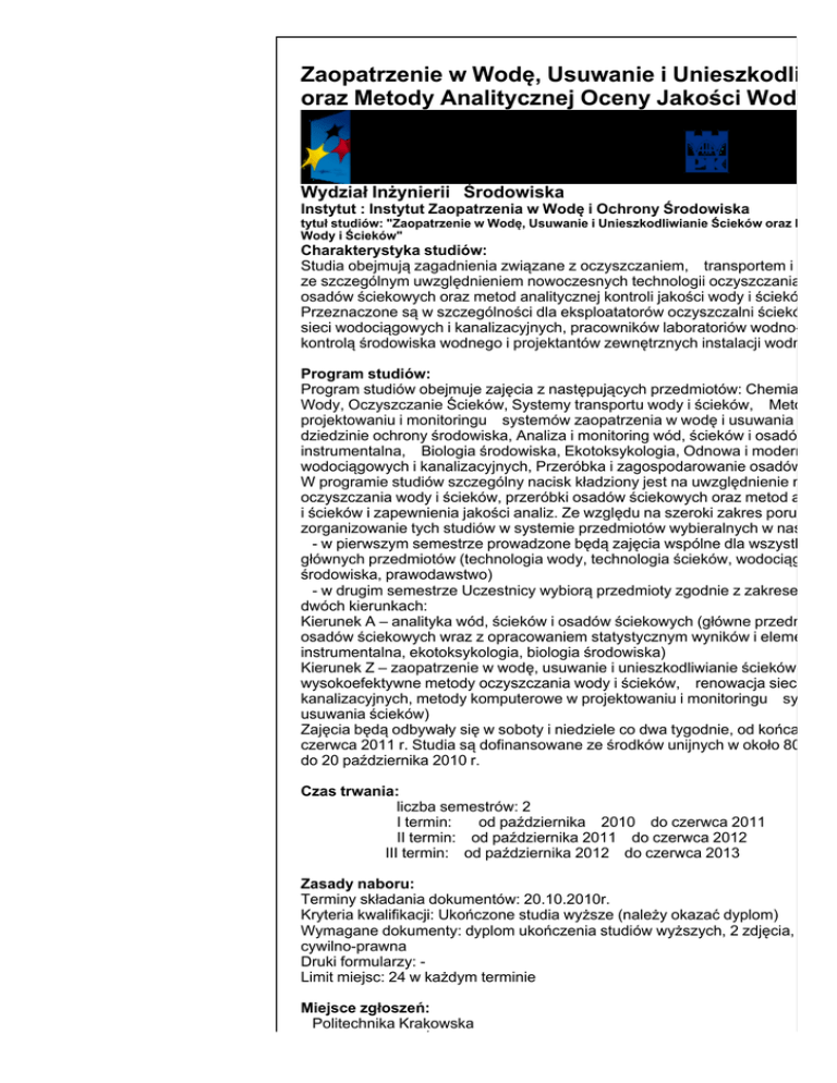 Zaopatrzenie w Wodę, Usuwanie i Unieszkodliwia oraz Metody Analitycznej Oceny Jakości Wody i Ś Wydział Inżynierii Środowiska Instytut : Instytut Zaopatrzenia w Wodę i Ochrony Środowiska tytuł studiów: "Zaopatrzenie w Wodę, Usuwanie i Unieszkodliwianie Ścieków oraz Metody Wody i Ścieków" Charakterystyka studiów: Studia obejmują zagadnienia związane z oczyszczaniem, transportem i kontro ze szczególnym uwzględnieniem nowoczesnych technologii oczyszczania wody osadów ściekowych oraz metod analitycznej kontroli jakości wody i ścieków i za Przeznaczone są w szczególności dla eksploatatorów oczyszczalni ścieków i sta sieci wodociągowych i kanalizacyjnych, pracowników laboratoriów wodno-ścieko kontrolą środowiska wodnego i projektantów zewnętrznych instalacji wodno-ście Program studiów: Program studiów obejmuje zajęcia z następujących przedmiotów: Chemia Środo Wody, Oczyszczanie Ścieków, Systemy transportu wody i ścieków, Metody ko projektowaniu i monitoringu systemów zaopatrzenia w wodę i usuwania ściekó dziedzinie ochrony środowiska, Analiza i monitoring wód, ścieków i osadów ście instrumentalna, Biologia środowiska, Ekotoksykologia, Odnowa i modernizacja wodociągowych i kanalizacyjnych, Przeróbka i zagospodarowanie osadów ściek W programie studiów szczególny nacisk kładziony jest na uwzględnienie nowoc oczyszczania wody i ścieków, przeróbki osadów ściekowych oraz metod analityc i ścieków i zapewnienia jakości analiz. Ze względu na szeroki zakres poruszany zorganizowanie tych studiów w systemie przedmiotów wybieralnych w następują - w pierwszym semestrze prowadzone będą zajęcia wspólne dla wszystkich U głównych przedmiotów (technologia wody, technologia ścieków, wodociągi i kan środowiska, prawodawstwo) - w drugim semestrze Uczestnicy wybiorą przedmioty zgodnie z zakresem swo dwóch kierunkach: Kierunek A – analityka wód, ścieków i osadów ściekowych (główne przedmioty: osadów ściekowych wraz z opracowaniem statystycznym wyników i elementam instrumentalna, ekotoksykologia, biologia środowiska) Kierunek Z – zaopatrzenie w wodę, usuwanie i unieszkodliwianie ścieków (głów wysokoefektywne metody oczyszczania wody i ścieków, renowacja sieci wodo kanalizacyjnych, metody komputerowe w projektowaniu i monitoringu systemó usuwania ścieków) Zajęcia będą odbywały się w soboty i niedziele co dwa tygodnie, od końca paźdz czerwca 2011 r. Studia są dofinansowane ze środków unijnych w około 80%. Zg do 20 października 2010 r. Czas trwania: liczba semestrów: 2 I termin: od października 2010 do czerwca 2011 II termin: od października 2011 do czerwca 2012 III termin: od października 2012 do czerwca 2013 Zasady naboru: Terminy składania dokumentów: 20.10.2010r. Kryteria kwalifikacji: Ukończone studia wyższe (należy okazać dyplom) Wymagane dokumenty: dyplom ukończenia studiów wyższych, 2 zdjęcia, po kw cywilno-prawna Druki formularzy: Limit miejsc: 24 w każdym terminie Miejsce zgłoszeń: Politechnika Krakowska Wydział Inżynierii Środowiska Politechnika Krakowska Wydział Inżynierii Środowiska Instytut Zaopatrzenia w Wodę i Ochrony Środowiska ul. Warszawska 24 31-155 Kraków tel. 12 628 28 76, fax. 12 632 87 10 Osoby przyjmujące zgłoszenia: dr inż. Przemysław Kułakowski, tel. 12 628 28 76, [email protected] mgr Agnieszka Kalfas – Fima Tel. 12 628 28 30 fax. 12 628 20 42 [email protected] Opłaty: Studia bezpłatne - współfinansowane ze środków Europejskiego Funduszu Spo Programu Operacyjnego Kapitał Ludzki. Kierownik studiów: dr inż. Przemysław Kulakowski Sekretarz studiów: mgr Agnieszka Kalfas - Fima Informacje dodatkowe: zajęcia odbywają się w soboty i niedziele co 2 tygodnie sposób zaliczenia: egzamin + praca dyplomowa studenci otrzymają materiały od prowadzących zajęcia studenci zobowiązani są podpisać umowę cywilno – prawną, zobowiązującą ich najmniej 80% godzin dydaktycznych po rygorem zwrotu kosztów studiów istnieje możliwość częściowego dofinansowania noclegów © Wydział Inżynierii Środowiska http://www.wis.pk.edu.pl/