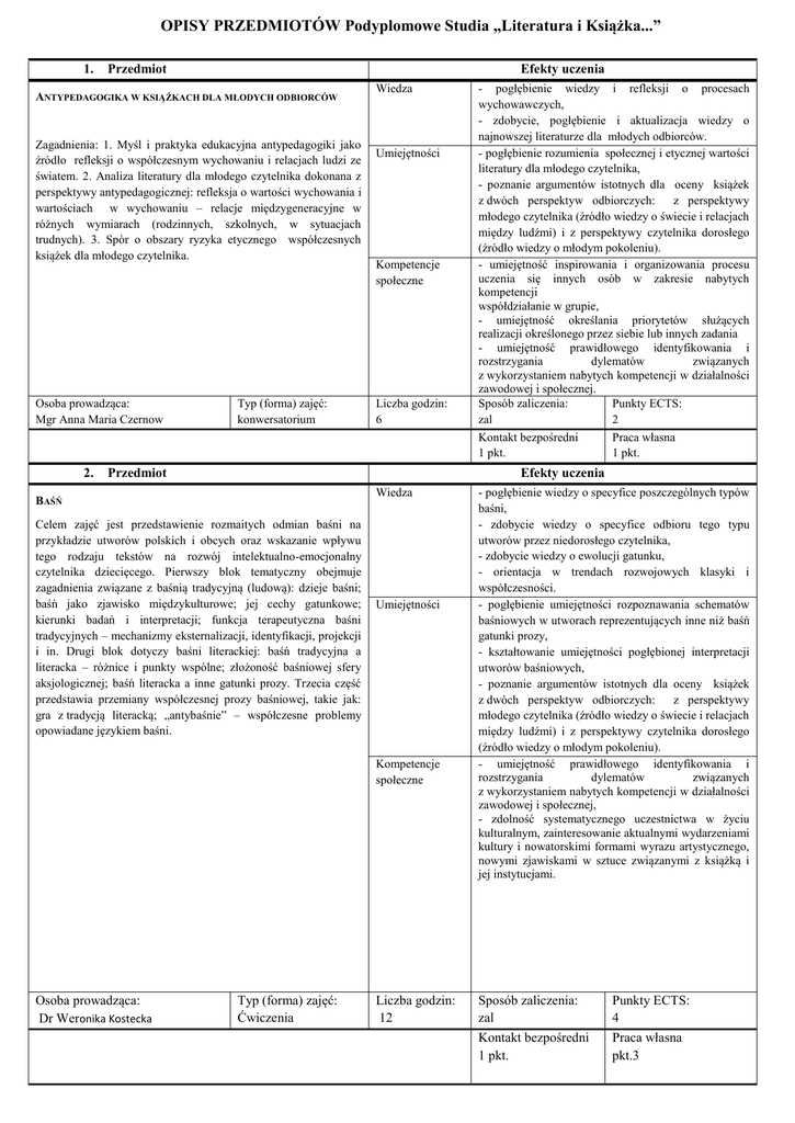 OPISY PRZEDMIOTÓW Podyplomowe Studia „Literatura i Książka...”