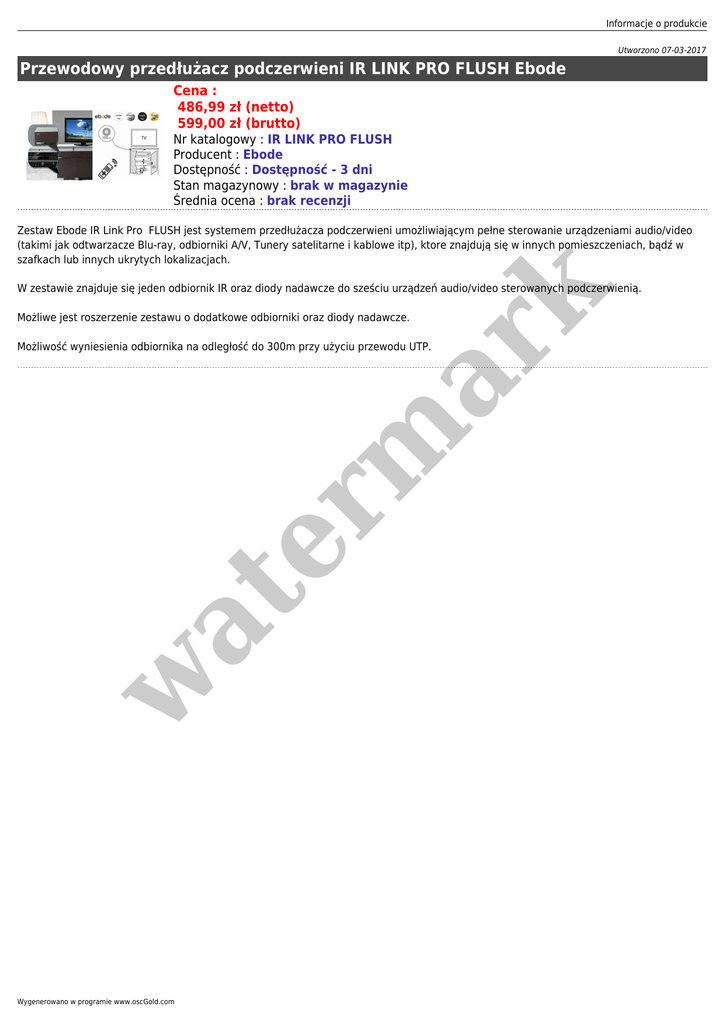 Informacje o produkcie Utworzono 07-03-2017 Przewodowy przedłużacz podczerwieni IR LINK PRO FLUSH Ebode Cena : 486,99 zł (netto) 599,00 zł (brutto) Nr katalogowy : IR LINK PRO FLUSH Producent : Ebode Dostępność : Dostępność - 3 dni Stan magazynowy : brak w magazynie Średnia ocena : brak recenzji Zestaw Ebode IR Link Pro FLUSH jest systemem przedłużacza podczerwieni umożliwiającym pełne sterowanie urządzeniami audio/video (takimi jak odtwarzacze Blu-ray, odbiorniki A/V, Tunery satelitarne i kablowe itp), ktore znajdują się w innych pomieszczeniach, bądź w szafkach lub innych ukrytych lokalizacjach. er m ar k W zestawie znajduje się jeden odbiornik IR oraz diody nadawcze do sześciu urządzeń audio/video sterowanych podczerwienią. Możliwe jest roszerzenie zestawu o dodatkowe odbiorniki oraz diody nadawcze. w at Możliwość wyniesienia odbiornika na odległość do 300m przy użyciu przewodu UTP. Wygenerowano w programie www.oscGold.com