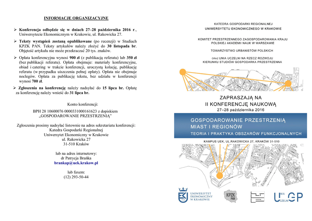 INFORMACJE ORGANIZACYJNE Konferencja odbędzie się w dniach 27–28 października 2016 r., Uniwersytecie Ekonomicznym w Krakowie, ul. Rakowicka 27. Teksty wystąpień zostaną opublikowane (po recenzji) w Studiach KPZK PAN. Teksty artykułów należy złożyć do 30 listopada br. Objętość artykułu nie może przekraczać 20 tys. znaków. Opłata konferencyjna wynosi 900 zł (z publikacją referatu) lub 350 zł (bez publikacji referatu). Opłata obejmuje: materiały konferencyjne, obiad i catering w trakcie konferencji, uroczystą kolację, publikację referatu (w przypadku uiszczenia pełnej opłaty). Opłata nie obejmuje noclegów. Opłata za publikację tekstu, bez udziału w konferencji wynosi 700 zł. Zgłoszenia na konferencję należy nadsyłać do 15 lipca br. Opłatę za konferencję należy wnieść do 31 lipca br. Konto konferencji: BPH 28 10600076 0000331000161623 z dopiskiem „GOSPODAROWANIE PRZESTRZENIĄ” Zgłoszenia prosimy nadsyłać listownie na adres sekretariatu konferencji: Katedra Gospodarki Regionalnej Uniwersytet Ekonomiczny w Krakowie ul. Rakowicka 27 31-510 Kraków lub na adres internetowy: dr Patrycja Brańka [email protected] lub faxem: (12) 293-50-44 Szanowni Państwo, Katedra Gospodarki Regionalnej Uniwersytetu Ekonomicznego w Krakowie oraz Komitet Przestrzennego Zagospodarowania Kraju Polskiej Akademii Nauk w Warszawie wraz z Towarzystwem Urbanistów Polskich oraz Unią Uczelni na Rzecz Rozwoju Kierunku Gospodarka Przestrzenna zapraszają do wzięcia udziału w ogólnopolskiej konferencji naukowej na temat: Gospodarowanie przestrzenią miast i regionów - teoria i praktyka rozwoju obszarów funkcjonalnych, która odbędzie się w Krakowie w dniach 27-28 października 2016 r. Tematyka naszych konferencji od kilku lat koncentruje się wokół problemów zagospodarowania przestrzennego w Polsce. W tym roku uwaga zostanie poświęcona w głównej mierze teorii i praktyce zarządzania obszarami funkcjonalnymi. Jedną z podstawowych przesłanek wyboru takiego tematu jest jego aktualność, wynikająca z obecnie realizowanej przez Unię Europejską polityki, gdzie szczególny nacisk jest położony na terytorialne podejście do rozwoju. Planowane dyskusje będą odbywały się w czterech głównych obszarach: 1. Rola obszarów funkcjonalnych w podnoszeniu konkurencyjności (regionów) kraju (jaka polityka i jakie narzędzia zarządzania dla wzmocnienia ich roli w rozwoju całego kraju). 2. Problemy wewnętrznej integracji obszarów funkcjonalnych (jaka polityka, jakie narzędzia zarządzania dla lepszej spójności i konkurencyjności tych obszarów). 3. Przejawy i przykłady realizacji polityki rozwoju w myśl paradygmatu terytorialnego podejścia do zarządzania rozwojem w Polsce. 4. Teoria i praktyka zarządzania obszarami funkcjonalnymi w Europie i na świecie. Osobnym tematem konferencji będą problemy jakości kształcenia kadr dla gospodarki przestrzennej w Polsce. Oprócz osób bezpośrednio zaangażowanych w proces kształcenia, w dyskusji udział wezmą praktycy – pracownicy i pracodawcy reprezentujący urzędy i instytucje zaangażowane w proces gospodarowania przestrzenią miast i regionów. Komitet organizacyjny Prof. dr hab. Tadeusz Kudłacz - Przewodniczący Dr Patrycja Brańka - Sekretarz RADA PROGRAMOWA KONFERENCJI Dr hab. prof. UAM Paweł Churski (Uniwersytet Adama Mickiewicza w Poznaniu) Prof. dr hab. Bolesław Domański (Uniwersytet Jagielloński) Prof. dr hab. Wanda Maria Gaczek (Uniwersytet Ekonomiczny w Poznaniu) Prof. dr hab. Krystian Heffner (Uniwersytet Ekonomiczny w Katowicach) Dr hab. prof. UJK Wioletta Kamińska (Uniwersytet Jana Kochanowskiego w Kielcach) Prof. dr hab. Andrzej Klasik (Uniwersytet Ekonomiczny w Katowicach) Prof. dr hab. Stanisław Korenik (Uniwersytet Ekonomiczny we Wrocławiu) Prof. dr hab. Tadeusz Kudłacz (Uniwersytet Ekonomiczny w Krakowie) Dr hab. inż. arch. prof. PG Piotr Lorens (Prezes Towarzystwa Urbanistów Polskich, Politechnika Gdańska) Prof. dr hab. Alina Maciejewska (Politechnika Warszawska) Prof. dr hab. Tadeusz Markowski (Przewodniczący Komitetu Przestrzennego Zagospodarowania Kraju PAN, Uniwersytet Łódzki) Prof. dr hab. Janusz Słodczyk (Uniwersytet Opolski) Prof. dr hab. Jacek Szlachta (Szkoła Główna Handlowa w Warszawie)