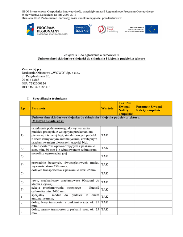 III Oś Priorytetowa: Gospodarka innowacyjność, przedsiębiorczość Regionalnego Programu Operacyjnego Województwa Łódzkiego na lata 2007-2013 Działanie III.2: Podniesienie innowacyjności i konkurencyjności przedsiębiorstw Załącznik 1 do ogłoszenia o zamówieniu Uniwersalnej składarko-sklejarki do składania i klejenia pudełek z tektury Zamawiający: Drukarnia Offsetowa „WOWO” Sp. z o.o., ul. Przędzalniana 20, 90-034 Łódź NIP: 7282500124 REGON: 473188313 I. Specyfikacja techniczna Lp 1) 2) Tak/ Nie Uwaga! Parametr Uwaga! Parametr Wartość Należy Należy uzupełnić uzupełnić Uniwersalna składarko-sklejarka do składania i klejenia pudełek z tektury. Maszyna składa się z: urządzenia podstawowego do wytwarzania pudełek prostych, z wstępnym przełamaniem pierwszej i trzeciej bigi, standardowych pudełek z dnem zamykanym automatycznie, z wstępnym przełamywaniem pierwszej i trzeciej bigi, 6 transporterów wprowadzających z paskami o szer. min. 30 mm i z wbudowanym wibratorem szczeliny wprowadzającej 3) 4) 5) 6) 7) a b c TAK TAK TAK prowadnic bocznych, dwuczęściowych (maks. TAK wysokość stosu 350 mm.), dolnych transporterów z paskami o szer. 25mm TAK lewy, mechaniczny przełamywacz 90stopni do klapki klejowej, sekcja przełamywania wstępnego – długość całkowita min. 3400 mm: specjalny moduł do pudełek z dnem automatycznym, dolny, lewy transporter z paskami o szer. ok. 25 mm, dolny, prawy transporter z paskami szer. ok. 25 mm, TAK TAK TAK TAK TAK III Oś Priorytetowa: Gospodarka innowacyjność, przedsiębiorczość Regionalnego Programu Operacyjnego Województwa Łódzkiego na lata 2007-2013 Działanie III.2: Podniesienie innowacyjności i konkurencyjności przedsiębiorstw d e f g 8) 9) 10) 11) 12) 13) 14) 15) 16) 17) 18) 19) 20) 21) 22) 23) zestaw górnych transporterów z paskami o szer. TAK ok. 25 mm i urządzeniem podnoszącym lewy przełamywacz wstępny bez pasków, z TAK wbudowanym urządzeniem dociskowym, prowadnica do powtórnego otwierania, TAK prawy przełamywacz z paskami przełamującymi TAK o szer. ok. 35 mm zawierający system pozwalający na ustawienie kąta przełamywania wstępnego moduł klejenia (dostępne szerokości ścieżki klejenia w mm – 2,3,4,5,7,10,15), moduł do pudełek z dnem automatycznym (długość całkowita min. 2500 mm.) moduł składania (długość całkowita min. 3500mm.), moduł transferu (długość całkowita min. 1400 mm.), system odbioru (długość całkowita min. 5300 mm., długość docisku min. 2800 mm., niezależny system odbioru, szerokość pasa min. 900 mm.), system elektroniczny (centralny mikroprocesor z kolorowym ekranem min. 15``, wyświetla dane referencyjne pasków, elektroniczny licznik sprzężony z pneumatycznym urządzeniem odliczania pakietów gotowych pudełek, zsynchronizowanym z szybkością maszyny), specjalne urządzenie do wstępnego przełamywania i składania, moduł do pudełek 4-punktowych (z wieczkiem i bez), urządzenie do składania okładek, kopert dolna stacja klejenia, szczelina do ustawiania wzdłużnego i poprzecznego, elektryczny wibrator stosu, urządzenie zasysające użytek, sekcja przełamywania wstępnego, moduł do pudełek z dnem automatycznym, sekcja składania, TAK TAK TAK TAK TAK TAK TAK TAK TAK TAK TAK TAK TAK TAK TAK TAK III Oś Priorytetowa: Gospodarka innowacyjność, przedsiębiorczość Regionalnego Programu Operacyjnego Województwa Łódzkiego na lata 2007-2013 Działanie III.2: Podniesienie innowacyjności i konkurencyjności przedsiębiorstw 24) 25) 26) a b c d 27) a b 28) a b c d 29) a b c d e f 30) a b urządzenia kontrolne + system klejowy TAK (wyrzutnik taśmowy, czytnik kodów, wykrywacz dolnej linii klejowej, system nakładania kleju z możliwością zapewnienia jakości – min. prędkość maszyny 450 m/min, zestaw dyszy klejowej pistoletu, system nakładania kleju, pistolet z przewodem), system plasmy z 3 dyszami. Zapotrzebowanie techniczne: minimalne ciśnienie zużycie powietrza TAK 6 bar ok. 7,5 m3/h zużycie powietrza – urządzenie do okładek i 20 m3/h kopert wyrównywacz prawy i lewy 15m3/h Wymiary sklejanych pudełek w stanie rozłożonym: Szerokość od 45 mm do 1.150 mm Wysokość do 900 mm Przetwarzane materiały: tektura lita tektura falista (pudełka proste) TAK grubość maksymalna złożonego pudełka 12 mm tektura lita 200 – 900 g/m2 tektura falista typu fala N; F; E i B (lub równoważne) grubość maksymalna złożonego TAK pudełka 12 mm Maszyna musi być przygotowana do klejenia pudełek: Normalnych, prostych pudełek TAK Pudełek z zamykanym dnem automatycznym TAK (3pkt.) Pudełek wielokomorowych TAK Pudełek czteropunktowych z lub bez pokrywy TAK Pudełek małoformatowych TAK Kopert wysyłkowych/ kopert na płyty CD TAK Pozostałe parametry Maksymalna prędkość robocza pasów min. 450 regulowana w sposób ciągły m/min co najmniej Długość całkowita maszyny 19.500 mm III Oś Priorytetowa: Gospodarka innowacyjność, przedsiębiorczość Regionalnego Programu Operacyjnego Województwa Łódzkiego na lata 2007-2013 Działanie III.2: Podniesienie innowacyjności i konkurencyjności przedsiębiorstw c szybkość początkowa d szybkość regulowana w sposób ciągły f Wymagany czas reakcji na usterkę od momentu zgłoszenia II. Kryteria wyboru - Cena netto Kryterium Cena netto UWAGA! Należy uzupełnić Cena brutto VAT - Gwarancja Kryterium UWAGA! Należy uzupełnićilość miesięcy Gwarancja (min. 12 miesięcy) III. Termin ważności oferty UWAGA! Należy uzupełnićTermin ważności oferty IV. Czas wykonania zamówienia TAK/NIE UWAGA! Należy uzupełnić Czas wykonania zamówienia(do 31.10.2014 r.) 20 m/min, 20 – 450 m/min. 12 godzin III Oś Priorytetowa: Gospodarka innowacyjność, przedsiębiorczość Regionalnego Programu Operacyjnego Województwa Łódzkiego na lata 2007-2013 Działanie III.2: Podniesienie innowacyjności i konkurencyjności przedsiębiorstw V. Warunki serwisu gwarancyjnego (pro