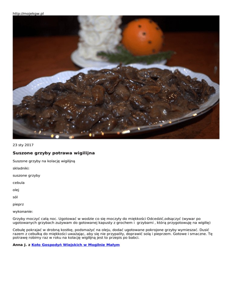 http://mojekgw.pl 23 sty 2017 Suszone grzyby potrawa wigilijna Suszone grzyby na kolację wigilijną składniki: suszone grzyby cebula olej sól pieprz wykonanie: Grzyby moczyć całą noc. Ugotować w wodzie co się moczyły do miękkości Odcedzić,odsączyć (wywar po ugotowanych grzybach zużywam do gotowanej kapusty z grochem i grzybami , którą przygotowuję na wigilię) Cebulę pokrajać w drobną kostkę, podsmażyć na oleju, dodać ugotowane pokrojone grzyby wymieszać. Dusić razem z cebulką do miękkości uważając, aby się nie przypaliły, doprawić solą i pieprzem. Gotowe i smaczne. Tę potrawę robimy raz w roku na kolację wigilijną jest to przepis po babci. Anna J. z Koło Gospodyń Wiejskich w Mogilnie Małym
