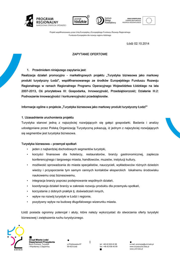 Projekt współfinansowany przez Unię Europejską z Europejskiego Funduszu Rozwoju Regionalnego Fundusze Europejskie dla rozwoju regionu łódzkiego Łódź 02.10.2014 ZAPYTANIE OFERTOWE 1. Przedmiotem niniejszego zapytania jest: Realizacja działań promocyjno - marketingowych projektu „Turystyka biznesowa jako markowy produkt turystyczny Łodzi”, współfinansowanego ze środków Europejskiego Funduszu Rozwoju Regionalnego w ramach Regionalnego Programu Operacyjnego Województwa Łódzkiego na lata 2007-2013, Oś priorytetowa III: Gospodarka, Innowacyjność, Przedsiębiorczość; Działanie III.2: Podnoszenie innowacyjności i konkurencyjności przedsiębiorstw. Informacje ogólne o projekcie „Turystyka biznesowa jako markowy produkt turystyczny Łodzi”” 1. Uzasadnienie uruchomienia projektu Turystyka stanowi jedną z najszybciej rozwijających się gałęzi gospodarki. Badania i analizy udostępniane przez Polską Organizację Turystyczną pokazują, iż jednym z najszybciej rozwijających się segmentów jest turystyka biznesowa. Turystyka biznesowa – przemysł spotkań • jeden z najbardziej dochodowych segmentów turystyki, • korzyści finansowe dla hotelarzy, restauratorów, branży gastronomicznej, zaplecza konferencyjnego i targowego miasta, handlowców, muzeów, instytucji kultury, • możliwość sprowadzania do miasta specjalistów, nauczycieli, wykładowców różnych dziedzin wiedzy i przysporzenie tym samym cennych kontaktów eksperckich lokalnemu środowisku naukowemu oraz biznesowemu, • integracja branży poprzez podejmowanie wspólnych działań, • koordynacja działań branży w zakresie rozwoju produktu dla przemysłu spotkań, • korzystanie z dobrych praktyk tj. doświadczeń innych, • wpływ na rozwój turystyki w Łodzi i regionie, • pozytywny wpływ na budowę długofalowego wizerunku miasta. Łódź posiada ogromny potencjał i atuty, które należy wykorzystać do stworzenia oferty turystyki biznesowej i zwiększenia ruchu turystycznego. Urząd Miasta Łodzi Departament Prezydenta Biuro Promocji, Turystyki i Współpracy z Zagranicą ul.Piotrkowska 87 90-423 Łódź 1 tel: +48 42 638 40 88 fax: +48 42 638 40 89 e-mail: [email protected] www.turystyczna.lodz.pl www.uml.lodz.pl Projekt współfinansowany przez Unię Europejską z Europejskiego Funduszu Rozwoju Regionalnego Fundusze Europejskie dla rozwoju regionu łódzkiego Cele projektu Wsparcie przemysłu spotkań oraz rynku jego obecnych i potencjalnych klientów, aby doprowadzić do wzrostu znaczenia gospodarczego tej branży w Łodzi. Celem działań promocyjnych w obszarze turystyki biznesowej będzie wzmocnienie zainteresowania Łodzią jako atrakcyjnym celem podróży biznesowych, a przede wszystkim jako miejsca realizacji dużych spotkań, wydarzeń korporacyjnych, kongresów i konferencji a także popularniejszym kierunkiem dla podróży motywacyjnych. Opis projektu: Przedmiot zamówienia obejmuje w szczególności: Usługę przeprowadzenia działań promocyjno-informacyjnych w Internecie w formie kampanii na temat turystyki biznesowej Łodzi oraz Łódź Convention Bureau. według poniższych wytycznych: Grupa docelowa kampanii: Projekt jest skierowany do szeroko rozumianej branży MICE obejmującej: - organizatorów kongresów i konferencji, - osoby decydujące o organizacji i lokalizacji wydarzeń biznesowych, - koncerny międzynarodowe, firmy organizujące imprezy integracyjne, - zaplecza konferencyjno – kongresowe (zarządzający obiektami, hotele), - bazę towarzyszącą (restauracje, firmy transportowe, korporacje taksówkarskie, gestorzy placówek kulturalnych, tłumacze i biura tłumaczeń, środowisko akademickie). Cele kampanii: I) przedstawienie w atrakcyjnej formie kluczowych atutów Łodzi jako doskonałego miejsca organizacji spotkań biznesowych, pobytów motywacyjnych typu incentive i team-building, konferencji, kongresów, uroczystych wieczorów i innych wydarzeń firmowych, z zaakcentowaniem dogodnej lokalizacji miasta, unikalnego otoczenia kulturowego oraz bardzo dobrej jakości bazy hotelowo-konferencyjnej i towarzyszącej, a tym samym budowanie pozytywnego wizerunku Łodzi jako docelowego miejsca spotkań i wydarzeń zawodowych i naukowych. Urząd Miasta Łodzi Departament Prezydenta Biuro Promocji, Turystyki i Współpracy z Zagranicą ul.Piotrkowska 87 90-423 Łódź 2 tel: +48 42 638 40 88 fax: +48 42 638 40 89 e-mail: [email protected] www.turystyczna.lodz.pl www.uml.lodz.pl Projekt współfinansowany przez Unię Europejską z Europejskiego Funduszu Rozwoju Regionalnego Fundusze Europejskie dla rozwoju regionu łódzkiego II) Kampania ma być dopełnieniem wirtualnych narzędzi jakimi są: serwis internetowy Łódź Convention Bureau, reklama w prasie branżowej oraz spot promocyjny w celu budowania wizerunku Łodzi jako idealnego miejsca dla organizatorów spotkań. Informacje podstawowe: Przedmiotem zamówienia są usługi przeprowadzenia działań promocyjno-informacyjnych w Internecie na temat Łodzi jako idealnej destynacji dla turystyki biznesowej: I. kampania reklamowa w Internecie, w formie bannerów, w min. 1 ogólnopolskim wertykalnym portalu branżowym oraz w min. 1 serwisie informacyjnym* posiadającym rozbudowane serwisy tematyczne, poruszające tematykę biznesową, gospodarczą, konferencyjną, hotelarską i spotkań: Portal, którego średnia miesięczna liczba realnych użytkowników w IV kwartale 2013 roku była nie mniejsza niż 14 000 000, serwis, którego średnia miesięczna liczba realnych użytkowników w IV kwartale 2013 roku była nie mniejsza niż 10 000 000, co potwierdzają badania Megapanel PBI/Gemius realizowane przez Polskie Badania Internetu Sp. z o.o. * portal i serwis internetowy nie mogą być wypełnione treściami zawierającymi znamiona taniej sensacji, o charakterze plotek towarzyskich, tekstami populistycznymi o dosadnym języku, odwołującym się do emocji, prowokacji, przekraczającym ogólnie przyjęte n