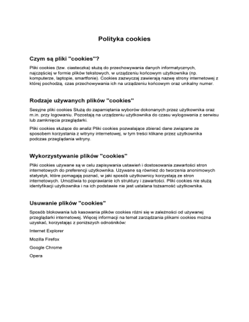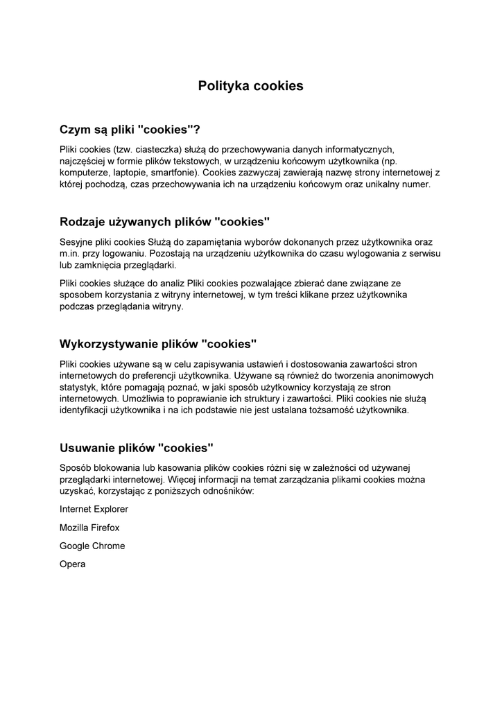 Polityka cookies Czym są pliki "cookies"? Pliki cookies (tzw. ciasteczka) służą do przechowywania danych informatycznych, najczęściej w formie plików tekstowych, w urządzeniu końcowym użytkownika (np. komputerze, laptopie, smartfonie). Cookies zazwyczaj zawierają nazwę strony internetowej z której pochodzą, czas przechowywania ich na urządzeniu końcowym oraz unikalny numer. Rodzaje używanych plików "cookies" Sesyjne pliki cookies Służą do zapamiętania wyborów dokonanych przez użytkownika oraz m.in. przy logowaniu. Pozostają na urządzeniu użytkownika do czasu wylogowania z serwisu lub zamknięcia przeglądarki. Pliki cookies służące do analiz Pliki cookies pozwalające zbierać dane związane ze sposobem korzystania z witryny internetowej, w tym treści klikane przez użytkownika podczas przeglądania witryny. Wykorzystywanie plików "cookies" Pliki cookies używane są w celu zapisywania ustawień i dostosowania zawartości stron internetowych do preferencji użytkownika. Używane są również do tworzenia anonimowych statystyk, które pomagają poznać, w jaki sposób użytkownicy korzystają ze stron internetowych. Umożliwia to poprawianie ich struktury i zawartości. Pliki cookies nie służą identyfikacji użytkownika i na ich podstawie nie jest ustalana tożsamość użytkownika. Usuwanie plików "cookies" Sposób blokowania lub kasowania plików cookies różni się w zależności od używanej przeglądarki internetowej. Więcej informacji na temat zarządzania plikami cookies można uzyskać, korzystając z poniższych odnośników: Internet Explorer Mozilla Firefox Google Chrome Opera