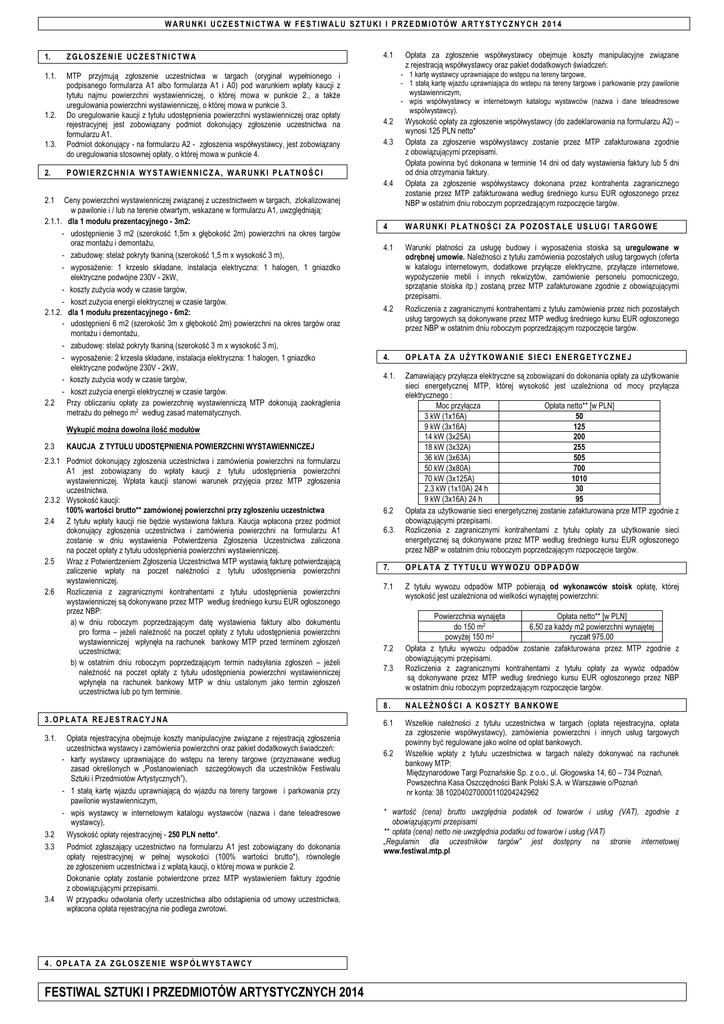 WARUNKI UCZESTNICTWA W FESTIWALU SZTUKI I PRZEDMIOTÓW ARTYSTYCZNYCH 2014 1. ZGŁOSZENIE UCZESTNICTWA 1.1. MTP przyjmują zgłoszenie uczestnictwa w targach (oryginał wypełnionego i podpisanego formularza A1 albo formularza A1 i A0) pod warunkiem wpłaty kaucji z tytułu najmu powierzchni wystawienniczej, o której mowa w punkcie 2., a takŜe uregulowania powierzchni wystawienniczej, o której mowa w punkcie 3. Do uregulowanie kaucji z tytułu udostępnienia powierzchni wystawienniczej oraz opłaty rejestracyjnej jest zobowiązany podmiot dokonujący zgłoszenie uczestnictwa na formularzu A1. Podmiot dokonujący - na formularzu A2 - zgłoszenia współwystawcy, jest zobowiązany do uregulowania stosownej opłaty, o której mowa w punkcie 4. 1.2. 1.3. 2. 4.1 - 1 kartę wystawcy uprawniające do wstępu na tereny targowe, - 1 stałą kartę wjazdu uprawniająca do wstepu na tereny targowe i parkowanie przy pawilonie wystawienniczym, - wpis współwystawcy w internetowym katalogu wystawców (nazwa i dane teleadresowe wspólwystawcy). 4.2 4.3 POWIERZCHNIA WYSTAWIENNICZA, WARUNKI PŁATNOŚCI 4.4 Ceny powierzchni wystawienniczej związanej z uczestnictwem w targach, zlokalizowanej w pawilonie i / lub na terenie otwartym, wskazane w formularzu A1, uwzględniają: 2.1.1. dla 1 modułu prezentacyjnego - 3m2: - udostępnienie 3 m2 (szerokość 1,5m x głębokość 2m) powierzchni na okres targów oraz montaŜu i demontaŜu, - zabudowę: stelaŜ pokryty tkaniną (szerokość 1,5 m x wysokość 3 m), - wyposaŜenie: 1 krzesło składane, instalacja elektryczna: 1 halogen, 1 gniazdko elektryczne podwójne 230V - 2kW, - koszty zuŜycia wody w czasie targów, - koszt zuŜycia energii elektrycznej w czasie targów. 2.1.2. dla 1 modułu prezentacyjnego - 6m2: - udostępnieni 6 m2 (szerokość 3m x głębokość 2m) powierzchni na okres targów oraz montaŜu i demontaŜu, - zabudowę: stelaŜ pokryty tkaniną (szerokość 3 m x wysokość 3 m), - wyposaŜenie: 2 krzesła składane, instalacja elektryczna: 1 halogen, 1 gniazdko elektryczne podwójne 230V - 2kW, - koszty zuŜycia wody w czasie targów, - koszt zuŜycia energii elektrycznej w czasie targów. 2.2 Przy obliczaniu opłaty za powierzchnię wystawienniczą MTP dokonują zaokrąglenia metraŜu do pełnego m2 według zasad matematycznych. 2.1 2.3 WARUNKI PŁATNOŚCI ZA POZOSTAŁE USŁUGI TARGOWE 4.1 Warunki płatności za usługę budowy i wyposaŜenia stoiska są uregulowane w odrębnej umowie. NaleŜności z tytułu zamówienia pozostałych usług targowych (oferta w katalogu internetowym, dodatkowe przyłącze elektryczne, przyłącze internetowe, wypoŜyczenie mebli i innych rekwizytów, zamówienie personelu pomocniczego, sprzątanie stoiska itp.) zostaną przez MTP zafakturowane zgodnie z obowiązującymi przepisami. Rozliczenia z zagranicznymi kontrahentami z tytułu zamówienia przez nich pozostałych usług targowych są dokonywane przez MTP według średniego kursu EUR ogłoszonego przez NBP w ostatnim dniu roboczym poprzedzającym rozpoczęcie targów. 4.2 4. OPŁATA ZA UśYTKOWANIE SIECI ENERGETYCZNEJ 4.1. Zamawiający przyłącza elektryczne są zobowiązani do dokonania opłaty za uŜytkowanie sieci energetycznej MTP, której wysokość jest uzaleŜniona od mocy przyłącza elektrycznego : Moc przyłącza Opłata netto** [w PLN] 3 kW (1x16A) 50 9 kW (3x16A) 125 14 kW (3x25A) 200 18 kW (3x32A) 255 36 kW (3x63A) 505 50 kW (3x80A) 700 70 kW (3x125A) 1010 2,3 kW (1x10A) 24 h 30 9 kW (3x16A) 24 h 95 Opłata za uŜytkowanie sieci energetycznej zostanie zafakturowana prze MTP zgodnie z obowiązującymi przepisami. Rozliczenia z zagranicznymi kontrahentami z tytułu opłaty za uŜytkowanie sieci energetycznej są dokonywane przez MTP według średniego kursu EUR ogłoszonego przez NBP w ostatnim dniu roboczym poprzedzającym rozpoczęcie targów. KAUCJA Z TYTUŁU UDOSTĘPNIENIA POWIERZCHNI WYSTAWIENNICZEJ 3.OPŁATA REJESTRACYJNA Opłata rejestracyjna obejmuje koszty manipulacyjne związane z rejestracją zgłoszenia uczestnictwa wystawcy i zamówienia powierzchni oraz pakiet dodatkowych świadczeń: - karty wystawcy uprawniające do wstępu na tereny targowe (przyznawane według zasad określonych w „Postanowieniach szczegółowych dla uczestników Festiwalu Sztuki i Przedmiotów Artystycznych”), - 1 stałą kartę wjazdu uprawniającą do wjazdu na tereny targowe i parkowania przy pawilonie wystawienniczym, - wpis wystawcy w internetowym katalogu wystawców (nazwa i dane teleadresowe wystawcy), 3.2 Wysokość opłaty rejestracyjnej - 250 PLN netto*. 3.3 Podmiot zgłaszający uczestnictwo na formularzu A1 jest zobowiązany do dokonania opłaty rejestracyjnej w pełnej wysokości (100% wartości brutto*), równolegle ze zgłoszeniem uczestnictwa i z wpłatą kaucji, o której mowa w punkcie 2. Dokonanie opłaty zostanie potwierdzone przez MTP wystawieniem faktury zgodnie z obowiązującymi przepisami. 3.4 W przypadku odwołania oferty uczestnictwa albo odstąpienia od umowy uczestnictwa, wpłacona opłata rejestracyjna nie podlega zwrotowi. 6.2 6.3. 7. OPŁATA Z TYTUŁU WYWOZU ODPADÓW 7.1 Z tytułu wywozu odpadów MTP pobierają od wykonawców stoisk opłatę, której wysokość jest uzaleŜniona od wielkości wynajętej powierzchni: 7.2 7.3 FESTIWAL SZTUKI I PRZEDMIOTÓW ARTYSTYCZNYCH 2014 Powierzchnia wynajęta Opłata netto** [w PLN] do 150 m2 6,50 za kaŜdy m2 powierzchni wynajętej powyŜej 150 m2 ryczałt 975,00 Opłata z tytułu wywozu odpadów zostanie zafakturowana przez MTP zgodnie z obowiązującymi przepisami. Rozliczenia z zagranicznymi kontrahentami z tytułu opłaty za wywóz odpadów są dokonywane przez MTP według średniego kursu EUR ogłoszonego przez NBP w ostatnim dniu roboczym poprzedzającym rozpoczęcie targów. 8. NALEśNOŚCI A KOSZTY BANKOWE 6.1 Wszelkie naleŜności z tytułu uczestnictwa w targach (opłata rejestracyjna, opłata za zgłoszenie współwystawcy), zamówienia powierzchni i innych usług targow