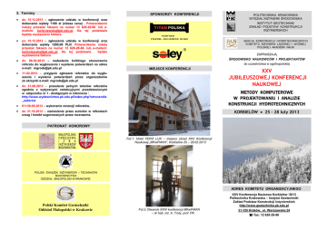 3. Terminy SPONSORZY KONFERENCJI do 15.12.2012 – zgłoszenie udziału w konferencji oraz dokonanie wpłaty 1100 zł (niższa cena) . Potwierdzenie należy przesłać faksem na numer 12 628-28-66 lub emailem: [email protected]. Na tej podstawie będzie wystawiona faktura. ZPKI- PK po 15.12.2012 – zgłoszenie udziału w konferencji oraz dokonanie wpłaty 1200,00 PLN. Potwierdzenie należy przesłać faksem na numer 12 628-28-66 lub e-mailem: będzie [email protected]. Na tej podstawie wystawiona faktura. do 08.02.2013 – nadesłanie krótkiego streszczenia referatu do wygłoszenia i wysłanie potwierdzeń na adres e-mail: [email protected] 11.02.2013 – przyjęcie zgłoszeń referatów do wygłoszenia i wysłanie potwierdzeń przez organizatorów ze skrzynki e-mail: [email protected] do 31.08.2013 – przesłanie pełnych tekstów referatów zgodnie z wytycznymi redakcyjnymi przedstawionymi w załączniku nr 1 - dostępnymi w internecie : http://www.wydawnictwo.pk.edu.pl/index.php?strona=dla _autorow 01÷30.09.2013 – wykonanie recenzji referatów, do 31.10.2013 – naniesienie przez autorów w referatach uwag i korekt sugerowanych przez recenzenta. POLITECHNIKA KRAKOWSKA WYDZIAŁ INŻYNIERII ŚRODOWISKA INSTYTUT GEOTECHNIKI ZAKŁAD PODSTAW KONSTRUKCJI INŻYNIERSKICH SEKCJA KONSTRUKCJI HYDROTECHNICZNYCH KOMITETU INŻYNIERII LĄDOWEJ i WODNEJ POLSKIEJ AKADEMII NAUK ZAPRASZAJĄ ŚRODOWISKO NAUKOWCÓW I PROJEKTANTÓW do uczestnictwa w ogólnopolskiej MIEJSCE KONFERENCJI XXV JUBILEUSZOWEJ KONFERENCJI NAUKOWEJ METODY KOMPUTEROWE W PROJEKTOWANIU I ANALIZIE KONSTRUKCJI HYDROTECHNICZNYCH KORBIELÓW 25 - 28 luty 2013 PATRONAT HONOROWY Fot.1. Hotel FERO LUX – miejsce obrad XXV Konferencji Naukowej „MKwPiAKH”, Korbielów 25 – 28.02.2013 POLSKI ZWIĄZEK INŻYNIERÓW i TECHNIKÓW BUDOWNICTWA ODDZIAŁ MAŁOPOLSKI W KRAKOWIE ADRES KOMITETU ORGANIZACYJNEGO Polski Komitet Geotechniki Oddział Małopolski w Krakowie XXV Konferencja Naukowa Korbielów 2013 Politechnika Krakowska – Instytut Geotechniki Zakład Podstaw Konstrukcji Inżynierskich http://www.geotechnika.pk.edu.pl Fot.2. Otwarcie XXIV konferencji MKwPiAKH – dr hab. inż. A. Truty, prof. PK. 31-155 Kraków, ul. Warszawska 24 / fax: 12 628-28-66 [email protected] TEMATYKA I CEL KONFERENCJI Tematyka konferencji obejmuje całokształt zagadnień związanych ze współczesnymi metodami projektowania i analizy ziemnych, betonowych i żelbetowych konstrukcji inżynierskich, w szczególności hydrotechnicznych, oraz inne zagadnienia szeroko pojętej mechaniki konstrukcji inżynierskich. Celem konferencji jest przedstawienie aktualnych osiągnięć naukowo-badawczych oraz wymiana informacji – pomiędzy uczestnikami konferencji wywodzącymi się ze środowisk naukowych, projektanckich oraz wykonawczych – dotyczących najnowszych trendów rozwoju myśli naukowej w dziedzinie komputerowo wspomaganych metod projektowania. Cechą konferencji jest jej szeroki zakres tematyczny obejmujący geotechnikę, hydrotechnikę, a także teorię i praktykę projektowania konstrukcji inżynierskich. INFORMACJE ORGANIZACYJNE 1. Miejsce i czas trwania konferencji Konferencja odbędzie się w Korbielowie w Hotelu FERO-LUX, (ul.Szczyrbok 62, tel.fax: 33 863-60-23/24, www.ferosystem.pl kameralny, luksusowy obiekt usytuowany bezpośrednio przy wyciągach narciarskich GAT, monitorowany parking samochodowy) w dniach od 25 do 28 lutego 2013 roku (od poniedziałku do czwartku). W hotelu znajdują się: kawiarnia z kominkiem 24h, kryty basen 5 x 10 m, sauna, jacuzzi, gabinet odnowy biologicznej (płatność indywidualna poza kosztami konferencji), sala bilardowa, a obok ośrodka na stokach Pilska są atrakcyjne trasy zjazdowe dla narciarzy. Przyjazd do Korbielowa 25.02.2013 r. o godz.14:00, wyjazd 28.02.2013 r. o godz.14:00 (po obiedzie). Sekretariat Konferencji - recepcja Hotelu FERO-LUX (od 25.02.2013 r. do 28.02.2013 r.). 2. Zakwaterowanie, koszty uczestnictwa, terminy opłat Przyjęto jednakowe ogólne koszty udziału w konferencji dla uczestników i osób towarzyszących: zakwaterowanie w Hotelu FERO-LUX z pełnym wyżywieniem, basenem oraz kosztami organizacyjnymi ustalono na : 1100,00 PLN – w przypadku płatności do 15.12.2012 r. 1200,00 PLN – w przypadku płatności po 15.12.2012 r. Uwaga: Organizatorzy nie zwracają kosztów uczestnictwa w przypadku nieprzybycia na konferencję lub skrócenia pobytu. Opłaty konferencyjnej należy dokonać na konto bankowe Politechniki Krakowskiej z wyszczególnieniem imienia i nazwiska uczestnika oraz instytucji delegującej : Nr konta: 11 1060 0076 0000 3210 0013 7340 (z dopiskiem) – „Konferencja KORBIELÓW-2013” oraz przesłać potwierdzenie faksem: 12 628-28-66 lub e-mailem: [email protected], na podstawie którego będzie wystawiona faktura. Dojazd do Korbielowa we własnym zakresie. KOMITET HONOROWY Prof. dr hab. inż. Kazimierz FURTAK Rektor Politechniki Krakowskiej Prof. zw. dr hab. inż. Maciej GRYCZMAŃSKI Politechnika Śląska Prof. dr hab. inż. Wojciech RADOMSKI Przewodniczący Komitetu Inżynierii Lądowej i Wodnej PAN IV Wydziału Nauk Technicznych Prof. dr hab. inż. Andrzej SAWICKI Instytut Budownictwa Wodnego PAN – Gdańsk Prof. dr hab. inż. Jan SZARLIŃSKI Politechnika Krakowska Prof. dr hab. inż. Antoni TAJDUŚ Rektor Akademii Górniczo-Hutniczej Fot.3. Pokoje dwuosobowe w hotelu FERO LUX. Prof. zw. dr hab. inż. Wojciech WOLSKI GEOTEKO Warszawa KOMITET NAUKOWY I ORGANIZACYJNY Przewodniczący Dr hab. inż. Andrzej TRUTY, prof. PK Politechnika Krakowska Sekretarz Dr inż. Michał GRODECKI Politechnika Krakowska Członkowie Prof. dr hab. inż. Zbigniew KLEDYŃSKI Politechnika Warszawska Dr hab. inż. Jan GASZYŃSKI, prof. PK Politechnika Krakowska Fot.4. Basen w hotelu FERO LUX. Dr hab. inż. Jerzy PAMIN, prof. PK Politechnika Krakowska Dr hab. inż. Aleksander URBAŃSKI, prof. PK Politechnika Krakowska Dr hab. inż. Piotr WITAKOWSKI, prof. AGH Instytut Techniki Budowlanej – Warszawa 