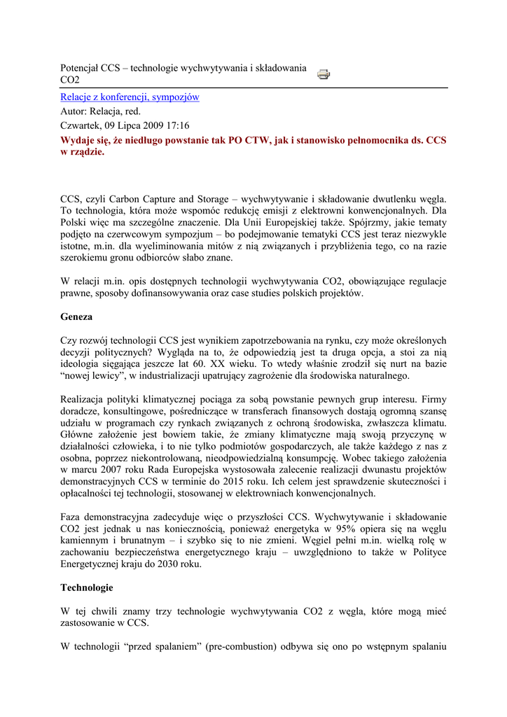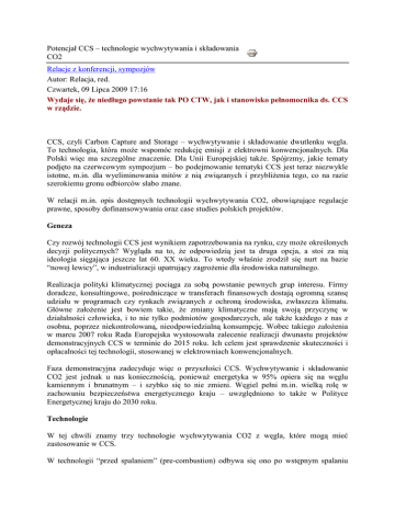 Potencjał CCS – technologie wychwytywania i składowania CO2 Relacje z konferencji, sympozjów Autor: Relacja, red. Czwartek, 09 Lipca 2009 17:16 Wydaje się, Ŝe niedługo powstanie tak PO CTW, jak i stanowisko pełnomocnika ds. CCS w rządzie. CCS, czyli Carbon Capture and Storage – wychwytywanie i składowanie dwutlenku węgla. To technologia, która moŜe wspomóc redukcję emisji z elektrowni konwencjonalnych. Dla Polski więc ma szczególne znaczenie. Dla Unii Europejskiej takŜe. Spójrzmy, jakie tematy podjęto na czerwcowym sympozjum – bo podejmowanie tematyki CCS jest teraz niezwykle istotne, m.in. dla wyeliminowania mitów z nią związanych i przybliŜenia tego, co na razie szerokiemu gronu odbiorców słabo znane. W relacji m.in. opis dostępnych technologii wychwytywania CO2, obowiązujące regulacje prawne, sposoby dofinansowywania oraz case studies polskich projektów. Geneza Czy rozwój technologii CCS jest wynikiem zapotrzebowania na rynku, czy moŜe określonych decyzji politycznych? Wygląda na to, Ŝe odpowiedzią jest ta druga opcja, a stoi za nią ideologia sięgająca jeszcze lat 60. XX wieku. To wtedy właśnie zrodził się nurt na bazie “nowej lewicy”, w industrializacji upatrujący zagroŜenie dla środowiska naturalnego. Realizacja polityki klimatycznej pociąga za sobą powstanie pewnych grup interesu. Firmy doradcze, konsultingowe, pośredniczące w transferach finansowych dostają ogromną szansę udziału w programach czy rynkach związanych z ochroną środowiska, zwłaszcza klimatu. Główne załoŜenie jest bowiem takie, Ŝe zmiany klimatyczne mają swoją przyczynę w działalności człowieka, i to nie tylko podmiotów gospodarczych, ale takŜe kaŜdego z nas z osobna, poprzez niekontrolowaną, nieodpowiedzialną konsumpcję. Wobec takiego załoŜenia w marcu 2007 roku Rada Europejska wystosowała zalecenie realizacji dwunastu projektów demonstracyjnych CCS w terminie do 2015 roku. Ich celem jest sprawdzenie skuteczności i opłacalności tej technologii, stosowanej w elektrowniach konwencjonalnych. Faza demonstracyjna zadecyduje więc o przyszłości CCS. Wychwytywanie i składowanie CO2 jest jednak u nas koniecznością, poniewaŜ energetyka w 95% opiera się na węglu kamiennym i brunatnym – i szybko się to nie zmieni. Węgiel pełni m.in. wielką rolę w zachowaniu bezpieczeństwa energetycznego kraju – uwzględniono to takŜe w Polityce Energetycznej kraju do 2030 roku. Technologie W tej chwili znamy trzy technologie wychwytywania CO2 z węgla, które mogą mieć zastosowanie w CCS. W technologii “przed spalaniem” (pre-combustion) odbywa się ono po wstępnym spalaniu węgla (zgazowaniu) – powstaje wtedy tlenek węgla i wodór. Z tej mieszaniny, tzw. gazu syntezowego, uzyskuje się wiele innych produktów. Jednym z nich jest metanol, uŜywany do produkcji tworzyw sztucznych, diesla, czy benzyny i LPG. “Magazynowanie” CO2 w metanolu zwane jest sekwestracją chemiczną. To bardzo efektywny proces, poniewaŜ oprócz tego, Ŝe odbiera się dwutlenek węgla, to przekształca go do produktu o tak szerokich moŜliwościach zastosowania (obydwa zabiegi następują po konwersji CO do CO2). Technologia “po spalaniu” (post-combustion) wykorzystuje aminy do wychwycenia CO2 (i jest o wiele droŜsza niŜ pre-combustion), a spalanie w tlenie – oksy-spalanie – łatwiejsze wydzielenie dwutlenku węgla z mieszaniny gazów spalinowych po usunięciu azotu z powietrza, w którym odbywa się utlenianie. W dwóch ostatnich wariantach, a takŜe częściowo w pierwszym, CO2 jest transportowany i składowany w strukturach geologicznych. Obecnie bada się wiele innych moŜliwości magazynowania, np. w biopaliwach i procesie sztucznej fotosyntezy. Zgazowanie węgla jest w zasadzie takŜe osobną czystą technologią węglową. MoŜe być stosowane w zintegrowaniu z blokiem gazowo-parowym w technologii IGCC. W polskich warunkach (w tej chwili) jest najbardziej opłacalne, a przymierzają się do niego np. Zakłady Azotowe “Puławy” S.A. Podziemne zgazowanie węgla wydaje się na razie zbyt niebezpieczne i drogie, naukowcy opracowują natomiast ogniwa paliwowe z wykorzystaniem CO2 oraz synergię węglowojądrową. Ta ostatnia czysta technologia jest szczególnie interesująca, poniewaŜ miałaby zastosowanie w reaktorach wysokotemperaturowych, w których w temperaturze 900ºC zachodzi rozdział wody na wodór i tlen, z których to produktów kaŜdy mógłby uczestniczyć w dalszych reakcjach (tlen w oksy-spalaniu, wodór w produkcji syn-gazu). Badania wskazują, Ŝe odległość do składowiska jest kryterium opłacalności transportu dwutlenku węgla gazociągami. Wartość graniczna to 4000 km. Na większą odległość bardziej opłaca się go transportować w postaci skroplonej drogą morską. NaleŜy podkreślić, Ŝe najwaŜniejsze technologie, które mogą być składowymi CCS są na świecie od pewnego czasu znane i stosowane. Dotyczy to przede wszystkim zgazowania węgla oraz geologicznego magazynowania CO2 (np. złoŜe Sleipner na Morzu Północnym). Dopiero niedawno zaczęliśmy myśleć o ich zintegrowaniu. Jedynym realnym zagroŜeniem płynącym z geologicznej sekwestracji dwutlenku węgla jest zakwaszenie wód słodkich – bardziej bąbelkowa woda. Nie ma mowy o gejzerach. Prawo CCS traktowane jest jako “technologia pomostowa”, co znaczy, Ŝe nie uznaje się jej od razu jako doskonałej. Ma swoje miejsce w Pakiecie Energetyczno-Klimatycznym, jednak teraz najwięcej emocji budzi Dyrektywa w sprawie geologicznego składowania CO2 (2009/31/WE). Weszła ona w Ŝycie 25 czerwca 2009 roku i określa czas na transpozycję do 25 czerwca 2011 roku. Ma zastosowanie jedynie do geologicznego składowania na terenie państw członkowskich z moŜliwością połączenia z eksploatacją złóŜ węglowodorów, co prowadzi do intensyfikacji ich wydobycia (EHR – ten sposób zatłaczania daje Polsce wielką szansę). W Załączniku I 