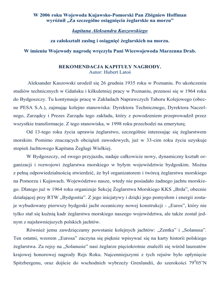 W 2006 roku Wojewoda Kujawsko-Pomorski Pan Zbigniew Hoffman wyróżnił „Za szczególne osiągnięcia żeglarskie na morzu” kapitana Aleksandra Kaszowskiego za całokształt zasług i osiągnięć żeglarskich na morzu. W imieniu Wojewody nagrodę wręczyła Pani Wicewojewoda Marzenna Drab. REKOMENDACJA KAPITUŁY NAGRODY. Autor: Hubert Latoś Aleksander Kaszowski urodził się 26 grudnia 1935 roku w Poznaniu. Po ukończeniu studiów technicznych w Gdańsku i kilkuletniej pracy w Poznaniu, przenosi się w 1964 roku do Bydgoszczy. Tu kontynuuje pracę w Zakładach Naprawczych Taboru Kolejowego (obecne PESA S.A.), zajmując kolejno stanowiska: Dyrektora Technicznego, Dyrektora Naczelnego, Zarządcy i Prezes Zarządu tego zakładu, który z powodzeniem przeprowadził przez wszystkie transformacje. Z tego stanowiska, w 1998 roku przechodzi na emeryturę. Od 13-tego roku życia uprawia żeglarstwo, szczególnie interesując się żeglarstwem morskim. Pomimo znaczących obciążeń zawodowych, już w 33-cim roku życia uzyskuje stopień Jachtowego Kapitana Żeglugi Wielkiej. W Bydgoszczy, od swego przyjazdu, nadaje całkowicie nowy, dynamiczny kształt organizacji i rozwojowi żeglarstwa morskiego w byłym województwie bydgoskim. Można z pełną odpowiedzialnością stwierdzić, że był organizatorem i twórcą żeglarstwa morskiego na Pomorzu i Kujawach. Województwo nasze, wtedy nie posiadało żadnego jachtu morskiego. Dlatego już w 1964 roku organizuje Sekcję Żeglarstwa Morskiego KKS „Brda”, obecnie działającej przy RTW „Bydgostia”. Z jego inicjatywy i dzięki jego pomysłom i energii zostaje wybudowany pierwszy bydgoski jacht oceaniczny nowej konstrukcji - „Euros”, który nie tylko stał się kuźnią kadr żeglarstwa morskiego naszego województwa, ale także został jednym z najsławniejszych polskich jachtów. Również jemu zawdzięczamy powstanie kolejnych jachtów: „Zentka” i „Solanusa”. Ten ostatni, wzorem „Eurosa” zaczyna się pięknie wpisywać się na karty historii polskiego żeglarstwa. Za rejsy na „Solanusie” nasi żeglarze pięciokrotnie znaleźli się wśród laureatów krajowej honorowej nagrody Rejs Roku. Najcenniejszymi z tych rejsów było opłynięcie Spitzbergenu, oraz dojście do wschodnich wybrzeży Grenlandii, do szerokości 79 005’N i długości 14056’W, z kapitanem Bronisławem Radlińskim, także wychowankiem kapitana Kaszowskiego. Dzięki jachtom oraz organizowanym szkoleniom i egzaminom na stopień sternika morskiego, wyprowadził na morze setki żeglarzy i wielu pomorskich kapitanów. Wkład w rozwój żeglarstwa morskiego w naszym województwie uzasadnia, aby nazywać Go wśród nas - „Kapitanem Kapitanów”. Kapitan Aleksander Kaszowski był nie tylko był organizatorem, ale także wybitnym sportowcem, uczestnikiem wielu rejsów wpisanych na stałe do historii żeglarstwa polskiego. - W roku 1968 był I oficerem na „Eurosie”, który pod Wojciechem Orszulokiem po raz pierwszy w historii żeglarstwa światowego opłynął Islandię. - W roku 1970 poprowadził „Eurosa” przez cieśninę Pentland Firth. Przejście pod żaglami, bez silnika, w czasie prądu syzygijnego było prawdopodobnie również pierwsze w historii światowego żeglarstwa. - W roku 1971 w samotnym rejsie, na „Eurosie” bez samosteru i silnika, dwukrotnie przeszedł Cieśniny Duńskie. Ten wyczyn nigdy nie został powtórzony. - W roku 1973 poprowadził „Eurosa wokół Przylądka Horn. Mimo dwóch tygodni ciężkich sztormów była to próba udana i 25-ta w ciągu całej historii żeglarstwa światowego. - W roku 1977 poprowadził „Eurosa” na Spitsbergen. Na tym arktycznym archipelagu „Euros” był trzecim polskim jachtem. Za osobiste osiągnięcia sportowe wyróżniono go dwukrotnie, Medalem „Za wybitne osiągnięcia sportowe”, trzykrotnie nagrodami „Rejs Roku” i jednym wyróżnieniem tej nagrody. Jest jednym z założycieli Bractwa Kaphornowców (dyplom nr 2), skupiające tych żeglarzy, którzy pod żaglami opłynęli Przylądek Horn w Południowej Ameryce. W ciągu dwóch kadencji był Grotmasztem tego Bractwa, oraz od 2003 roku jest jedynym polskim żeglarzem Członkiem Honorowym Międzynarodowego Stowarzyszenia Kaphornowców: Hon. Member International Association of Cape Horners. Kapitan Aleksander Kaszowski dwukrotnie został laureatem nagrody imienia Leonia Teligi za najlepszy utwór literacki propagujący żeglarstwo. Wspólnie ze Zbigniewem Urbanyim napisał: „Eurosem na Horn”, „Sztormy, lody i powroty” i „Polskie jachty na oceanach”. Sam zaś jest autorem „Kaphornowej Siódemki”, „Kanaki z trzeciej wachty” i „Nawigacji dla żeglarzy”. Książki te ukazały się w nakładzie ponad 250 000 egzemplarzy. Obdarzono Go wieloma funkcjami honorowymi. Takimi jak: - Honorowym członkiem „International Association of Cape Hornes”, - Honorowym członkiem Bydgoskiego Okręgowego Związku Żeglarskiego, - Honorowym członkiem RTW Bydgostia Kabel - Honorowym Komandorem Sekcji Żeglarskiej RTW Bydgostia Kabel Spis ważniejszych odznaczeń i wyróżnień obejmuje 41 pozycji, z których najważniejsze to Krzyże: Oficerski i Kawalerskie Orderu Odrodzenia Polski, Złoty i Srebrny Krzyżem Zasługi, Zasłużony Kolejarz - oraz wiele innych odznaczeń państwowych, resortowych i sportowych. Z odznaczeń regionalnych wymienić należy: - Odznakę Honorową „Za Szczególne Zasługi dla Rozwoju Województwa Bydgoskiego” - „Medal Prezydenta Miasta Bydgoszczy” - Odznaka Honorowa „Bydgoszcz Zasłużonemu Obywatelowi” W 2002 roku, na zebraniu założycielskim „Kujawsko – Pomorskiego Kolegium Kapitanów Jachtowych”, w uznaniu zasług i osiągnięć, kapitanowi Kaszowskiemu powierzono godność Kapitana Seniora. W tym roku, kolegium to, na dorocznym zebraniu w maju postanowiło wysunąć Go do nagrody Wojewody Kujawsko-Pomorskiego „ Za wybitne osiągnięcia żeglarskie na morzu” za całoksz