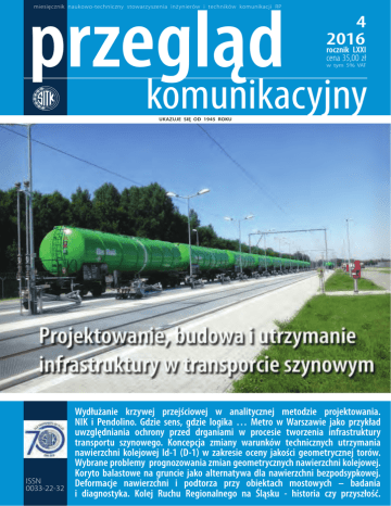 przegląd miesięcznik naukowo-techniczny stowarzyszenia inżynierów i techników komunikacji RP 4 2016 rocznik LXXI cena 35,00 zł w tym 5% VAT komunikacyjny UKAZUJE SIĘ OD 1945 ROKU ISSN 0033-22-32 Wydłużanie krzywej przejściowej w analitycznej metodzie projektowania. NIK i Pendolino. Gdzie sens, gdzie logika … Metro w Warszawie jako przykład uwzględniania ochrony przed drganiami w procesie tworzenia infrastruktury transportu szynowego. Koncepcja zmiany warunków technicznych utrzymania nawierzchni kolejowej Id-1 (D-1) w zakresie oceny jakości geometrycznej torów. Wybrane problemy prognozowania zmian geometrycznych nawierzchni kolejowej. Koryto balastowe na gruncie jako alternatywa dla nawierzchni bezpodsypkowej. Deformacje nawierzchni i podtorza przy obiektach mostowych – badania i diagnostyka. Kolej Ruchu Regionalnego na Śląsku - historia czy przyszłość. Podstawowe informacje dla Autorów artykułów „Przegląd Komunikacyjny” publikuje artykuły związane z szeroko rozumianym transportem oraz infrastrukturą transportu. Obejmuje to zagadnienia techniczne, ekonomiczne i prawne. Akceptowane są także materiały związane z geografią, historią i socjologią transportu. Artykuły publikowane w „Przeglądzie Komunikacyjnym” dzieli się na: „wnoszące wkład naukowy w dziedzinę transportu i infrastruktury transportu” oraz „pozostałe”. Prosimy Autorów o deklarację (w zgłoszeniu), do której grupy zaliczyć ich prace. Materiały do publikacji: zgłoszenie, artykuł oraz oświadczenie Autora, należy przesyłać w formie elektronicznej na adres redakcji: [email protected] W zgłoszeniu należy podać: imię i nazwisko autora, adres mailowy oraz adres do tradycyjnej korespondencji, miejsce zatrudnienia, zdjęcie, tytuł artykułu oraz streszczenie (po polsku i po angielsku) i słowa kluczowe (po polsku i po angielsku). Szczegóły przygotowania materiałów oraz wzory załączników dostępne są ma stronie: www.przeglad.komunikacyjny.pwr.wroc.pl W celu usprawnienia i przyspieszenia procesu publikacji prosimy o zastosowanie się do poniższych wymagań dotyczących nadsyłanego materiału: 1. 2. 3. 4. 5. Tekst artykułu powinien być napisany w jednym z ogólnodostępnych programów (np. Microsoft Word). Wzory i opisy wzorów powinny być wkomponowane w tekst. Tabele należy zestawić po zakończeniu tekstu. Ilustracje (rysunki, fotografie, wykresy) najlepiej dołączyć jako oddzielne pliki. Można je także wstawić do pliku z tekstem po zakończeniu tekstu. Możliwe jest oznaczenie miejsc w tekście, w których autor sugeruje wstawienie stosownej ilustracji lub tabeli. Obowiązuje odrębna numeracja ilustracji (bez rozróżniania na rysunki, fotografie itp.) oraz tabel. Całość materiału nie powinna przekraczać 12 stron w formacie Word (zalecane jest 8 stron). Do limitu stron wlicza się ilustracje załączane w odrębnych plikach (przy założeniu że 1 ilustracja = ½ strony). Format tekstu powinien być jak najprostszy (nie stosować zróżnicowanych styli, wcięć, podwójnych i wielokrotnych spacji itp.). Dopuszczalne jest pogrubienie, podkreślenie i oznaczenie kursywą istotnych części tekstu, a także indeksy górne i dolne. Nie stosować przypisów. Nawiązania do pozycji zewnętrznych - cytaty (dotyczy również podpisów ilustracji i tabel) oznacza się numeracją w nawiasach kwadratowych [...]. Numerację należy zestawić na końcu artykułu (jako „Materiały źródłowe”). Zestawienie powinno być ułożone alfabetycznie. Jeżeli Autor wykorzystuje materiały objęte nie swoim prawem autorskim, powinien uzyskać pisemną zgodę właściciela tych praw do publikacji (niezależnie od podania źródła). Kopie takiej zgody należy przesłać Redakcji. Artykuły wnoszące wkład naukowy podlegają procedurom recenzji merytorycznych zgodnie z wytycznymi MNiSW, co pozwala zaliczyć je, po opublikowaniu, do dorobku naukowego (z punktacją przyznawaną w toku oceny czasopism naukowych – aktualnie jest to 8 punktów). Do oceny każdej publikacji powołuje się co najmniej dwóch niezależnych recenzentów spoza jednostki. Zasady kwalifikowania lub odrzucenia publikacji i ewentualny formularz recenzencki są podane do publicznej wiadomości na stronie internetowej czasopisma lub w każdym numerze czasopisma. Nazwiska recenzentów poszczególnych publikacji/numerów nie są ujawniane; raz w roku (w ostatnim numerze oraz na stronie internetowej) czasopismo podaje do publicznej wiadomości listę recenzentów współpracujących. Przygotowany materiał powinien obrazować własny wkład badawczy autora. Redakcja wdrożyła procedurę zapobiegania zjawisku Ghostwriting (z „ghostwriting” mamy do czynienia wówczas, gdy ktoś wniósł istotny wkład w powstanie publikacji, bez ujawnienia swojego udziału jako jeden z autorów lub bez wymienienia jego roli w podziękowaniach zamieszczonych w publikacji). Tekst i ilustracje musząbyć oryginalne i niepublikowane w innych miejscach (w tym w internecie). Możliwe jest zamieszczanie artykułów, które ukazały się w materiałach konferencyjnych i podobnych (na prawach rękopisu) z zaznaczeniem tego faktu i po przystosowaniu do wymogów publikacyjnych „Przeglądu Komunikacyjnego”. Korespondencję inną niż artykuły do recenzji prosimy kierować na adres: [email protected] Redakcja pisma oferuje objęcie patronatem medialnym konferencji, debat, seminariów itp. Szczczegóły na: http://przeglad.komunikacyjny.pwr.wroc.pl/patron.html Ceny są negocjowane indywidualnie w zależności od zakresu zlecenia. Możliwe są atrakcyjne upusty. Patronat obejmuje: • ogłaszanie przedmiotowych inicjatyw na łamach pisma, • zamieszczanie wybranych referatów / wystąpień po dostosowaniu ich do wymogów redakcyjnych, • publikację informacji końcowych (podsumowania, apele, wnioski), • kolportaż powyższych informacji do wskazanych adresatów. www.przeglad.komunikacyjny.pwr.wroc.pl Ramowa o