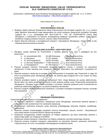 OGÓLNE WARUNKI ŚWIADCZENIA USŁUG PRZEWOZOWYCH DLA EUROGATE LOGISTICS SP. Z O.O. opracowane i zatwierdzone przez Dyrektora Zarządzającego Eurogate Logistics Sp. z o.o. (7 stron) http://www.eurogate.pl | http://www.eurogate.co.uk Data publikacji 23 styczeń 2015 r. §1 POSTANOWIENIA OGÓLNE 1. Niniejsze Ogólne Warunki Świadczenia Usług Przewozowych dla Eurogate Logistics Sp. z o.o. (zwane dalej Ogólnymi Warunkami) mają zastosowanie do umów przewozu zawieranych pomiędzy Eurogate Logistics Sp. z o.o. posiadającej NIP: 953-10-26-770 i VAT UE: PL9531026770 zwaną dalej Zlecającym, a wskazanym na zleceniu przedsiębiorcą będącym rezydentem polskim, wykonującym zarobkowo drogowy przewóz towarów, zwanym dalej Przewoźnikiem. 2. Ogólne Warunki stanowią o szczegółowych prawach i obowiązkach Zlecającego i Przewoźnika w celu realizacji zlecenia przewozu towarów. 1. 2. 3. 4. 5. §2 PRZESŁANIE ZLECENIA I JEGO PRZYJĘCIE Zlecający wysyła zlecenie do Przewoźnika z siedziby głównej firmy oraz z podległych jej biur terenowych: a. Al. Jerozolimskie 202, 02-486 Warszawa - siedziba główna firmy, b. ul. Bociana 6, 31-231 Kraków - biuro terenowe firmy, c. Al. Armii Krajowej 61, 50-541 Wrocław - biuro terenowe firmy, d. ul. Storrady Świętosławy 1 71-602 Szczecin - biuro terenowe firmy, e. ul. Energetyków 5 81-184 Gdynia - biuro terenowe firmy. Poprzez przyjęcie zlecenia Przewoźnik akceptuje zawarcie umowy o przewóz na warunkach określonych w treści zlecenia oraz niniejszych Ogólnych Warunkach, bez zastrzeżeń i uzupełnień ich treści. Zlecenie przewozu uważa się za przyjęte przez Przewoźnika w przypadku gdy Przewoźnik w ciągu 30 minut od przesłania przez Zlecającego zlecenia, nie odmówi jego przyjęcia lub w tym czasie nie złoży nowej oferty. Zlecenie przesłane będzie w jednej ze wskazanych form: drogą faksową lub pocztą elektroniczną. Numer faksu lub adres poczty elektronicznej e-mail zostaną podane przez Przewoźnika bezpośrednio Zlecającemu. Zlecający może również korzystać z numerów i adresów podanych przez Przewoźnika do publicznej wiadomości jako numer czy adres kontaktowy dla klientów. Poprzez przyjęcie zlecenia Przewoźnik oświadcza, iż posiada wymagane przepisami licencje, koncesje i/lub zezwolenia. §3 OBOWIĄZKI PRZEWOŹNIKA Przewoźnik jest zobowiązany w szczególności: 1. W miejscach załadunku i rozładunku, wskazanych przez Zlecającego, wykonywać zlecenie zgodnie z poleceniami osób uprawnionych do wydawania dyspozycji. 2. Zabezpieczyć wykonanie przewozu przez kierowcę posiadającego stosowne badania, kwalifikacje, uprawnienia. 3. Wykonać przewóz przestrzegając przepisów ochrony środowiska, celnych, kontroli – fitosanitarnych oraz prawa państw na terenie których odbywa się przewóz. 4. Dostarczyć przygotowany środek transportu na miejsce załadunku wg treści pisemnego zlecenia o klasie emisji spalin nie mniejszej niż EURO3. 5. Dostarczyć środek transportu z ładunkiem na miejsce rozładunku wg treści pisemnego zlecenia. 6. Wykonać przewóz środkiem transportu odpowiednim do warunków zlecenia, sprawnym technicznie i dopuszczonym do ruchu na podstawie obowiązujących przepisów prawa. Str. 1 Eurogate Logistics Spółka z ograniczoną odpowiedzialnością z siedzibą w Warszawie (02-486) przy Al. Jerozolimskich 202 zarejestrowana w Sądzie Rejonowym dla m.st. Warszawy w Warszawie, XIII Wydział Gospodarczy Krajowego Rejestru Sądowego pod numerem KRS 0000084458, posiadająca NIP 953-10-26-770, VAT UE 9531026770, o kapitale zakładowym 328 500 PLN OGÓLNE WARUNKI ŚWIADCZENIA USŁUG PRZEWOZOWYCH DLA EUROGATE LOGISTICS SP. Z O.O. opracowane i zatwierdzone przez Dyrektora Zarządzającego Eurogate Logistics Sp. z o.o. (7 stron) http://www.eurogate.pl | http://www.eurogate.co.uk 7. Wykonać przewóz środkiem transportu przeznaczonym wyłącznie na potrzeby realizacji danego zlecenia. Odsprzedaż całości lub części wolnej przestrzeni ładunkowej jest możliwa jedynie po uzyskaniu pisemnej zgody Zlecającego. (zapis nie dotyczy przewozu tzw. profesjonalną linią drobnicową). 8. Osobiście wykonać zlecenie. Zabronione jest zlecanie przewozu dalszym przewoźnikom i spedytorom. 9. Bezwzględnie stosować się do postanowień zawartych w Klauzuli postojowej, będącej częścią niniejszych Ogólnych Warunków. 10. Przy przyjmowaniu przesyłki do przewozu sprawdzić dostarczoną mu dokumentację pod względem kompletności oraz zgodności ze stanem rzeczywistym przesyłki (ilość, waga, cechy i numer towaru) oraz otrzymanym zleceniem transportowym. 11. Przy przyjmowaniu przesyłki do przewozu sprawdzić stan jakościowy przesyłki przygotowanej do przewozu oraz, w przypadku takiej konieczności, dokonać zgłoszenia uwag na liście przewozowym. 12. Sprawdzić stan przygotowania przesyłki do przewozu, oraz w przypadku takiej konieczności, odpowiedniego opakować i zabezpieczyć przesyłki dla dalszych czynności przewozowych. 13. Zabezpieczyć przesyłkę, na czas przewozu, w sposób odpowiedni do zleconej trasy, gwarantujący dostarczenie jej do miejsca rozładunku w stanie kompletnym i niezmienionym. 14. Potwierdzić przyjęcie przesyłki do przewozu poprzez wpisanie w list przewozowy numerów rejestracyjnych pojazdów i danych firmy w sposób zgodny z przepisami konwencji CMR w zakresie potwierdzenia otrzymania towaru do przewozu. 15. Zabezpieczać pojazd z ładunkiem przed włamaniem i kradzieżą ładunku, w szczególności bezwzględnie stosować się do postanowień Warunków odbywania przewozu i postojów (Klauzula postojowa) stanowiących część niniejszych Ogólnych Warunków. 16. W razie zajścia zdarzenia powodującego szkodę lub utratę przesyłki, podjąć wszelkie dostępne środki w celu ograniczenia rozmiarów szkody, powiadomić policję, jeżeli szkoda powstała na skutek rabunku, kradzieży z włamaniem lub wypadku drogowego oraz sporządzić protokół ustalający ok