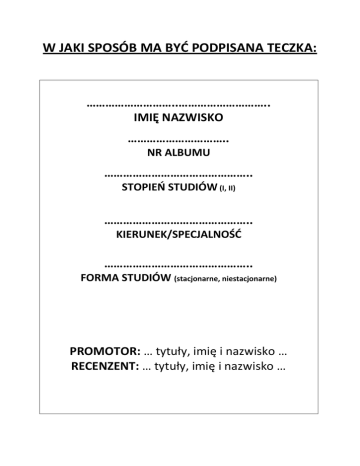 W JAKI SPOSÓB MA BYĆ PODPISANA TECZKA: ………………………..……………………….. IMIĘ NAZWISKO ………………………….. NR ALBUMU ……………………………………….. STOPIEŃ STUDIÓW (I, II) ……………………………………….. KIERUNEK/SPECJALNOŚĆ ……………………………………….. FORMA STUDIÓW (stacjonarne, niestacjonarne) PROMOTOR: … tytuły, imię i nazwisko … RECENZENT: … tytuły, imię i nazwisko …
