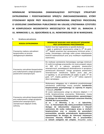 Sprawa Nr 01/14 MINIMALNE Załącznik nr 12 do SIWZ WYMAGANIA ZAMAWIAJĄCEGO DOTYCZĄCE STRUKTURY ZATRUDNIENIA I PODSTAWOWEGO SPRZĘTU ZMECHANIZOWANEGO, KTÓRY STOSOWANY BĘDZIE PRZY REALIZACJI ZAMÓWIENIA OBJĘTEGO PROCEDURĄ O UDZIELENIE ZAMÓWIENIA PUBLICZNEGO NA USŁUGĘ UTRZYMANIA CZYSTOŚCI W KOMPLEKSACH WOJSKOWYCH MIESZCZĄCYCH SIĘ PRZY UL. BANACHA 2 UL. WINNICKIEJ 1, UL. SĘKOCIŃSKIEJ 8, UL. NOWOWIEJSKIEJ 28 W WARSZAWIE. I. Struktura zatrudnienia RODZAJ ZATRUDNIENIA Pracownicy nadzoru zatrudnieni bezpośrednio na terenie obsługiwanych obiektów. Pracownicy zatrudnieni bezpośrednio przy wykonywaniu usługi sprzątania powierzchni wewnętrznych. Pracownicy zatrudnieni bezpośrednio przy wykonywaniu usługi sprzątania powierzchni wewnętrznych i zewnętrznych objętych strefą ochrony. MINIMALNE WARUNKI JAKIE MUSZĄ BYĆ SPEŁNIONE PRZY ZATRUDNIANIU PRACOWNIKÓW Nadzór musi być zapewniony w sposób skuteczny i ciągły w godzinach sprawowania usługi tj. 600 do godz. 1500. Nadzór powinien być sprawowany minimum przez 1 osobę. Zamawiający zastrzega sobie prawo dokonywania kontroli wykonywanych prac przy możliwym współudziale wykonawcy. Do realizacji zamówienia Zamawiający wymaga minimum 21 osób (na jednego pracownika nie może przypaść więcej niż 900 m2) w zakresie sprzątania powierzchni wewnętrznych, posiadających doświadczenie w sprzątaniu pomieszczeń biurowych. Usługa sprzątania powierzchni wewnętrznych świadczona będzie przez pięć dni w tygodniu, tj. od poniedziałku do piątku w godz. 600 do godz. 1200, między godziną 1200 a 1500 należy zapewnić dyżur sprzątający. Wykonawcy ubiegający się o udzielenie przedmiotowego zamówienia publicznego muszą posiadać świadectwo bezpieczeństwa przemysłowego co najmniej III stopnia o klauzuli „POUFNE”. W czasie wykonywania usługi na obszarze objętym I i II strefą bezpieczeństwa pracownicy Wykonawcy muszą posiadać Poświadczenie bezpieczeństwa upoważniające do dostępu do informacji niejawnych oznaczone klauzulą POUFNE dla 6 pracowników: (2 os. - ul. Winnicka, 1 os. – ul. Sękocińska, 3 os. - ul. Nowowiejska 28); należy przewidzieć możliwość dostępu do dokumentów niejawnych o klauzuli zastrzeżone dla osoby nadzorującej pracę w strefach bezpieczeństwa oraz w stosunku do pozostałych pracowników, ponadto poświadczenie bezpieczeństwa upoważniające do dostępu do informacji niejawnych oznaczone klauzulą POUFNE dla 2 pracowników w ramach zastępstw lub urlopów. Wszystkie osoby 1 Sprawa Nr 01/14 Załącznik nr 12 do SIWZ przewidziane do wykonywania usługi powinny posiadać aktualne zaświadczenie stwierdzające odbycie szkolenia w zakresie ochrony informacji niejawnych. Ww. dokumenty wykonawca zobowiązany jest dostarczyć, przy podpisywaniu umowy, przed przystąpieniem do wykonywania usługi nie później niż na dzień przed rozpoczęciem prac odpowiednich dokumentów. Pracownicy zatrudnieni bezpośrednio przy wykonywaniu usługi sprzątania powierzchni zewnętrznych. Do realizacji zamówienia Zamawiający wymaga minimum 4 pracowników (na 1 pracownika nie może przypaść więcej niż 6 000 m2) posiadających doświadczenie w utrzymaniu czystości terenów zewnętrznych. Wszystkie osoby przewidziane do wykonywania usługi powinny posiadać aktualne zaświadczenie stwierdzające odbycie szkolenia w zakresie ochrony informacji niejawnych. Ww. dokumenty wykonawca zobowiązany jest dostarczyć, przy podpisywaniu umowy, przed przystąpieniem do wykonywania usługi nie później niż na dzień przed rozpoczęciem prac odpowiednich dokumentów. II. Sprzęt zmechanizowany Nazwa sprzętu Ilość SPRZĘT DO SPRZĄTANIA POWIERZCHNI WEWNĘTRZNYCH 1 szt. może przypadać na maksimum 1000 m2 sprzątanej powierzchni wewnętrznej Odkurzacz Maszyna szorująco-zmywająca posadzki Nazwa sprzętu 3 szt. Ilość SPRZĘT DO SPRZĄTANIA POWIERZCHNI ZEWNĘTRZNYCH Zamiatarka spalinowa 2 szt. Traktor z pługiem do odśnieżania 1 szt. Zamawiający nie dopuszcza możliwości stosowania sprzętu o napędzie elektrycznym do sprzątania terenu zewnętrznego z powodu braku wyprowadzonych na zewnątrz budynków gniazd umożliwiających podłączenie do sieci elektrycznej. 2 Sprawa Nr 01/14 Załącznik nr 12 do SIWZ WYKAZ MINIMALNYCH ŚRODKÓW CZYSTOŚCI, ŚRODKÓW CHEMICZNYCH, ARTYKUŁÓW HIGIENICZNYCH ORAZ MASZYN NIEZBĘDNYCH DO WYKONYWANIA PRZEDMIOTU UMOWY. Zgodnie z załącznikiem „szczegółowy zakres czynności / opis przedmiotu zamówienia na sprzątanie pomieszczeń i powierzchni zewnętrznych” wykonawca zobowiązany jest do wykazania w ofercie niżej wymienionych składników niezbędnych do wykonywania przedmiotu umowy: LP. ŚRODEK CZYSTOŚCI / ART. HIGIENICZNE środek do mycia podłóg (należy dostosować do określonego rodzaju podłóg np. lastryko, 1. drewno, terakota – zał. 9) 2. mop do podłóg 3. ściereczki do kurzu 4. środek do usuwania kurzu 5. worki na śmieci 6. płyn do mycia szyb 7. środek do dezynfekcji urządzeń sanitarnych 8. środek do czyszczenia armatury łazienkowej 9. środek do czyszczenia okładzin ściennych (glazury, lamperii itp.) 10. ręczniki papierowe 11. papier toaletowy 12. odświeżacze powietrza 13. kostki zapachowe do WC, pisuarów 14. mydło w płynie 15. środek do prania wykładzin, dywanów 16. środek do prania firan, zasłon, verticali środek do konserwacji i nabłyszczania powierzchni podłóg (należy dostosować do 17. określonego rodzaju podłóg np. lastryko, drewno, terakota – zał. 9) 18. chlorek wapnia 19. piasek 3