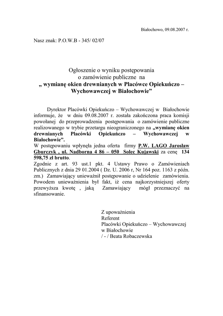 Białochowo, 09.08.2007 r. Nasz znak: P.O.W.B - 345/ 02/07 Ogłoszenie o wyniku postępowania o zamówienie publiczne na „ wymianę okien drewnianych w Placówce Opiekuńczo – Wychowawczej w Białochowie” Dyrektor Placówki Opiekuńczo – Wychowawczej w Białochowie informuje, Ŝe w dniu 09.08.2007 r. została zakończona praca komisji powołanej do przeprowadzenia postępowania o zamówienie publiczne realizowanego w trybie przetargu nieograniczonego na „wymianę okien drewnianych Placówki Opiekuńczo – Wychowawczej w Białochowie”. W postępowaniu wpłynęła jedna oferta firmy P.W. LAGO Jarosław Gburczyk , ul. Nadborna 4 86 – 050 Solec Kujawski za cenę 134 598,75 zł brutto. Zgodnie z art. 93 ust.1 pkt. 4 Ustawy Prawo o Zamówieniach Publicznych z dnia 29 01.2004 ( Dz. U. 2006 r, Nr 164 poz. 1163 z późn. zm.) Zamawiający uniewaŜnił postępowanie o udzielenie zamówienia. Powodem uniewaŜnienia był fakt, iŜ cena najkorzystniejszej oferty przewyŜsza kwotę , jaką Zamawiający mógł przeznaczyć na sfinansowanie. Z upowaŜnienia Referent Placówki Opiekuńczo – Wychowawczej w Białochowie / - / Beata Robaczewska