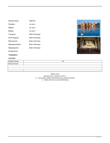 Symbol oferty: 290/370 Państwo: no conv : Region: no conv : Miasto: no conv : Transport: Brak informacji Profil wyjazdu: Brak informacji Wyżywienie: Brak informacji Zakwaterowanie: Brak informacji Wyposażenie: Brak informacji świadczenia: TERMINY: CENNIK: Długość pobytu: dni Grupa cenowa: Waluta: PLN Aktualne ceny z systemu S.A.R.T. (-) - cena usługi, podatku kalkulowana przy osobie lub gratis (*) - kwota wliczona w cenę standardową 1/1