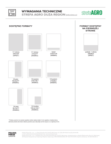 WYMAGANIA TECHNICZNE STREFA AGRO DUŻA REGION (245x324mm) DOSTĘPNE FORMATY FORMAT DOSTĘPNY NA PIERWSZEJ STRONIE 1/1 strony 245x324 (SPAD*) 1/1 strony 215x277 (RAMKA) baner 215x31,54 (RAMKA) 1/2 pion 105,5x277 (RAMKA) 1/2 poziom 215x136,7 (RAMKA) 1/4 poziom 215x66,6 (RAMKA) 1/4 pion 50,7x277 (RAMKA) 1/4 kostka 105,5x136,7 (RAMKA) podwał - 1 strona 245x85,4 (SPAD*) * Podany wymiar nie zawiera spadów (netto) należy dodać 3 mm spadów z każdej strony, elementy istotne dla treści reklamy powinny być odsunięte od linii cięcia o co najmniej 5 mm. Polska Press Sp. z o.o. , ul. Domaniewska 45, 02-672 Warszawa, tel. (22) 201-41-00, fax (22) 201-41-99, e-mail: [email protected], www.polskapress.pl. Polska Press Sp. z o.o. z siedzibą przy ulicy Domaniewskiej 45, 02-672 Warszawa, zarejestrowana w Sądzie Rejonowym dla m.st. Warszawy, XIII Wydział Gospodarczy Krajowego Rejestru Sądowego, KRS 0000002408, NIP: 522-01-03-609, Kapitał zakładowy: 42 000 000,00 zł. WYMAGANIA TECHNICZNE STREFA AGRO DUŻA REGION (245x324mm) ZASADY PRZYJMOWANIA OGŁOSZEŃ W WYDAWNICTWIE POLSKA PRESS GRUPA I. GOTOWE REKLAMY DO DRUKU POWINNY BYĆ: 1. Przygotowane na wymiar zgodny z modułami konkretnego produktu; 6. M aksymalny punkt rastrowy 85% (CMYK) i 90% w druku jednobarwnym (w przypadku czerni 90%K i 40%C) 2. P rzygotowane na wymiar zgodny z modułami konkretnego produktu 7. Maksymalna suma składowych CMYK (Total Ink Limit) dla papieru gazetowego nie może przekraczać 260%. jeśli na spad z naddatkiem 5 mm z każdej strony. Elementy istotne dla treści reklamy powinne być odsunięte od krawędzi cięcia o 7 mm. 3. Zapisane jako TIFF lub EPS z zachowaniem: • rozdzielczość 300 dpi • kolor w standardzie CMYK • fonty zamienione na krzywe i osadzone wszystkie elementy wymagane do druku • w nazwach plików nie powinno być znaków diakrytycznych (narodowych). 4. D ostarczanie reklam do przesyłania reklam w formie elektronicznej służy wyłącznie FTP • adres: ftp.polskapress.pl, użytkownik: reklama_pp, haslo: polskapress • informacje techniczne pod numerem tel. (handlowiec który obsługuj agencje/klienta) • wykluczone jest przesyłanie reklam e-mailem • opis materiałów – musi zawierać datę emisji i wszelkie dodatkowe informacje o sposobie zamieszczenia reklamy. • reklamacje emisji reklamy, do których nie został dołączony wydruk lub plik podglądowy nie będą uwzględniane. 5. Stopień pisma w reklamach: • 1-elementowy w jednym kolorze nie mniejszy niż 6 pt • 2-elementowy w jednym kolorze nie mniejszy niż 8 pt • 1-elementowy w dwóch i więcej kolorach oraz w kontrze nie mniejszy niż 9 pt, • dwuelementowy nie mniejszy niż 11 pt Optymalna czerń w czcionkach powyżej 18 pt lub w dużych elementach graficznych powyżej 0,5 cm kw. - C – 60%, M – 30%, B – 100% W przypadku pisma w kontrze prosimy nie stosować cienkich czcionek typu light – najlepiej użyć czcionki półgrubej (bold). Bezpiecznie jest nie używać niewielkich liter lub cienkich linii w kontrze na wielobarwnym tle. W przypadku jednokanałowego koloru czarnego (K), tam, gdzie to możliwe, zalecamy stosowanie funkcji overprint w przypadku materiałów wektorowych, layer multiply w przypadku materiałów rastrowych oraz zalewek. W związku z częstymi problemami z przejściami tonalnymi w dokumentach generowanych przez CorelDRAW, lepiej jest zamienić takie elementy na bitmapy. Cienkie linie lub inne podobne elementy graficzne (poniżej 1 pkt) powinny być wykonane w jednym kolorze oraz krojem jednoelementowym Szczególnie częstym błędem jest przysyłanie materiałów z kolorem czarnym składającym się z kolorów z całej palety CMYK (co zwykle wynika z prostej konwersji RGB na CMYK). Dla uzyskania poprawnych parametrów separacji w czasie konwersji do przestrzeni technologicznej CMYK zaleca się stosowanie profilu barwnego: ISOwebcoated.icc 8. Reklamy powyżej 20 MB powinny być spakowane w plikach z rozszerzeniem .RAR lub .ZIP. Maksymalna wielkość pliku - 50 MB. II. M ATERIAŁY DO PRZYGOTOWANIA W AR POWINNY SPEŁNIAĆ NASTĘPUJĄCE WARUNKI: 1. Tekst do wpisania - czytelny rękopis lub wydruk, plik tekstowy zapisany jako: txt. 2. Elementy graficzne oryginalne. Fotografie czarno-białe i kolorowe na papierze gładkim błyszczącym do formatu A4. Zdjęcia przesyłane elektronicznie w rozdzielczości min. 265 dpi, format EPS lub TIFF. Znaki graficzne - (LOGO, mapa, plan, schemat itp.) - w plikach wektorowych. 3. Szkic - wzór, jeśli klient ma konkretne wymagania 4. Nie przyjmujemy: • zdjęć rastrowanych, powielanych, kopiowanych • fotografii o niskiej rozdzielczości (np. z Internetu) • rysunków przysłanych faksem • prac przygotowanych w programach: WORD, EXCEL, POWER POINT. Materiały dostarczane do studia graficznego powinny być nazwane w następujący sposób: NAZWA KLIENTA_FORMAT_DATA PIERWSZEJ EMISJI Pojawienie się materiałów na serwerze FTP musi być potwierdzone przez klienta mailowo (kontakt z osobą przyjmującą zlecenie). Wymagane jest podanie dokładnej nazwy materiału umieszczonego na ftpie. Przysłanie materiałów ogłoszeniowych jest równoznaczne z oświadczeniem Klienta o posiadaniu do dostarczonych materiałów praw autorskich w rozumieniu ustawy z dn. 4 lutego 1994 r. o prawie autorskim i prawach pokrewnych. Przypominamy, że prawa autorskie do graficznego opracowania reklamy przysługują wydawcy i każde wykorzystanie tego opracowania wymaga jego zgody. Bliższych informacji na temat terminów i możliwości publikacji ogłoszenia udzieli konsultant obsługujący Klienta. W przypadku niespełnienia przez dostarczane materiały powyższych wymagań technicznych, reklamacje dotyczące jakości wydruku nie będą uwzględniane. Polska Press Sp. z o.o. , ul. Domaniewska 45, 02-672 Warszawa, tel. (22) 201-41-00, fax (22) 201-41-99, e-mail: [email protected], www.polskapress.pl. Polska Press Sp. z o.o. z siedzibą przy ulicy Domaniewskiej 45, 02-672 Warszawa, 