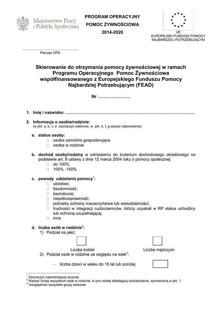 PROGRAM OPERACYJNY POMOC ŻYWNOŚCIOWA 2014-2020 UE EUROPEJSKI FUNDUSZ POMOCY NAJBARDZIEJ POTRZEBUJĄCYM ………………….………………………. Pieczęć OPS Skierowanie do otrzymania pomocy żywnościowej w ramach Programu Operacyjnego Pomoc Żywnościowa współfinansowanego z Europejskiego Funduszu Pomocy Najbardziej Potrzebującym (FEAD) Nr …………….…… 1. Imię i nazwisko: ………………………………………………..………………………………… 2. Informacja o osobie/rodzinie: (w pkt. a, b, c, e zaznaczyć właściwe, w pkt. d, f, g wpisać odpowiednio) a. status osoby: osoba samotnie gospodarująca osoba w rodzinie b. dochód osoby/rodziny w odniesieniu do kryterium dochodowego określonego na podstawie art. 8 ustawy z dnia 12 marca 2004 roku o pomocy społecznej: do 100% 100% -150% c. powody udzielania pomocy1: ubóstwo; bezdomność; bezrobocie; niepełnosprawność; potrzeby ochrony macierzyństwa lub wielodzietności; trudności w integracji cudzoziemców, którzy uzyskali w RP status uchodźcy lub ochronę uzupełniającą; inne d. liczba osób w rodzinie2: 1) Podział na płeć: Liczba kobiet 2) Podział osób w rodzinie ze względu na wiek3: Liczba mężczyzn liczba dzieci w wieku do 15 lat lub poniżej 1 Zaznaczyć najistotniejsze powody Wpisać liczbę wszystkich osób w rodzinie, w tym osobę składającą oświadczenie, wymienioną w pkt. 1 3 Uwzględniać wszystkie grupy wiekowe 2 PROGRAM OPERACYJNY POMOC ŻYWNOŚCIOWA 2014-2020 UE EUROPEJSKI FUNDUSZ POMOCY NAJBARDZIEJ POTRZEBUJĄCYM liczba osób w wieku 65 lat lub powyżej liczba pozostałych osób 3) Podział osób w rodzinie ze względu na grupy docelowe: liczba bezdomnych liczba bezrobotnych liczba migrantów, w tym osób obcego pochodzenia, mniejszości narodowych liczba niepełnosprawnych liczba pozostałych osób e. Uczestnictwo osoby/członków rodziny w działaniach finansowanych z EFS: TAK NIE Należy podać rodzaj działań oraz wskazać osoby objęte działaniami realizowanymi w ramach EFS: f. Termin obowiązywania skierowania: (wpisać właściwą datę) g. Nazwa i adres organizacji partnerskiej regionalnej/lokalnej, do której kierowana jest osoba/rodzina: DRZEWICKIE CENTRUM WOLONTARIATU „OFIARNA DŁOŃ” 26-340 Drzewica, ul. Stanisława Staszica 5 h. Data, podpis i pieczęć pracownika socjalnego OPS: ……………………………………. Data …………………………………………… Pieczęć i podpis PROGRAM OPERACYJNY POMOC ŻYWNOŚCIOWA 2014-2020 i. UE EUROPEJSKI FUNDUSZ POMOCY NAJBARDZIEJ POTRZEBUJĄCYM Oświadczenie: Oświadczam, że nie otrzymuje pomocy żywnościowej w ramach PO PŻ z innej organizacji. Wyrażam zgodę na przetwarzanie moich danych osobowych przez OPS dla potrzeb realizacji Programu Operacyjnego Pomoc Żywnościowa 2014-2020 zgodnie z obowiązującymi przepisami prawa (Ustawa z dnia 29.08.1997 roku o Ochronie Danych Osobowych; tekst jednolity: Dz. U. z 2002r. Nr 101, poz. 926 ze zm.) oraz na przekazywanie danych osobowych do innych podmiotów uczestniczących w realizacji Programu Operacyjnego Pomoc Żywnościowa 2014-2020. Mam prawo wglądu i poprawiania swoich danych. Data i podpis osoby odbierającej skierowanie: ……………………………………. Data …………………………………………… Czytelny podpis PROGRAM OPERACYJNY POMOC ŻYWNOŚCIOWA 2014-2020 UE EUROPEJSKI FUNDUSZ POMOCY NAJBARDZIEJ POTRZEBUJĄCYM Nazwa i adres organizacji partnerskiej regionalnej/lokalnej, do której kierowana jest osoba/rodzina: DRZEWICKIE CENTRUM WOLONTARIATU „OFIARNA DŁOŃ” 26-340 Drzewica, ul. Stanisława Staszica 5 WYPEŁNIA OPR/OPL4: 1. Kwalifikacja do udzielenia pomocy: TAK - pomoc stała w formie paczek, TAK - pomoc stała w formie posiłku, NIE - odmowa udzielenia pomocy: nie spełnia kryterium dochodowego, brak przesłanek do udzielenia pomocy. Uzasadnienie zakwalifikowania do udzielenia pomocy/odmowy udzielenia pomocy5: 2. Pomoc przyznaje się na okres: (od…………………………………………… do………….……………………………..…) 3. Data i podpis przedstawiciela organizacji partnerskiej regionalnej/lokalnej przyjmującego skierowanie do udzielenia pomocy w ramach PO PŻ: ………………………………… Data 4 5 ………………………………………………. Pieczęć i podpis OPR – organizacja partnerska regionalna, OPL – organizacja partnerska lokalna Niepotrzebne skreślić