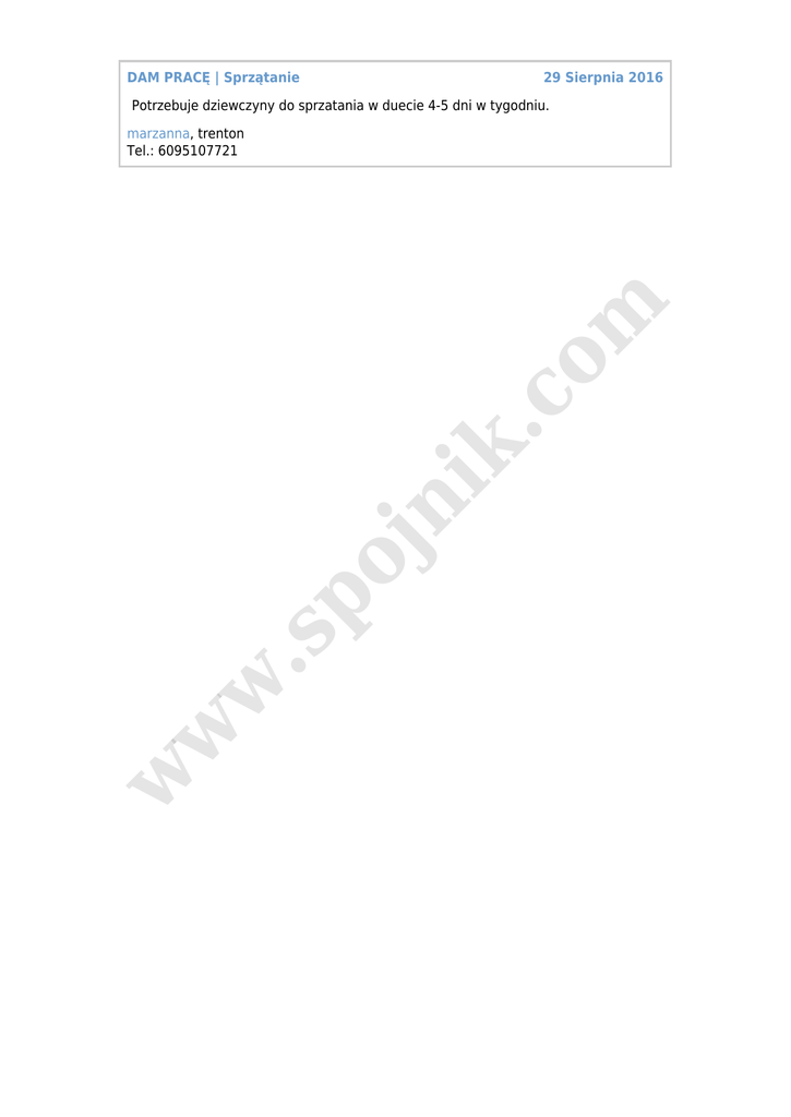 DAM PRACĘ | Sprzątanie 29 Sierpnia 2016 Potrzebuje dziewczyny do sprzatania w duecie 4-5 dni w tygodniu. w w w .s po jn ik .c o m marzanna, trenton Tel.: 6095107721