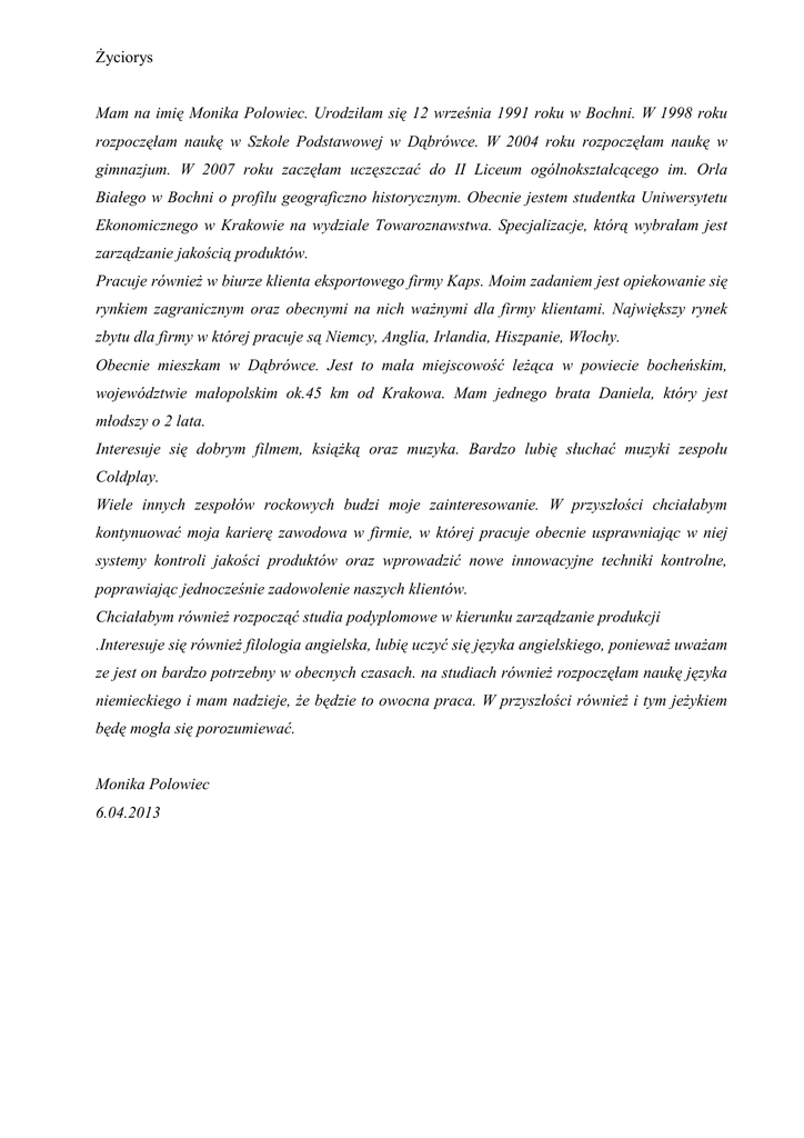 śyciorys Mam na imię Monika Polowiec. Urodziłam się 12 września 1991 roku w Bochni. W 1998 roku rozpoczęłam naukę w Szkole Podstawowej w Dąbrówce. W 2004 roku rozpoczęłam naukę w gimnazjum. W 2007 roku zaczęłam uczęszczać do II Liceum ogólnokształcącego im. Orla Białego w Bochni o profilu geograficzno historycznym. Obecnie jestem studentka Uniwersytetu Ekonomicznego w Krakowie na wydziale Towaroznawstwa. Specjalizacje, którą wybrałam jest zarządzanie jakością produktów. Pracuje równieŜ w biurze klienta eksportowego firmy Kaps. Moim zadaniem jest opiekowanie się rynkiem zagranicznym oraz obecnymi na nich waŜnymi dla firmy klientami. Największy rynek zbytu dla firmy w której pracuje są Niemcy, Anglia, Irlandia, Hiszpanie, Włochy. Obecnie mieszkam w Dąbrówce. Jest to mała miejscowość leŜąca w powiecie bocheńskim, województwie małopolskim ok.45 km od Krakowa. Mam jednego brata Daniela, który jest młodszy o 2 lata. Interesuje się dobrym filmem, ksiąŜką oraz muzyka. Bardzo lubię słuchać muzyki zespołu Coldplay. Wiele innych zespołów rockowych budzi moje zainteresowanie. W przyszłości chciałabym kontynuować moja karierę zawodowa w firmie, w której pracuje obecnie usprawniając w niej systemy kontroli jakości produktów oraz wprowadzić nowe innowacyjne techniki kontrolne, poprawiając jednocześnie zadowolenie naszych klientów. Chciałabym równieŜ rozpocząć studia podyplomowe w kierunku zarządzanie produkcji .Interesuje się równieŜ filologia angielska, lubię uczyć się języka angielskiego, poniewaŜ uwaŜam ze jest on bardzo potrzebny w obecnych czasach. na studiach równieŜ rozpoczęłam naukę języka niemieckiego i mam nadzieje, Ŝe będzie to owocna praca. W przyszłości równieŜ i tym jeŜykiem będę mogła się porozumiewać. Monika Polowiec 6.04.2013