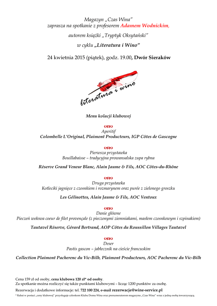 Magazyn „Czas Wina” zaprasza na spotkanie z profesorem Adamem Wodnickim, autorem książki „Tryptyk Oksytański” w cyklu „Literatura i Wino” 24 kwietnia 2015 (piątek), godz. 19.00, Dwór Sieraków Menu kolacji klubowej Aperitif Colombelle L’Original, Plaimont Producteurs, IGP Côtes de Gascogne Pierwsza przystawka Bouillabaisse – tradycyjna prowansalska zupa rybna Réserve Grand Veneur Blanc, Alain Jaume & Fils, AOC Côtes-du-Rhône Druga przystawka Kotleciki jagnięce z czosnkiem i rozmarynem oraz purée z zielonego groszku Les Gélinottes, Alain Jaume & Fils, AOC Ventoux Danie główne Pieczeń wołowa coeur de filet provençale (z pieczonymi ziemniakami, masłem czosnkowym i szpinakiem) Tautavel Réserve, Gérard Bertrand, AOP Côtes du Roussillon Villages Tautavel Deser Pastis gascon – jabłecznik na cieście francuskim Collection Plaimont Pacherenc du Vic-Bilh, Plaimont Producteurs, AOC Pacherenc du Vic-Bilh Cena 159 zł od osoby, cena klubowa 120 zł* od osoby. Za spotkanie można rozliczyć się także punktami klubowymi – licząc 1200 punktów za osobę. Rezerwacja i dodatkowe informacje: tel. 722 100 224, e-mail [email protected] * Rabat w postaci „ceny klubowej” przysługuje członkom Klubu Domu Wina oraz prenumeratorom magazynu „Czas Wina” wraz z jedną osobą towarzyszącą.