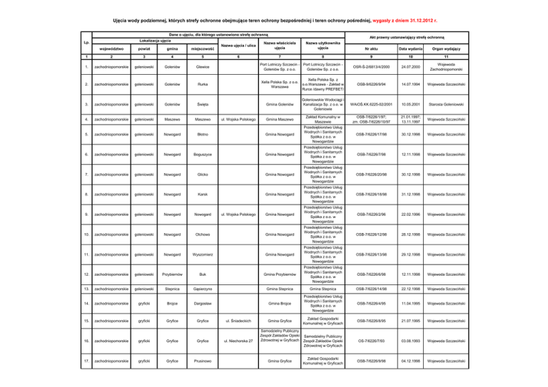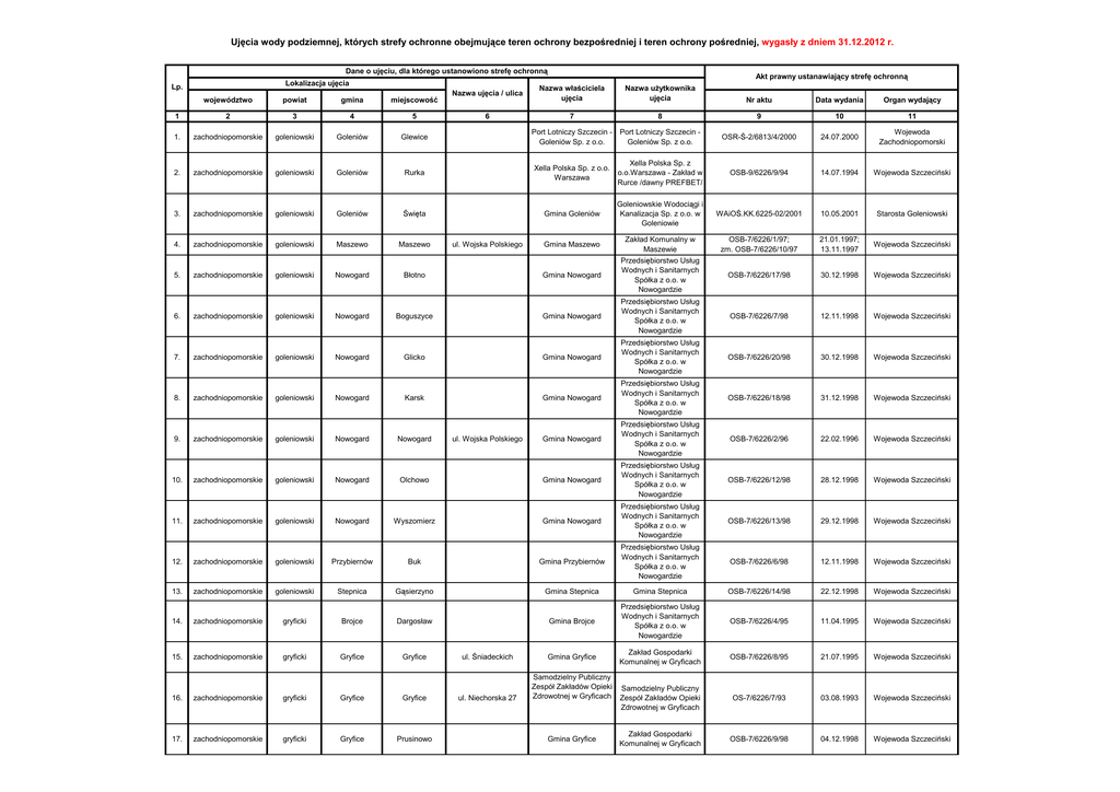 Ujęcia wody podziemnej, których strefy ochronne obejmujące teren ochrony bezpośredniej i teren ochrony pośredniej, wygasły z dniem 31.12.2012 r. Dane o ujęciu, dla którego ustanowiono strefę ochronną Lokalizacja ujęcia Lp. Nazwa ujęcia / ulica Akt prawny ustanawiający strefę ochronną Nazwa właściciela ujęcia Nazwa użytkownika ujęcia Nr aktu Data wydania Organ wydający 7 8 9 10 11 OSR-Ś-2/6813/4/2000 24.07.2000 Wojewoda Zachodniopomorski województwo powiat gmina miejscowość 1 2 3 4 5 1. zachodniopomorskie goleniowski Goleniów Glewice 2. zachodniopomorskie goleniowski Goleniów Rurka Xella Polska Sp. z o.o. Warszawa Xella Polska Sp. z o.o.Warszawa - Zakład w Rurce /dawny PREFBET/ OSB-9/6226/9/94 14.07.1994 Wojewoda Szczeciński 3. zachodniopomorskie goleniowski Goleniów Święta Gmina Goleniów Goleniowskie Wodociągi i Kanalizacja Sp. z o.o. w Goleniowie WAiOŚ.KK.6225-02/2001 10.05.2001 Starosta Goleniowski 4. zachodniopomorskie goleniowski Maszewo Maszewo Gmina Maszewo Zakład Komunalny w Maszewie OSB-7/6226/1/97; zm. OSB-7/6226/10/97 21.01.1997; 13.11.1997 Wojewoda Szczeciński 5. zachodniopomorskie goleniowski Nowogard Błotno Gmina Nowogard Przedsiębiorstwo Usług Wodnych i Sanitarnych Spółka z o.o. w Nowogardzie OSB-7/6226/17/98 30.12.1998 Wojewoda Szczeciński Gmina Nowogard Przedsiębiorstwo Usług Wodnych i Sanitarnych Spółka z o.o. w Nowogardzie OSB-7/6226/7/98 12.11.1998 Wojewoda Szczeciński Gmina Nowogard Przedsiębiorstwo Usług Wodnych i Sanitarnych Spółka z o.o. w Nowogardzie OSB-7/6226/20/98 30.12.1998 Wojewoda Szczeciński Gmina Nowogard Przedsiębiorstwo Usług Wodnych i Sanitarnych Spółka z o.o. w Nowogardzie OSB-7/6226/18/98 31.12.1998 Wojewoda Szczeciński Gmina Nowogard Przedsiębiorstwo Usług Wodnych i Sanitarnych Spółka z o.o. w Nowogardzie OSB-7/6226/2/96 22.02.1996 Wojewoda Szczeciński Gmina Nowogard Przedsiębiorstwo Usług Wodnych i Sanitarnych Spółka z o.o. w Nowogardzie OSB-7/6226/12/98 28.12.1998 Wojewoda Szczeciński Gmina Nowogard Przedsiębiorstwo Usług Wodnych i Sanitarnych Spółka z o.o. w Nowogardzie OSB-7/6226/13/98 29.12.1998 Wojewoda Szczeciński OSB-7/6226/6/98 12.11.1998 Wojewoda Szczeciński 6. 7. 8. 9. 10. 11. zachodniopomorskie zachodniopomorskie zachodniopomorskie zachodniopomorskie zachodniopomorskie zachodniopomorskie goleniowski goleniowski goleniowski goleniowski goleniowski goleniowski Nowogard Nowogard Nowogard Nowogard Nowogard Nowogard 6 Port Lotniczy Szczecin - Port Lotniczy Szczecin Goleniów Sp. z o.o. Goleniów Sp. z o.o. ul. Wojska Polskiego Boguszyce Glicko Karsk Nowogard ul. Wojska Polskiego Olchowo Wyszomierz 12. zachodniopomorskie goleniowski Przybiernów Buk Gmina Przybiernów Przedsiębiorstwo Usług Wodnych i Sanitarnych Spółka z o.o. w Nowogardzie 13. zachodniopomorskie goleniowski Stepnica Gąsierzyno Gmina Stepnica Gmina Stepnica OSB-7/6226/14/98 22.12.1998 Wojewoda Szczeciński 14. zachodniopomorskie gryficki Brojce Dargosław Gmina Brojce Przedsiębiorstwo Usług Wodnych i Sanitarnych Spółka z o.o. w Nowogardzie OSB-7/6226/4/95 11.04.1995 Wojewoda Szczeciński 15. zachodniopomorskie gryficki Gryfice Gryfice ul. Śniadeckich Gmina Gryfice Zakład Gospodarki Komunalnej w Gryficach OSB-7/6226/8/95 21.07.1995 Wojewoda Szczeciński ul. Niechorska 27 Samodzielny Publiczny Zespół Zakładów Opieki Zdrowotnej w Gryficach Samodzielny Publiczny Zespół Zakładów Opieki Zdrowotnej w Gryficach OS-7/6226/7/93 03.08.1993 Wojewoda Szczeciński Zakład Gospodarki Komunalnej w Gryficach OSB-7/6226/9/98 04.12.1998 Wojewoda Szczeciński 16. zachodniopomorskie gryficki Gryfice Gryfice 17. zachodniopomorskie gryficki Gryfice Prusinowo Gmina Gryfice Dane o ujęciu, dla którego ustanowiono strefę ochronną Lokalizacja ujęcia Lp. Nazwa ujęcia / ulica Akt prawny ustanawiający strefę ochronną Nazwa właściciela ujęcia Nazwa użytkownika ujęcia Nr aktu Data wydania Organ wydający województwo powiat gmina miejscowość 1 2 3 4 5 6 7 8 9 10 11 18. zachodniopomorskie gryficki Płoty Płoty ul. Ogrodowa Gmina Płoty Zakład Gospodarki Komunalnej i Mieszkaniowej w Płotach OSB-7/6226/5/97; zm. RLiOŚ 6220/10/00 05.05.1997; 26.10.2000 Wojewoda Szczeciński; Starosta Gryficki 19. zachodniopomorskie gryficki Rewal Rewal; Śliwin Gmina Rewal Wodociągi Rewal Sp. z o.o. Ul. Poznańska 31 72-346 Pobierowo RLiOŚ.6220/5/00 13.03.2000 Starosta Gryficki 20. zachodniopomorskie gryficki Rewal Trzęsacz Gmina Rewal Zakład Wodociągów i Kanalizacji w Pobierowie RLiOŚ-6223/15/99 14.05.1999 Starosta Gryficki 21. zachodniopomorskie gryficki Trzebiatów Gorzysław osoba prywatna osoba prywatna OSB-7/6226/4/94 08.03.1994 Wojewoda Szczeciński 22. zachodniopomorskie gryficki Trzebiatów Trzebiatów Gmina Trzebiatów Zakład Wodociągów i Kanalizacji w Trzebiatowie OSB-7/6226/15/95 23.10.1995 Wojewoda Szczeciński 23. zachodniopomorskie gryficki Trzebiatów Trzebiatów Polski Koncern Naftowy ORLEN S.A. w Płocku Polski Koncern Naftowy ORLEN S.A. w Płocku OS-7/6226/5/93 19.07.1993 Wojewoda Szczeciński 24. zachodniopomorskie gryfiński Cedynia Osinów Dolny Gmina Cedynia Wodociągi Zachodniopomorskie Sp. z o.o. w Goleniowie OSB-9/6226/5/95 30.06.1995 Wojewoda Szczeciński TEXAS RANCH COMPANY Sp. z o.o. Koszewko 13 73-102 Stargard Szcz. TEXAS RANCH COMPANY Sp. z o.o. Koszewko 13 73102 Stargard Szcz. OSB-9/6226/5/94 07.03.1994 Wojewoda Szczeciński ul. Pietruszkowa 1 25. zachodniopomorskie gryfiński Chojna Chojna Elewator Zbożowy, ul. Kopernika 26. zachodniopomorskie gryfiński Gryfino Dębce Dębce-Żabnica Gmina Gryfino Przedsiębiorstwo Usług Komunalnych Spółka z o.o. w Gryfinie Uchwała Nr XXVII/313/2001 21.12.2001 Rada Powiatu w Gryfinie 27. zachodniopomorskie gryfiński Gryfino Gryfino "Pomorska" Gmina Gryfino Przedsiębiorstwo Usług Komunalnych Spółka z o.o. w Gryfinie OSB-9/6226/14/95 19.10.1995 Wojewoda Szczeciński 28. zachodniopomorskie gryfiński Gryfino Gryfino Centrum Wodne "Laguna