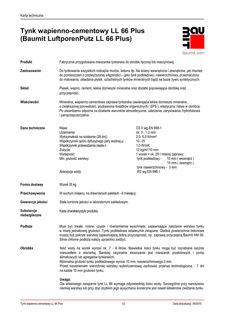 Karta techniczna Tynk wapienno-cementowy LL 66 Plus (Baumit LuftporenPutz LL 66 Plus) Produkt Fabrycznie przygotowana mieszanka tynkarska do obróbki ręcznej lub maszynowej. Zastosowanie Do tynkowania wszystkich rodzajów murów, betonu itp. Na ściany wewnętrzne i zewnętrzne, jak również do pomieszczeń o podwyższonej wilgotności – jako tynk podkładowy i nawierzchniowy, przeznaczony do malowania, układania płytek, szlachetnych tynków mineralnych bądź na bazie żywic syntetycznych. Skład Piasek, wapno, cement, lekkie domieszki mineralne oraz dodatki poprawiające obróbkę oraz przyczepność. Właściwości Mineralna, wapienno-cementowa zaprawa tynkarska zawierająca lekkie domieszki mineralne, o zwiększonej porowatości, pozbawiona dodatków organicznych ( EPS ), elastyczna i łatwa w obróbce. Po utwardzeniu odporna na działanie warunków atmosferyczne, uderzenia, zarysowania, hydrofobowa i paroprzepuszczalna. Dane techniczne Klasa: Uziarnienie: Wytrzymałość na ściskanie (28 dni): Współczynnik oporu dyfuzyjnego pary wodnej µ: Współczynnik przewodzenia ciepła λ: Zużycie: Wydajność: Min. grubość warstwy: Absorpcja wody: CS II wg EN 998-1 ok. 0 - 1,2 mm 2,0- 5,0 N/mm² 10 -15 1,0 W/mK 12 kg/m²/10 mm 1 worek = ok. 29 I mokrej zaprawy: tynk podkładowy - 10 mm ( wewnątrz ) 15 mm ( zewnątrz ) tynk nawierzchniowy - 3 mm W2 wg EN 998-1 Forma dostawy Worek 35 kg Przechowywanie W suchym miejscu, na drewnianych paletach - 6 miesięcy. Gwarancja jakości Stała kontrola jakości w laboratorium zakładowym. Substancje niebezpieczne Karta charakterystyki produktu Podłoże Musi być trwałe, nośne, czyste i równomiernie wyschnięte, zapewniające nałożenie warstwy tynku w miarę jednakowej grubości. Tynki podkładowe ostatecznie związane. Gładkie powierzchnie betonowe muszą być pokryte warstwą zapewniającą dobrą przyczepność, np. zaprawą przyczepną Baumit HM 50. Silnie chłonne podłoża należy uprzednio zwilżyć. Obróbka Ilość wody na worek wynosi ok. 7 - 8 litrów. Niewielkie ilości tynku mogą być rozrabiane ręcznie mieszadłem z wiertarką. Bardziej racjonalne stosowanie jest mieszarek przelotowych i pomp ślimakowych lub agregatów tynkarskich. Minimalna grubość tynku podkładowego wynosi 10 mm, nawierzchniowego 3 mm. Przed naniesieniem wierzchniej warstwy wykończeniowej zachować przerwę technologiczną - 7 dni na każde 10 mm grubości tynku. Uwaga: Dla właściwego związania tynk LL 66 wymaga odpowiedniej ilości wody. Szczególnie przy nanoszeniu cienkiej warstwy lub przy zbyt szybkim jego wysychaniu konieczne jest nawet kilkakrotne zwilżanie tynku. Tynk wapienno-cementowy LL 66 Plus 1/2 Data aktualizacji: 09/2015 Karta techniczna Wskazówki Czas przydatności do zużycia gotowej mieszanki odpowiada normalnemu czasowi wiązania cementu i zależy od chłonności podłoża, temperatury otoczenia i konsystencji masy zarobowej. Tynk LL 66 należy zarabiać wodą bez innych dodatków. Nie stosować w temperaturze poniżej +5°C. Zaprawę należy mieszać wystarczająco, lecz niezbyt długo, gdyż może nastąpić znaczny spadek jej wytrzymałości. Materiał już związany nie może być zarabiany od nowa. Wysokie temperatury wpływają ujemnie na hydrauliczne reakcje utwardzania w wyniku zbyt szybkiego wysychania. Nasze zalecenia w zakresie stosowanych technik, przekazywane słowem i pismem w celu wsparcia nabywcy (użytkownika) opracowane w oparciu o nasze doświadczenia i aktualny stan wiedzy są niewiążące i nie uzasadniają prawnego stosunku umownego oraz żadnych zobowiązań ubocznych z tytułu umowy kupna (sprzedaży). Nie zwalniają one nabywcy od sprawdzenia na własną odpowiedzialność przydatności naszych produktów do przewidzianego zastosowania. Należy przestrzegać ogólnych zasad techniki budowlanej. Zastrzegamy sobie możliwość zmian, które służą technicznemu postępowi i ulepszeniu produktu lub jego zastosowaniu. Wraz z ukazaniem się niniejszej informacji technicznej wcześniejsze jej wersje tracą ważność. Najbardziej aktualne informacje znajdziecie Państwo na naszych stronach internetowych. Poza tym obowiązują nasze "Ogólne warunki umów" znajdujące się w katalogach produktów. Nasza gęsta sieć przedstawicielstw gwarantuje szybkie doradztwo i dostawy. Dodatkowych informacji prosimy zasięgnąć u najbliższego przedstawiciela regionalnego. Tynk wapienno-cementowy LL 66 Plus 2/2 Data aktualizacji: 09/2015
