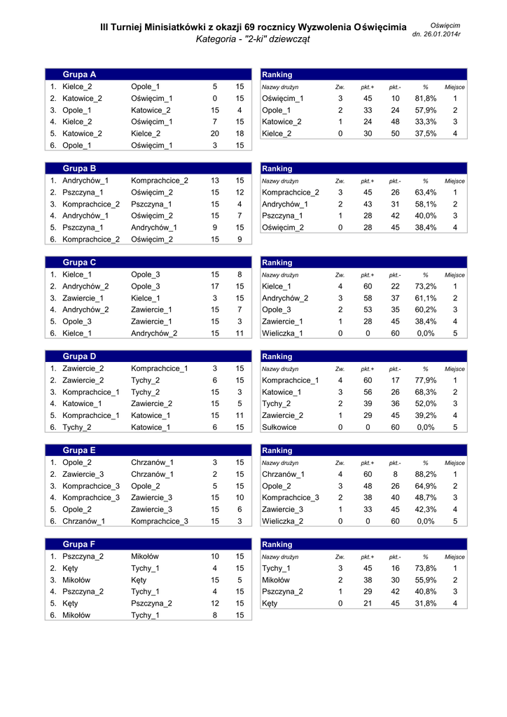 III Turniej Minisiatkówki z okazji 69 rocznicy Wyzwolenia Oświęcimia Kategoria - "2-ki" dziewcząt Grupa A Oświęcim dn. 26.01.2014r Ranking 1. Kielce_2 Opole_1 5 15 Nazwy drużyn 2. Katowice_2 Oświęcim_1 0 15 Oświęcim_1 3. Opole_1 Katowice_2 15 4 Opole_1 4. Kielce_2 Oświęcim_1 7 15 Katowice_2 5. Katowice_2 Kielce_2 20 18 Kielce_2 6. Opole_1 Oświęcim_1 3 15 1. Andrychów_1 Komprachcice_2 13 15 Nazwy drużyn 2. Pszczyna_1 Oświęcim_2 15 12 3. Komprachcice_2 Pszczyna_1 15 4 4. Andrychów_1 Oświęcim_2 15 7 Pszczyna_1 5. Pszczyna_1 Andrychów_1 9 15 Oświęcim_2 6. Komprachcice_2 Oświęcim_2 15 9 Grupa B Zw. pkt.+ pkt.- % Miejsce 3 45 10 81,8% 1 2 33 24 57,9% 2 1 24 48 33,3% 3 0 30 50 37,5% 4 Zw. pkt.+ pkt.- % Miejsce Komprachcice_2 3 45 26 63,4% 1 Andrychów_1 2 43 31 58,1% 2 1 28 42 40,0% 3 0 28 45 38,4% 4 Ranking Grupa C Ranking 1. Kielce_1 Opole_3 15 8 Zw. pkt.+ pkt.- % Miejsce 2. Andrychów_2 Opole_3 17 15 Kielce_1 4 60 22 73,2% 1 3. Zawiercie_1 Kielce_1 3 15 Andrychów_2 3 58 37 61,1% 2 4. Andrychów_2 Zawiercie_1 15 7 Opole_3 2 53 35 60,2% 3 5. Opole_3 Zawiercie_1 15 3 Zawiercie_1 1 28 45 38,4% 4 6. Kielce_1 Andrychów_2 15 11 Wieliczka_1 0 0 60 0,0% 5 Grupa D Nazwy drużyn Ranking 1. Zawiercie_2 Komprachcice_1 3 15 Nazwy drużyn Zw. pkt.+ pkt.- % Miejsce 2. Zawiercie_2 Tychy_2 6 15 Komprachcice_1 4 60 17 77,9% 1 3. Komprachcice_1 Tychy_2 15 3 Katowice_1 3 56 26 68,3% 2 4. Katowice_1 Zawiercie_2 15 5 Tychy_2 2 39 36 52,0% 3 5. Komprachcice_1 Katowice_1 15 11 Zawiercie_2 1 29 45 39,2% 4 6. Tychy_2 Katowice_1 6 15 Sułkowice 0 0 60 0,0% 5 1. Opole_2 Chrzanów_1 3 15 Nazwy drużyn Zw. pkt.+ pkt.- % Miejsce 2. Zawiercie_3 Chrzanów_1 2 15 Chrzanów_1 4 60 8 88,2% 1 3. Komprachcice_3 Opole_2 5 15 Opole_2 3 48 26 64,9% 2 4. Komprachcice_3 Zawiercie_3 15 10 Komprachcice_3 2 38 40 48,7% 3 5. Opole_2 Zawiercie_3 15 6 Zawiercie_3 1 33 45 42,3% 4 6. Chrzanów_1 Komprachcice_3 15 3 Wieliczka_2 0 0 60 0,0% 5 Grupa E Ranking Grupa F Ranking 1. Pszczyna_2 Mikołów 10 15 Nazwy drużyn Zw. pkt.+ pkt.- % Miejsce 2. Kęty Tychy_1 4 15 Tychy_1 3 45 16 73,8% 1 3. Mikołów Kęty 15 5 Mikołów 2 38 30 55,9% 2 4. Pszczyna_2 Tychy_1 4 15 Pszczyna_2 1 29 42 40,8% 3 5. Kęty Pszczyna_2 12 15 Kęty 0 21 45 31,8% 4 6. Mikołów Tychy_1 8 15 III Turniej Minisiatkówki z okazji 69 rocznicy Wyzwolenia Oświęcimia Kategoria - "2-ki" dziewcząt Grupa G miejsca 1-12 1. 2. 3. 4. 5. 6. 7. 8. 9. 10. 11. 12. 13. 14. 15. Katowice_1 Opole_2 Mikołów_2 Kielce_1 Katowice_1 Opole_2 Komprachcice_2 Kielce_1 Katowice_1 Mikołów_2 Komprachcice_2 Kielce_1 Opole_2 Mikołów_2 Komprachcice_2 Kielce_1 Komprachcice_2 Oświęcim_1 Komprachcice_2 Mikołów_2 Oświęcim_1 Mikołów_2 Opole_2 Oświęcim_1 Opole_2 Katowice_1 Oświęcim_1 Katowice_1 Kielce_1 Oświęcim_1 Grupa H miejsca 1-12 1. 2. 3. 4. 5. 6. 7. 8. 9. 10. 11. 12. 13. 14. 15. Komprachcice_1 Chrzanów_1 Tychy_1 Andrychów_2 Komprachcice_1 Chrzanów_1 Andrychów_1 Andrychów_2 Komprachcice_1 Tychy_1 Andrychów_1 Andrychów_2 Chrzanów_1 Tychy_1 Andrychów_1 Andrychów_2 Andrychów_1 Opole_1 Andrychów_1 Tychy_1 Opole_1 Tychy_1 Chrzanów_1 Opole_1 Chrzanów_1 Komprachcice_1 Opole_1 Komprachcice_1 Andrychów_2 Opole_1 Grupa I miejsca 13-24 1. 2. 3. 4. 5. 6. 7. 8. 9. 10. 11. 12. 13. 14. 15. Zawiercie_2 Zawiercie_3 Kęty Opole_3 Zawiercie_2 Zawiercie_3 Pszczyna_1 Opole_3 Zawiercie_2 Kęty Pszczyna_1 Opole_3 Zawiercie_3 Kęty Pszczyna_1 Opole_3 Pszczyna_1 Katowice_2 Pszczyna_1 Kęty Katowice_2 Kęty Zawiercie_3 Katowice_2 Zawiercie_3 Zawiercie_2 Katowice_2 Zawiercie_2 Opole_3 Katowice_2 Grupa J miejsca 13-24 1. 2. 3. 4. 5. 6. 7. 8. 9. 10. 11. 12. 13. 14. 15. Tychy_2 Komprachcice_3 Pszczyna_2 Zawiercie_1 Tychy_2 Komprachcice_3 Oświecim_2 Zawiercie_1 Tychy_2 Pszczyna_2 Oświecim_2 Zawiercie_1 Komprachcice_3 Pszczyna_2 Oświecim_2 Zawiercie_1 Oświecim_2 Kielce_2 Oświecim_2 Pszczyna_2 Kielce_2 Pszczyna_2 Komprachcice_3 Kielce_2 Komprachcice_3 Tychy_2 Kielce_2 Tychy_2 Zawiercie_1 Kielce_2 Oświęcim dn. 26.01.2014r Ranking 15 6 5 15 15 3 12 15 15 15 14 6 3 8 16 12 15 15 8 9 15 15 8 17 12 16 15 15 15 18 Nazwy drużyn 15 15 16 15 15 15 11 3 15 2 5 15 15 15 5 7 3 14 9 10 5 15 15 8 15 15 17 6 6 15 Nazwy drużyn 8 7 7 15 15 6 15 15 15 15 15 19 6 7 5 15 15 15 10 6 15 7 7 13 11 13 21 15 15 15 Nazwy drużyn 15 12 15 16 15 9 15 11 15 8 15 17 9 13 9 11 15 10 14 7 15 8 15 4 15 11 15 15 15 15 Nazwy drużyn Oświęcim_1 Katowice_1 Kielce_1 Mikołów_2 Komprachcice_2 Opole_2 Zw. pkt.+ pkt.- % Miejsce 5 4 3 2 1 0 80 76 63 52 65 32 45 55 54 69 70 75 64,0% 58,0% 53,8% 43,0% 48,1% 29,9% 1 2 3 4 5 6 Zw. pkt.+ pkt.- % Miejsce 5 4 3 2 1 0 75 66 58 59 46 33 19 45 61 66 71 75 79,8% 59,5% 48,7% 47,2% 39,3% 30,6% 1 2 3 4 5 6 Zw. pkt.+ pkt.- % Miejsce 4 4 3 3 1 0 79 79 66 60 42 37 52 53 55 57 71 75 60,3% 59,8% 54,5% 51,3% 37,2% 33,0% 1 2 3 4 5 6 Zw. pkt.+ pkt.- % Miejsce 4 3 3 2 2 1 71 68 70 60 59 51 46 62 72 64 65 70 60,7% 52,3% 49,3% 48,4% 47,6% 42,1% 1 2 3 4 5 6 Ranking Chrzanów_1 Komprachcice_1 Tychy_1 Opole_1 Andrychów_2 Andrychów_1 Ranking Katowice_2 Opole_3 Zawiercie_2 Pszczyna_1 Kęty Zawiercie_3 Ranking Tychy_2 Oświecim_2 Zawiercie_1 Komprachcice_3 Kielce_2 Pszczyna_2 III Turniej Minisiatkówki z okazji 69 rocznicy Wyzwolenia Oświęcimia Kategoria - "2-ki" dziewcząt mecze o miejsca 1-4 Chrzanów_1 Katowice_1 1m. grH 2m. grG Komprachcice_1 Oświęcim_1 2m. grH 1m. grG mecz o miejsce I Katowice_1 Oświęcim_1 zwyc zwyc Klasyfikacja Końcowa 13:15 wynik 09:15 wynik 11:15 wynik mecz o miejsce III Chrzanów_1 Komprachcice_1 10:15 przegr przegr mecze o miejsce V Tychy_1 Kielce_1 3m. grH 3m. grG mecze o miejsce VII Opole_1 Mikołów_2 4m. grH 4m. grG mecze o miejsce IX Andrychów_2 Komprachcice_2 5m. grH 5m. grG mecze o miejsce XI Andrychów_1 Opole_2 6m. grH 6m. grG mecze o miejsce XIII Katowice_2 Tychy_2 1m. grI 1m. grJ mecze o miejsce XV Opole_3 Oświęcim_2 2m. grI 2m. grJ mecze o miejsce XVII Zawiercie_2 Zawiercie_1 3m. grI 3m. grJ wynik 11:15 wynik 09:15 wynik 16:14 wynik 15: