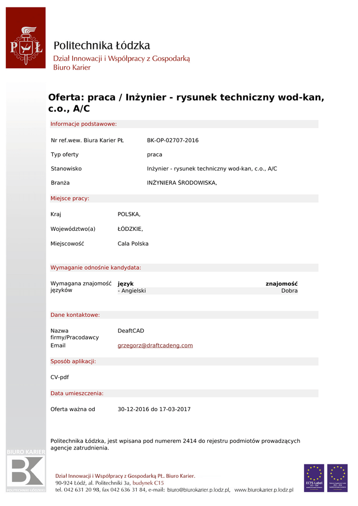 Oferta: praca / Inżynier - rysunek techniczny wod-kan, c.o., A/C Informacje podstawowe: Nr ref.wew. Biura Karier PŁ BK-OP-02707-2016 Typ oferty praca Stanowisko Inżynier - rysunek techniczny wod-kan, c.o., A/C Branża INŻYNIERA ŚRODOWISKA, Miejsce pracy: Kraj POLSKA, Województwo(a) ŁÓDZKIE, Miejscowość Cala Polska Wymaganie odnośnie kandydata: Wymagana znajomość języków język - Angielski znajomość Dobra Dane kontaktowe: Nazwa firmy/Pracodawcy Email DeaftCAD [email protected] Sposób aplikacji: CV-pdf Data umieszczenia: Oferta ważna od 30-12-2016 do 17-03-2017 Politechnika Łódzka, jest wpisana pod numerem 2414 do rejestru podmiotów prowadzących agencje zatrudnienia.