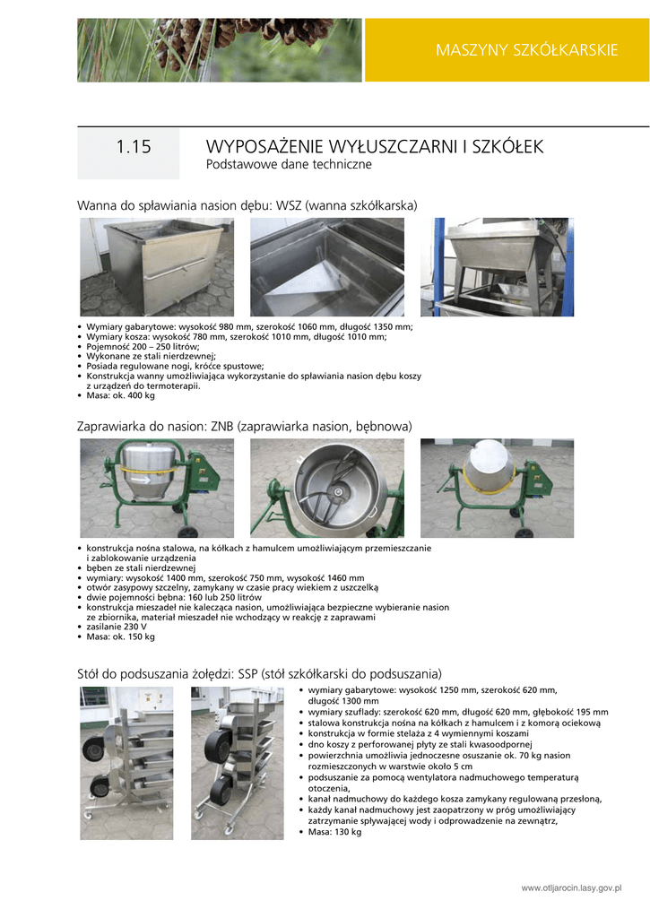 Untergrund maszyny szkółkarskie vorbereiten 1.15 Wyposażenie wyłuszczarni i szkółek Podstawowe dane techniczne Wanna do spławiania nasion dębu: WSZ (wanna szkółkarska) • Wymiary gabarytowe: wysokość 980 mm, szerokość 1060 mm, długość 1350 mm; • Wymiary kosza: wysokość 780 mm, szerokość 1010 mm, długość 1010 mm; • Pojemność 200 – 250 litrów; • Wykonane ze stali nierdzewnej; • Posiada regulowane nogi, króćce spustowe; • Konstrukcja wanny umożliwiająca wykorzystanie do spławiania nasion dębu koszy z urządzeń do termoterapii. • Masa: ok. 400 kg Zaprawiarka do nasion: ZNB (zaprawiarka nasion, bębnowa) • konstrukcja nośna stalowa, na kółkach z hamulcem umożliwiającym przemieszczanie i zablokowanie urządzenia • bęben ze stali nierdzewnej • wymiary: wysokość 1400 mm, szerokość 750 mm, wysokość 1460 mm • otwór zasypowy szczelny, zamykany w czasie pracy wiekiem z uszczelką • dwie pojemności bębna: 160 lub 250 litrów • konstrukcja mieszadeł nie kalecząca nasion, umożliwiająca bezpieczne wybieranie nasion ze zbiornika, materiał mieszadeł nie wchodzący w reakcję z zaprawami • zasilanie 230 V • Masa: ok. 150 kg Stół do podsuszania żołędzi: SSP (stół szkółkarski do podsuszania) • wymiary gabarytowe: wysokość 1250 mm, szerokość 620 mm, długość 1300 mm • wymiary szuflady: szerokość 620 mm, długość 620 mm, głębokość 195 mm • stalowa konstrukcja nośna na kółkach z hamulcem i z komorą ociekową • konstrukcja w formie stelaża z 4 wymiennymi koszami • dno koszy z perforowanej płyty ze stali kwasoodpornej • powierzchnia umożliwia jednoczesne osuszanie ok. 70 kg nasion rozmieszczonych w warstwie około 5 cm • podsuszanie za pomocą wentylatora nadmuchowego temperaturą otoczenia, • kanał nadmuchowy do każdego kosza zamykany regulowaną przesłoną, • każdy kanał nadmuchowy jest zaopatrzony w próg umożliwiający zatrzymanie spływającej wody i odprowadzenie na zewnątrz, • Masa: 130 kg www.otljarocin.lasy.gov.pl n measzyny tierebro szkółkarskie v dnurgretnU Wyposażenie wyłuszczarni i szkółek Podstawowe dane techniczne 1.15 Stół do ociekania żołędzi: WSO (stół/wanna szkółkarska do osuszania) • Wymiary gabarytowe: wysokość 980 mm, szerokość 1060 mm, długość 1350 mm; • Wymiary kosza: wysokość 780 mm, szerokość 1010 mm, długość 1010 mm; • Pojemność 200 – 250 litrów; • Wykonane ze stali nierdzewnej; • Posiada regulowane nogi, króćce spustowe; • Masa: ok. 400 kg Stół do obcinania Db. Stół do obcinania żołędzi SSO (stół szkółkarski do obcinania) • wymiary: wysokość 810 mm, szerokość 2000 mm, długość 1000 mm • konstrukcja stalowa zabezpieczona antykorozyjnie • blat wodoodporny, trudny do zarysowania, nie wchodzący w reakcję z zaprawą nasienną • blat stołu może być wykonany z płyty z tworzywa sztucznego. Podstawowymi wymaganiami są: wodoodporność i trwałość (odporność na trwałe uszkodzenia np. przy wysypywaniu żołędzi z pojemników). • nośność ok. 250 kg • stół powinien posiadać krawędź (burtę) o wysokości ok. 10 – 15 mm powyżej blatu, aby zapobiec rozsypywaniu się żołędzi w trakcie ich wysypywania z pojemników. Stół do siewu nasion: SSS (stół szkółkarski do siewu w pojemnikach) • konstrukcja stalowa zabezpieczona antykorozyjnie • blat wodoodporny, trudny do zarysowania, • nośność ok. 200 kg • wymiary: wysokość 500 mm, szerokość 1200 mm, długość 1800 mm • stół służy do stawiania na nim palet styropianowych do wysiewu nasion, www.otljarocin.lasy.gov.pl