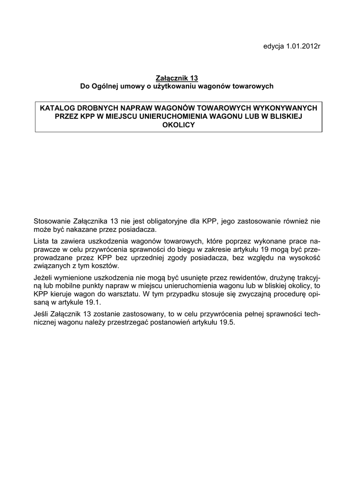 edycja 1.01.2012r Załącznik 13 Do Ogólnej umowy o użytkowaniu wagonów towarowych KATALOG DROBNYCH NAPRAW WAGONÓW TOWAROWYCH WYKONYWANYCH PRZEZ KPP W MIEJSCU UNIERUCHOMIENIA WAGONU LUB W BLISKIEJ OKOLICY Stosowanie Załącznika 13 nie jest obligatoryjne dla KPP, jego zastosowanie również nie może być nakazane przez posiadacza. Lista ta zawiera uszkodzenia wagonów towarowych, które poprzez wykonane prace naprawcze w celu przywrócenia sprawności do biegu w zakresie artykułu 19 mogą być przeprowadzane przez KPP bez uprzedniej zgody posiadacza, bez względu na wysokość związanych z tym kosztów. Jeżeli wymienione uszkodzenia nie mogą być usunięte przez rewidentów, drużynę trakcyjną lub mobilne punkty napraw w miejscu unieruchomienia wagonu lub w bliskiej okolicy, to KPP kieruje wagon do warsztatu. W tym przypadku stosuje się zwyczajną procedurę opisaną w artykule 19.1. Jeśli Załącznik 13 zostanie zastosowany, to w celu przywrócenia pełnej sprawności technicznej wagonu należy przestrzegać postanowień artykułu 19.5. Kod usterki wg zał. 9 an. 1 do AVV Opis usterki 3.1.1 Zwisające bądź złamane części układu dźwigniowego hamulca 3.1.2 Podwiesa zabezpieczająca nie spełnia swojej funkcji 3.1.3 Urządzenia przestawcze włącz/wyłącz hamulca 3.1.3.2 Ustawienie niejednoznaczne 3.3.2.1 Uszkodzenie lub brak sprzęgu hamulcowego 3.3.5.1 Kurek odcinający (końcowy) niedrożny, nieszczelny, zgięty lub brak 5.2.3 Powierzchnia styku tarczy zderzakowej nienasmarowana, wyżłobiona 5.4.4 Mocowanie pochwy zderzaka niezapewnione 5.4.4.1 2 lub więcej śrub luźne 5.4.4.2 Jednej śruby brak 5.4.4.3 Jedna śruba luźna 5.6 Sprzęg śrubowy 5.6.1 Części brak, są uszkodzone lub nie działają 5.6.3 Niepodwieszony sprzęg 5.8 Inne części urządzenia cięgłowego 5.9 Amortyzator o długim skoku 6.1.1 Napisy na wagonie I na jednostkach ładunkowych – brak, nieczytelne lub niepełne 6.1.7.4 Części różne – uchwyt manewrowego 6.1.7.5 Części różne – niedostatecznie zamocowanie 6.1.7.6 Części różne - brak 6.1.7.8 Niezabezpieczone luźne części