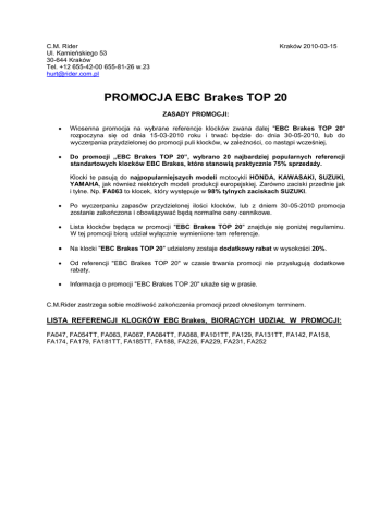 Kraków 2010-03-15 C.M. Rider Ul. Kamieńskiego 53 30-644 Kraków Tel. +12 655-42-00 655-81-26 w.23 [email protected] PROMOCJA EBC Brakes TOP 20 ZASADY PROMOCJI: Wiosenna promocja na wybrane referencje klocków zwana dalej "EBC Brakes TOP 20" rozpoczyna się od dnia 15-03-2010 roku i trwać będzie do dnia 30-05-2010, lub do wyczerpania przydzielonej do promocji puli klocków, w zależności, co nastąpi wcześniej. Do promocji „EBC Brakes TOP 20”, wybrano 20 najbardziej popularnych referencji standartowych klocków EBC Brakes, które stanowią praktycznie 75% sprzedaży. Klocki te pasują do najpopularniejszych modeli motocykli HONDA, KAWASAKI, SUZUKI, YAMAHA, jak również niektórych modeli produkcji europejskiej. Zarówno zaciski przednie jak i tylne. Np. FA063 to klocek, który występuje w 98% tylnych zaciskach SUZUKI. Po wyczerpaniu zapasów przydzielonej ilości klocków, lub z dniem 30-05-2010 promocja zostanie zakończona i obowiązywać będą normalne ceny cennikowe. Lista klocków będąca w promocji "EBC Brakes TOP 20" znajduje się poniżej regulaminu. W tej promocji biorą udział wyłącznie wymienione tam referencje. Na klocki "EBC Brakes TOP 20" udzielony zostaje dodatkowy rabat w wysokości 20%. Od referencji "EBC Brakes TOP 20" w czasie trwania promocji nie przysługują dodatkowe rabaty. Informacja o promocji "EBC Brakes TOP 20" ukaże się w prasie. C.M.Rider zastrzega sobie możliwość zakończenia promocji przed określonym terminem. LISTA REFERENCJI KLOCKÓW EBC Brakes, BIORĄCYCH UDZIAŁ W PROMOCJI: FA047, FA054TT, FA063, FA067, FA084TT, FA088, FA101TT, FA129, FA131TT, FA142, FA158, FA174, FA179, FA181TT, FA185TT, FA188, FA226, FA229, FA231, FA252