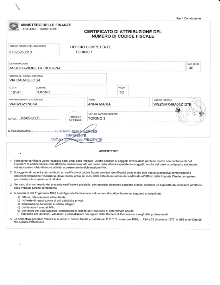 Tłumaczenie z języka włoskiego Zaświadczenie przyznania numeru NIP stowarzyszeniu “La Cicogna” MINISTERSTWO FINANSÓW Kopia dla płatnika REJESTR PODATKOWY ZAŚWIADCZENIE PRZYZNANIA NUMERU IDENTYFIKACJI PODATKOWEJ KOMPETENTNY URZĄD PODATKOWY: Turyn 1 REGON podmiotu: 97598950018 Nazwa: Adres: Kod pocztowy: STOWARZYSZENIE LA CICOGNA ul. Caraglio 24 10141 gmina: Turyn Przedstawiciel Nazwisko: Imię: PESEL: WASZCZYŃSKA ANNA MARIA WSZNMR48A63Z127E Data: Urząd podatkowy: Pieczęć urzędu: Funkcjonariusz: Stan prawny: 40 prow. TO 01/06/2000 URZĄD PODATKOWY TURYN 1 odcisk okrągłej pieczęci koloru czarnego z godłem państwowym Włoch i z napisem na otoku: Rejestr Podatkowy Turynu 1 Odpowiedzialny za Wydział Usług KIEROWNIK mgr Ermenegilda PRUDENTE podpis odręczny nieczytelny INFORMACJE /omissis/ Anna Maria Waszczyńska, prezes włoskiej organizacji z autoryzacją rządową “La Cicogna”, potwierdza zgodność materialną i formalną niniejszego tłumaczenia z oryginalnym tekstem w języku włoskim. Turyn, dnia 28 kwietnia 2016
