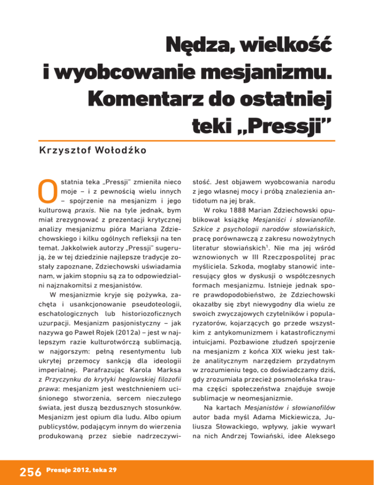 Nędza, wielkość i wyobcowanie mesjanizmu. Komentarz do ostatniej teki „Pressji” Krzysztof Wołodźko O statnia teka „Pressji” zmieniła nieco moje − i z pewnością wielu innych − spojrzenie na mesjanizm i jego kulturową praxis. Nie na tyle jednak, bym miał zrezygnować z prezentacji krytycznej analizy mesjanizmu pióra Mariana Zdziechowskiego i kilku ogólnych refleksji na ten temat. Jakkolwiek autorzy „Pressji” sugerują, że w tej dziedzinie najlepsze tradycje zostały zapoznane, Zdziechowski uświadamia nam, w jakim stopniu są za to odpowiedzialni najznakomitsi z mesjanistów. W mesjanizmie kryje się pożywka, zachęta i usankcjonowanie pseudoteologii, eschatologicznych lub historiozoficznych uzurpacji. Mesjanizm pasjonistyczny − jak nazywa go Paweł Rojek (2012a) − jest w najlepszym razie kulturotwórczą sublimacją, w najgorszym: pełną resentymentu lub ukrytej przemocy sankcją dla ideologii imperialnej. Parafrazując Karola Marksa z Przyczynku do krytyki heglowskiej filozofii prawa: mesjanizm jest westchnieniem uciśnionego stworzenia, sercem nieczułego świata, jest duszą bezdusznych stosunków. Mesjanizm jest opium dla ludu. Albo opium publicystów, podającym innym do wierzenia produkowaną przez siebie nadrzeczywi- 256 Pressje 2012, teka 29 stość. Jest objawem wyobcowania narodu z jego własnej mocy i próbą znalezienia antidotum na jej brak. W roku 1888 Marian Zdziechowski opublikował książkę Mesjaniści i słowianofile. Szkice z psychologii narodów słowiańskich, pracę porównawczą z zakresu nowożytnych literatur słowiańskich1. Nie ma jej wśród wznowionych w III Rzeczpospolitej prac myśliciela. Szkoda, mogłaby stanowić interesujący głos w dyskusji o współczesnych formach mesjanizmu. Istnieje jednak spore prawdopodobieństwo, że Zdziechowski okazałby się zbyt niewygodny dla wielu ze swoich zwyczajowych czytelników i popularyzatorów, kojarzących go przede wszystkim z antykomunizmem i katastroficznymi intuicjami. Pozbawione złudzeń spojrzenie na mesjanizm z końca XIX wieku jest także analitycznym narzędziem przydatnym w zrozumieniu tego, co doświadczamy dziś, gdy zrozumiała przecież posmoleńska trauma części społeczeństwa znajduje swoje sublimacje w neomesjanizmie. Na kartach Mesjanistów i słowianofilów autor bada myśl Adama Mickiewicza, Juliusza Słowackiego, wpływy, jakie wywarł na nich Andrzej Towiański, idee Aleksego Chomiakowa i pierwszych słowianofilów rosyjskich, Zygmunta Krasińskiego, Tarasa Szewczenki, Mikołaja Gogola i chorwackiego poety Piotra Preradowicza. Metoda badawcza Zdziechowskiego opiera się na Posmoleńska trauma znajduje swoje sublimacje w neomesjanizmie psychologii narodów, sformułowanej przez Hipolita Taine’a, i na badaniach porównawczych. Celem Zdziechowskiego jest „stanąć na taine’owskim stanowisku psychologii jednostek i szczepów i zajrzeć w głąb duszy autora oraz narodu, który go wydał, a następnie […] ogarnąć okiem pokrewne objawy wśród innych narodów i plemion” (s. V−VI). W niniejszym artykule przedstawię przede wszystkim mesjanizm Adama Mickiewicza, w mniejszym stopniu Juliusza Słowackiego oraz wpływ Andrzeja Towiańskiego na poetów, oglądane oczyma Zdziechowskiego. Kontrapunktem będzie prezentacja idei słowianofilskich Rosjan, analizowanych przez polskiego myśliciela w świetle rodzimych mesjanizmów. U źródeł mesjanizmu Mickiewicza Szukając genezy XIX-wiecznego mesjanizmu, stwierdza Zdziechowski: „Rozpowszechniony w Europie od czasu wojen Napoleona I ruch narodowościowy przejawił się pośród narodów słowiańskich w formie mistycznej wiary w opatrznościowe ich posłannictwo, w przyszłe moralne, a na chrześcijańskim gruncie oparte odrodzenie zmaterializowanej i zbutwiałej Europy, dzięki życiodawczemu pierwiastkowi uczucia, który tylko Słowianie umieli w sobie przechować w pierwotnej czystości i który przeto wprowadzić mają do dziejów świata. Tę szatę mistyczną przybrały dąże- nia narodowe w epoce współczesnej u nas i u naszych pobratymców tylko, niegdyś zaś u Żydów” (s. VI). Źródłem mesjanizmu jest zatem ucisk, świadomość braku podmiotowości, dążenie do samookreślenia w świecie, który tożsamość słabszych stłamsił i zlekceważył. Lecz to wyobcowanie z własnej państwowości i wolności (przez brak niepodległości lub despotyzm władzy) sprawia, że mesjanizm jest ideologią fantasmagoryczną, choć potężną jako element kulturalnej czy ideologicznej samoświadomości i samoorganizacji narodów. Zrozumienie i krytyka mesjanizmu nie musi zatem oznaczać nihilistycznej chęci zaprzeczenia wartościom cennym dla danego narodu. Jest krytyką „sytuacji mesjanistycznej” jako jeszcze jednej formy zniewolenia, dokonującej się przez samodzielnie tworzoną mistyfikację. Jakie są źródła mesjanizmu Mickiewicza? Zdziechowski zwraca uwagę na religijne, katolickie wychowanie wieszcza oraz jego silną uczuciowość i poetycką, wybujałą wyobraźnię, które stały się fundamentem fascynacji mistycyzmem. Z tym połączona była patriotyczna postawa autora Pana Tadeusza, zaszczepiona mu jeszcze w czasach studiów w Wilnie, gdzie w kręgu przyjaciół i profesorów poznawał, co to nauka, cnota, ojczyzna. Późniejsze wypadki i doświadczenia roku 1831 stanowią cezurę, która sprawi, że mesjanizm stanie się duchową pociechą i ideologiczną formą zaradzenia tragedii narodowej. To zbiorowe doświadczenie stanie się także udziałem Mickiewicza. Choć Zdziechowski krytycznie ocenia mesjanizm, następująco wyjaśnia tę kwestię: sytuacja narodu była beznadziejna, tak relacje międzynarodowe, jak słabość wewnętrzna, stąd „jedyna nadzieja i ucieczka była w Bogu. […] Idąc tą drogą rozumowań, poeci nasi przyszli wkrótce do wiary w opatrznościowe posłannictwo Polski, a opierali ją jedni na Nędza, wielkość i wyobcowanie mesjanizmu 257 gruncie kat
