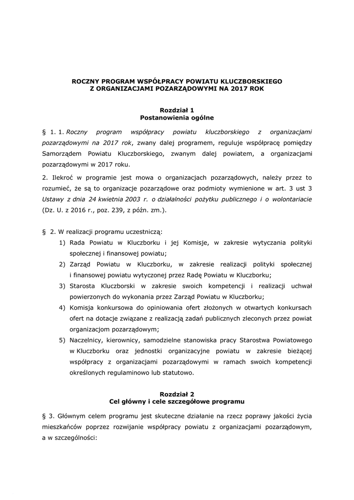 ROCZNY PROGRAM WSPÓŁPRACY POWIATU KLUCZBORSKIEGO Z ORGANIZACJAMI POZARZĄDOWYMI NA 2017 ROK Rozdział 1 Postanowienia ogólne § 1. 1. Roczny program współpracy powiatu kluczborskiego z organizacjami pozarządowymi na 2017 rok, zwany dalej programem, reguluje współpracę pomiędzy Samorządem Powiatu Kluczborskiego, zwanym dalej powiatem, a organizacjami pozarządowymi w 2017 roku. 2. Ilekroć w programie jest mowa o organizacjach pozarządowych, należy przez to rozumieć, że są to organizacje pozarządowe oraz podmioty wymienione w art. 3 ust 3 Ustawy z dnia 24 kwietnia 2003 r. o działalności pożytku publicznego i o wolontariacie (Dz. U. z 2016 r., poz. 239, z późn. zm.). § 2. W realizacji programu uczestniczą: 1) Rada Powiatu w Kluczborku i jej Komisje, w zakresie wytyczania polityki społecznej i finansowej powiatu; 2) Zarząd Powiatu w Kluczborku, w zakresie realizacji polityki społecznej i finansowej powiatu wytyczonej przez Radę Powiatu w Kluczborku; 3) Starosta Kluczborski w zakresie swoich kompetencji i realizacji uchwał powierzonych do wykonania przez Zarząd Powiatu w Kluczborku; 4) Komisja konkursowa do opiniowania ofert złożonych w otwartych konkursach ofert na dotacje związane z realizacją zadań publicznych zleconych przez powiat organizacjom pozarządowym; 5) Naczelnicy, kierownicy, samodzielne stanowiska pracy Starostwa Powiatowego w Kluczborku oraz jednostki organizacyjne powiatu w zakresie bieżącej współpracy z organizacjami pozarządowymi w ramach swoich kompetencji określonych regulaminowo lub statutowo. Rozdział 2 Cel główny i cele szczegółowe programu § 3. Głównym celem programu jest skuteczne działanie na rzecz poprawy jakości życia mieszkańców poprzez rozwijanie współpracy powiatu z organizacjami pozarządowym, a w szczególności: 1) Wprowadzanie nowatorskich i bardziej efektywnych metod realizacji zadań publicznych oraz zaspakajania potrzeb społeczności lokalnej; 2) Wykorzystanie w zakresie potencjału rozpoznawania merytorycznego potrzeb organizacji społeczności lokalnej, pozarządowych a tym samym właściwego planowania nowych rozwiązań doraźnych i strategicznych; 3) Stworzenie warunków do zwiększania aktywności społecznej mieszkańców; 4) Odciążenie budżetu powiatu poprzez wspieranie pozyskiwania środków zewnętrznych na realizację zadań publicznych; 5) Zaspokojenie potrzeb społecznych poprzez pełniejszą realizację zadań powiatu określonych w ustawach. Rozdział 3 Zasady współpracy § 4. 1. Współpraca powiatu z organizacjami pozarządowymi opierać się będzie na zasadach określonych w art. 5 ust. 3 Ustawy o działalności pożytku publicznego i o wolontariacie. 2. Współpraca powiatu z organizacjami pozarządowymi może mieć charakter finansowy i pozafinansowy. Rozdział 4 Zakres przedmiotowy § 5. Zakres przedmiotowy programu określa art. 4 Ustawy o działalności pożytku publicznego i o wolontariacie. Przedmiotem współpracy powiatu z podmiotami prowadzącymi działalność pożytku publicznego jest zatem: 1) Realizacja zadań powiatu określonych w ustawach; 2) Podwyższenie jakości i efektywności działań kierowanych do mieszkańców powiatu; 3) Określanie potrzeb społecznych i sposobu ich zaspokajania; 4) Konsultowanie projektu uchwały w sprawie uchwalenia „Rocznego programu współpracy powiatu kluczborskiego z organizacjami pozarządowymi na kolejny rok” na etapie jego tworzenia. Rozdział 5 Formy współpracy § 6. Współpraca powiatu z organizacjami pozarządowymi może odbywać się w formach określonych w art. 5 ust. 2 Ustawy o działalności pożytku publicznego i o wolontariacie, jak również poprzez: 1) Współpracę i udzielanie pomocy w zakresie pozyskiwania środków finansowych z innych źródeł; 2) Promocję działalności organizacji pozarządowych na stronie internetowej powiatu kluczborskiego oraz w lokalnych mediach; 3) Pomoc w nawiązaniu przez organizacje pozarządowe kontaktów ponadgminnych i międzynarodowych. Rozdział 6 Priorytetowe zadania publiczne § 7. 1. Obszary współpracy powiatu z organizacjami pozarządowymi dotyczą zakresu zadań publicznych określonych w art. 4 ust. 1 Ustawy o działalności pożytku publicznego i o wolontariacie. 2. W 2017 roku priorytetowe zadania publiczne obejmują działania z zakresu: 1) Pomocy społecznej, w tym pomocy rodzinom i osobom w trudnej sytuacji życiowej oraz wyrównywania szans tych rodzin i osób; 2) Udzielania nieodpłatnej pomocy prawnej oraz zwiększenia świadomości prawnej społeczeństwa; 3) Ochrony i promocji zdrowia; 4) Działalności na rzecz osób w wieku emerytalnym; 5) Nauki, szkolnictwa wyższego, edukacji, oświaty i wychowania; 6) Wypoczynku dzieci i młodzieży; 7) Kultury, sztuki, ochrony dóbr kultury i dziedzictwa narodowego; 8) Wspierania i upowszechniania kultury fizycznej; 9) Turystyki i krajoznawstwa; 10) Działalności na rzecz kombatantów i osób represjonowanych. Rozdział 7 Okres realizacji programu § 8. Roczny program współpracy powiatu kluczborskiego z organizacjami pozarządowymi na 2017 rok realizowany będzie od 1 stycznia 2017 roku do 31 grudnia 2017 roku. Rozdział 8 Sposób realizacji programu § 9. 1. Udział organizacji pozarządowych w wykonywaniu zadań publicznych realizowanych przez powiat w zakresie określonym w § 7. zapewnia się przez zlecanie realizacji zadań podmiotom prowadzącym działalność pożytku publicznego odpowiednio do terytorialnego zakresu działania powiatu oraz których działalność statutowa jest zgodna z dziedziną zlecanego zadania. 2. Program będzie realizowany między innymi poprzez: 1) Zlecanie przez Zarząd Powiatu w Kluczborku realizacji zadań publicznych organizacjom pozarządowym. Zlecenie realizacji zadania publicznego odbywa się w trybie ogłaszanych przez Zarząd Powiatu w Kluczborku otwartych konkursach ofert. Zlecanie realizacji zadania publicznego może mieć formę wsparcia lub powierzenia wykon