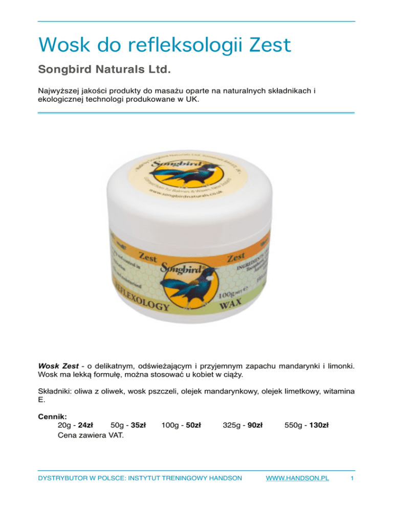 Wosk do refleksologii Zest! Songbird Naturals Ltd.! ! Najwyższej jakości produkty do masażu oparte na naturalnych składnikach i ekologicznej technologi produkowane w UK.! ! ! Wosk Zest - o delikatnym, odświeżającym i przyjemnym zapachu mandarynki i limonki. Wosk ma lekką formułę, można stosować u kobiet w ciąży. ! Składniki: oliwa z oliwek, wosk pszczeli, olejek mandarynkowy, olejek limetkowy, witamina E. ! Cennik: 20g - 24zł 50g - 35zł Cena zawiera VAT.! 100g - 50zł 325g - 90zł 550g - 130zł! ! DYSTRYBUTOR W POLSCE: INSTYTUT TRENINGOWY HANDSON WWW.HANDSON.PL 1 ! Zamówienia: poprzez email: [email protected] ! Należy podać: nazwę produktu, wielkość opakowania, ilość sztuk, adres wysyłki i ! dane do faktury.! ! ! Koszt wysyłki (Poczta Polska) pokrywa osoba zamawiająca. Przy zamówieniach ! powyżej 250zł koszty wysyłki pokrywa HandsOn.! ! Termin realizacji: 7 dni od zamówienia.! Informacje: tel. 601 50 40 50, [email protected] ! ! Sprawdź też inne nasze produkty do masażu, refleksoterapii, uwalniania mięśniowopowięziowego czy do codziennej pielęgnacji:! ! Relaxation Massage Wax, Woman's Blend Massage Wax, Lavender Massage Wax, Orange Spice Massage Wax, Herbal Lift Massage Wax, Pacific Nights Massage Wax, Mountain Forest Massage Wax, Vanilla Massage Wax, Zest Massage Wax, Unscented Massage Wax.! ! Reflexology Wax - Tea Tree and Mint, Reflexology Wax - Lavender, Reflexology Wax Zest, Reflexology Wax - Unscented.! ! Bee Balm, Cooling and Soothing Balm, Lip Balm Vanilla 20g, Throat and Chest Balm, Warming and Easing Balm.! ! Fascial Release Wax. ! ! DYSTRYBUTOR W POLSCE: INSTYTUT TRENINGOWY HANDSON WWW.HANDSON.PL 2 Zapraszamy również na kursy masażu, nowoczesnych form fizjoterapii oraz pracy z ciałem, więcej informacji na stronie: http://handson.pl/kursy.html DYSTRYBUTOR W POLSCE: INSTYTUT TRENINGOWY HANDSON WWW.HANDSON.PL 3