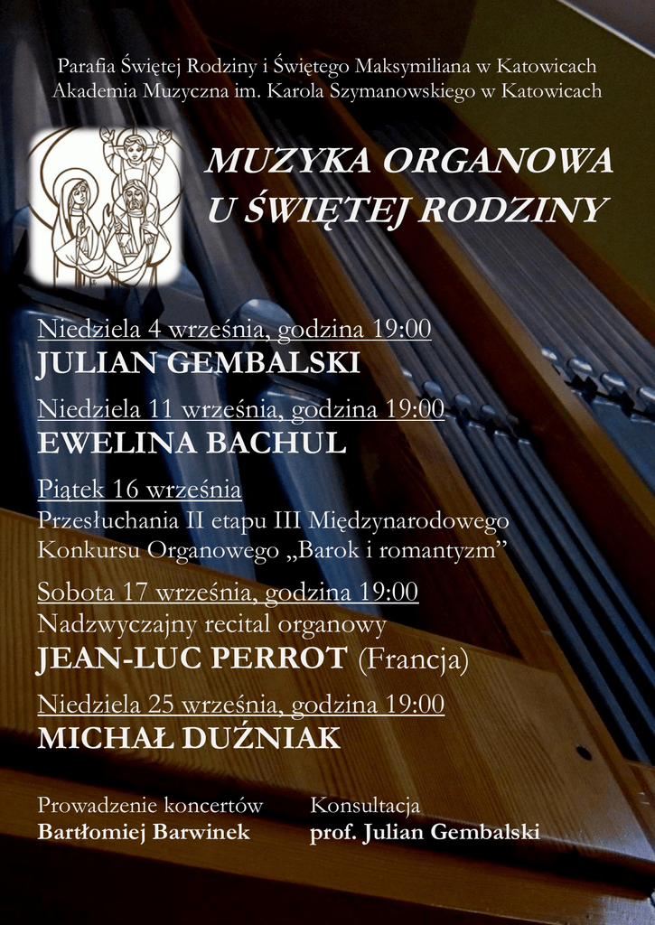 Parafia Świętej Rodziny i Świętego Maksymiliana w Katowicach Akademia Muzyczna im. Karola Szymanowskiego w Katowicach MUZYKA ORGANOWA U ŚWIĘTEJ RODZINY Niedziela 4 września, godzina 19:00 JULIAN GEMBALSKI Niedziela 11 września, godzina 19:00 EWELINA BACHUL Piątek 16 września Przesłuchania II etapu III Międzynarodowego Konkursu Organowego „Barok i romantyzm” Sobota 17 września, godzina 19:00 Nadzwyczajny recital organowy JEAN-LUC PERROT (Francja) Niedziela 25 września, godzina 19:00 MICHAŁ DUŹNIAK Prowadzenie koncertów Bartłomiej Barwinek Konsultacja prof. Julian Gembalski
