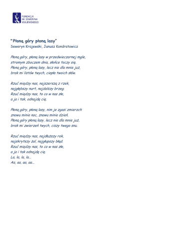 " Płoną góry płoną lasy” Seweryn Krajewski, Janusz Kondratowicz Płoną góry, płoną lasy w przedwieczornej mgle, stromym zboczem dnia, słońce toczy się. Płoną góry, płoną lasy, lecz nie dla mnie już, brak mi listów twych, ciepła twoich słów. Rzuć między nas, najszerszą z rzek, najgłębszy nurt, najdalszy brzeg. Rzuć między nas, to co w nas złe, a ja i tak, odnajdę cię. Płoną góry, płoną lasy, nim je zgasi zmierzch znowu minie noc, znowu minie dzień. Płoną góry płoną lasy, lecz nie dla mnie już, brak mi zwierzeń twych, ciszy twego snu. Rzuć między nas, najdłuższy rok, najskrytszy żal, najgłupszy błąd. Rzuć między nas, to co w nas złe, a ja i tak odnajdę cię. La, la, la, la... Aa, aa, aa, aa...