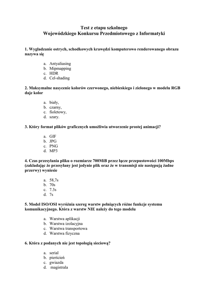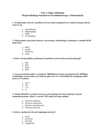 Test z etapu szkolnego Wojewódzkiego Konkursu Przedmiotowego z Informatyki 1. Wygładzanie ostrych, schodkowych krawędzi komputerowo renderowanego obrazu nazywa się a. b. c. d. Antyaliasing Mipmapping HDR Cel-shading 2. Maksymalne nasycenie kolorów czerwonego, niebieskiego i zielonego w modelu RGB daje kolor a. b. c. d. biały, czarny, fioletowy, szary. 3. Który format plików graficznych umoŜliwia utworzenie prostej animacji? a. b. c. d. GIF JPG PNG MP3 4. Czas przesyłania pliku o rozmiarze 700MiB przez łącze przepustowości 100Mbps (zakładając Ŝe przesyłany jest jedynie plik oraz Ŝe w transmisji nie następują Ŝadne przerwy) wyniesie a. b. c. d. 58,7s 70s 7.3s 7s 5. Model ISO/OSI wyróŜnia szereg warstw pełniących róŜne funkcje systemu komunikacyjnego. Która z warstw NIE naleŜy do tego modelu a. b. c. d. Warstwa aplikacji Warstwa izolacyjna Warstwa transportowa Warstwa fizyczna 6. Która z podanych nie jest topologią sieciową? a. b. c. d. serial pierścień gwiazda magistrala 7. Licencjonowanie open-source oznacza, Ŝe program a. b. c. d. nie moŜe zostać wykorzystany w celach komercyjnych. nie moŜe być modyfikowany w celu wprowadzenia w nim zmian. nie moŜe być rozprowadzany bez własnego kodu źródłowego. wymaga ręcznej kompilacji z postaci źródłowej. 8. WskaŜ urządzenie, które nie jest wykorzystywane przy łączeniu komputerów w sieć. a. b. c. d. Hub Koncentrator Predator Terminator 9. W terminologii protokołu DNS www.lodz.pl to: a. b. c. d. domena adres obszar końcówka 10. Która z poniŜszych instrukcji języków rodziny C (C/C++, Java, C#) nie jest instrukcją warunkową? a. b. c. d. swith if while break 11. Który z poniŜszych języków pozwala na programowanie na najniŜszym poziomie: a. b. c. d. C/C++ Java Python Bash 12. Językiem wysokiego poziomu nie jest a. b. c. d. Java Matlab Asembler C# 13. Które z poniŜszych wartości zmiennych “a” i “b” uczynią, Ŝe ten warunek zapisany w języku C będzie prawdziwy? if ( (a>b) && b==12 || a*b==0 && a+b<10 ) a. a=3 i b=12 b. a=15 i b=10 c. a=0 i b=12 d. a=0 i b = 3 14. C# jest językiem a. b. c. d. strukturalnym. obiektowym. naturalnym. niskiego poziomu. 15. Za pomocą Visual Studio 2010 NIE moŜemy tworzyć a. b. c. d. aplikacji na telefon iPhone. aplikacji Windows Forms. aplikacji konsolowych i serwerowych. aplikacji typu Silverlight. 16. Który z poniŜszych elementów został wprowadzony w HTML5: a. b. c. d. div meta canvas applet 17. Który znacznik określa element listy nienumerowanej? a. b. c. d. ul ol li p 18. Czym jest jQuery? a. b. c. d. biblioteką funkcji JavaScript plikiem multimedialnym wtyczką do przeglądarki zbiorem zasad tworzenia stron internowych 19. Na jakim porcie pracuje usługa WWW? a. 40 b. 80 c. 96 d. 110 20. Aby na stronie internetowej zamieścić ruchomą animację NIE wykorzystasz technologii a. JavaScript b. Flash c. CSS3 d. PHP 21. Gdy fragment tekstu obejmiemy definicją <FONT SIZE=-1></FONT>, to czcionka tekstu będzie mieć wielkość a. b. c. d. 3 punktów 2 punktów 4 punktów 1 punktów 22. Aby w programie Microsoft Excel odwołać się do komórki w innym arkuszu, wykorzystasz symbol: a. b. c. d. $ & % ! 23. W komórce AB72 wpisana jest formuła „=SUMA(A3;B4)”. Do której komórki spośród podanych moŜna tę formułę skopiować? a. b. c. d. BA68 AB69 BB70 AA71 24. WskaŜ komórkę, która sąsiaduje z komórką CU523. a. b. c. d. CW523 CS523 CT523 CX523 25. Wynikiem formuły „=WYBIERZ(2^3;2;3;4;5;6;7;8;9)” jest liczba a. b. c. d. 4 6 8 9 26. Do przesyłania stron HTML przeglądarki wykorzystują protokoły a. b. c. d. FTP i SFTP Gopher i Gopher+ HTTP i HTTPS POP3 i SMTP 27. Który z poniŜszych protokołów NIE zostanie wykorzystany podczas wpisania przez uŜytkownika w polu przeglądarki internetowej adresu URL i załadowaniu strony? a. b. c. d. HTTP TCP DNS FTP 28. Którego z podanych adresów IP nie znajdziemy w Internecie? a. b. c. d. 38.176.55.44 131.107.5.65 190.5.7.126 192.168.3.4 29. Protokół SMTP w realizacji usług poczty elektronicznej słuŜy do: a. b. c. d. pobierania wiadomości z serwera wysyłania nowej wiadomości konfigurowania programu klienckiego przeglądanie wiadomości w sieci lokalnej 30. Jaki wyraz symbolizuje litera d na końcu nazwy usługi w httpd i mysqld? a. b. c. d. Demon Digit Defrag Domena 31. WskaŜ protokół wykorzystywany w sieci Internet. a. b. c. d. NetBUI IPX/SPX TCP/IP SPX/IPX 32. Port USB zgodnie ze specyfikacją podłączone urządzenia moŜe zasilać prądem stałym o napięciu i natęŜeniu: a. b. c. d. 5V i 500mA 2.5V i 900A 1V i 100mA 10V i 200mA 33. Rozdzielczość aparatów cyfrowych zaleŜy od a. b. c. d. parametrów matrycy światłoczułej pojemności pamięci aparatu fotograficznego parametrów obiektywu parametrów migawki 34. Który z programów nie jest serwerem WWW a. b. c. d. IIS Apacze PWS FileZilla 35. Który z poniŜszych algorytmów będzie najszybszy podczas sortowania ogromnego zbioru danych, w którym losowo zamieniono ze sobą kilka par sąsiednich elementów: a. b. c. d. Quicksort sortowanie przez scalanie sortowanie za pomocą kopca binarnego sortowanie bąbelkowe 36. Standardowym językiem zapytań do komputerowych baz danych jest: a. b. c. d. NoSQL SQL uproszczony angielski DDL 37. W terminologii struktur danych w bazach danych wyróŜnia się: a. b. c. d. bazy danych, tabele i rekordy tabele, klasy i wpisy katalogi, klasy i obiekty archiwa, relacje i obiekty 38. Aby wprowadzić zaleŜności pomiędzy tabelami wprowadza się: a. b. c. d. dowiązania odnośniki hiperłącza relacje 39. Zakładając konto na serwisach udostępniających hosting www w Polsce najczęściej otrzymuje się do dyspozycji bazę danych: a. b. c. d. PostgreSQL MySQL Oracle Database Microsoft SQL 40. Język stanowiący część strony www, a który NIE połączy się z bazą danych działającą lokalnie na serwerze, to: a. b. c. d. PHP Javascript Java C# 41. Wydruk pism stworzonych w ed