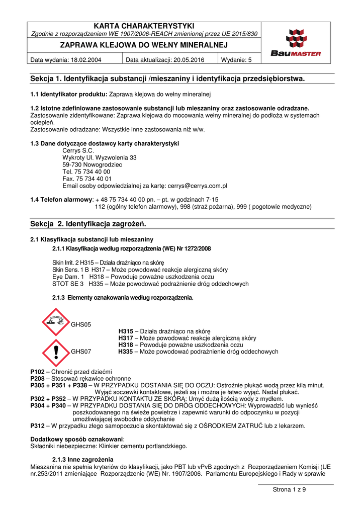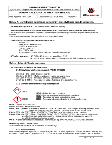 KARTA CHARAKTERYSTYKI Zgodnie z rozporządzeniem WE 1907/2006-REACH zmienionej przez UE 2015/830 ZAPRAWA KLEJOWA DO WEŁNY MINERALNEJ Data wydania: 18.02.2004 Data aktualizacji: 20.05.2016 Wydanie: 5 Sekcja 1. Identyfikacja substancji /mieszaniny i identyfikacja przedsiębiorstwa. 1.1 Identyfikator produktu: Zaprawa klejowa do wełny mineralnej 1.2 Istotne zdefiniowane zastosowanie substancji lub mieszaniny oraz zastosowanie odradzane. Zastosowanie zidentyfikowane: Zaprawa klejowa do mocowania wełny mineralnej do podłoża w systemach ociepleń. Zastosowanie odradzane: Wszystkie inne zastosowania niż w/w. 1.3 Dane dotyczące dostawcy karty charakterystyki Cerrys S.C. Wykroty Ul. Wyzwolenia 33 59-730 Nowogrodziec Tel. 75 734 40 00 Fax. 75 734 40 01 Email osoby odpowiedzialnej za kartę: [email protected] 1.4 Telefon alarmowy: + 48 75 734 40 00 pn. – pt. w godzinach 7-15 112 (ogólny telefon alarmowy), 998 (straż pożarna), 999 ( pogotowie medyczne) Sekcja 2. Identyfikacja zagrożeń. 2.1 Klasyfikacja substancji lub mieszaniny 2.1.1 Klasyfikacja według rozporządzenia (WE) Nr 1272/2008 Skin Irrit. 2 H315 – Działa drażniąco na skórę Skin Sens. 1 B H317 – Może powodować reakcje alergiczną skóry Eye Dam. 1 H318 – Powoduje poważne uszkodzenia oczu STOT SE 3 H335 – Może powodować podrażnienie dróg oddechowych 2.1.3 Elementy oznakowania według rozporządzenia. GHS05 GHS07 H315 – Działa drażniąco na skórę H317 – Może powodować reakcje alergiczną skóry H318 – Powoduje poważne uszkodzenia oczu H335 – Może powodować podrażnienie dróg oddechowych P102 – Chronić przed dziećmi P208 – Stosować rękawice ochronne P305 + P351 + P338 – W PRZYPADKU DOSTANIA SIĘ DO OCZU: Ostrożnie płukać wodą przez kila minut. Wyjąć soczewki kontaktowe, jeżeli są i można je łatwo wyjąć. Nadal płukać. P302 + P352 – W PRZYPADKU KONTAKTU ZE SKÓRĄ: Umyć dużą ilością wody z mydłem. P304 + P340 – W PRZYPADKU DOSTANIA SIĘ DO DRÓG ODDECHOWYCH: Wyprowadzić lub wynieść poszkodowanego na świeże powietrze i zapewnić warunki do odpoczynku w pozycji umożliwiającej swobodne oddychanie P312 – W przypadku złego samopoczucia skontaktować się z OŚRODKIEM ZATRUĆ lub z lekarzem. Dodatkowy sposób oznakowani: Składniki niebezpieczne: Klinkier cementu portlandzkiego. 2.1.3 Inne zagrożenia Mieszanina nie spełnia kryteriów do klasyfikacji, jako PBT lub vPvB zgodnych z Rozporządzeniem Komisji (UE nr.253/2011 zmieniające Rozporządzenie (WE) Nr. 1907/2006. Parlamentu Europejskiego i Rady w sprawie Strona 1 z 9 KARTA CHARAKTERYSTYKI Zgodnie z rozporządzeniem WE 1907/2006-REACH zmienionej przez UE 2015/830 ZAPRAWA KLEJOWA DO WEŁNY MINERALNEJ Data wydania: 18.02.2004 Data aktualizacji: 20.05.2016 Wydanie: 5 rejestracji, oceny, udzielania zezwoleń i zastosowanych ograniczeń w zakresie chemikaliów (REACH) w odniesieniu do załącznika XIII. Sekcja 3. Skład / informacje o składnikach. 3.1 Substancje 3.2 Mieszaniny Substancja/ Nazwa chemiczna Zawartość % NR. WE NR. CAS Klasyfikacja Piasek kwarcowy > 62 - 14808-60-7 Nie podlega klasyfikacji Klinkier Cementu portlandzkiego * > 32 266-043-4 65997-15-1 STOT SE 3 .1 H 335, Skin Irrit. 2 H315 Skin Sens. 1 B H 317 Eye Dam. 1 H318 Wodorotlenek wapnia >2 215-137-3 1305-62-0 Skin Irrit. 2 H315 Eye Dam.1 H318 STOT SE 3 H 335, * Zawartość rozpuszczalnego chromu (VI) jest zgodna z wymaganiami dyrektywy WE 2003/53/WE; ograniczona do 0, 0002 % (2 ppm) lub mniej w odniesieniu do suchej masy. Znaczenie zwrotów – sekcja 16 Sekcja 4. Środki pierwszej pomocy. 4.1 Opis środków pierwszej pomocy W przypadku wdychania Osobę poszkodowaną wyprowadzić/wynieść na świeże powietrze i pozwolić odpocząć w pozycji ułatwiającej oddychanie. W przypadku utrzymywania się dolegliwości zasięgnąć porady lekarza. W przypadku kontaktu ze skórą Zdjąć zabrudzoną odzież oraz obuwie. Zanieczyszczoną skórę umyć dużą ilością wody z mydłem lub innym odpowiednim środkiem myjącym. Zasięgnąć porady lekarza w przypadku utrzymywania się cech podrażnienia skóry. W przypadku kontaktu z oczami Wyjąć soczewki kontaktowe, jeśli są. Otworzyć szeroko powieki i dokładnie płukać oczy dużą ilości czystej wody, przez co najmniej 20 min. Zasięgnąć porady lekarza w przypadku utrzymującego się podrażnienia. W przypadku spożycia Wypłukać jamę ustną. Niezwłocznie zasięgnąć porady lekarza i przedstawić opakowanie/etykietę lub kartę charakterystyki preparatu. 4.2 Najważniejsze ostre i opóźnione objawy oraz skutki narażenia. W przypadku wdychania: kaszel, podrażnienie gardła. W przypadku kontaktu ze skórą; zaczerwienienie, podrażnienie, może powodować reakcje alergiczne. W przypadku kontaktu z oczami: podrażnienie, zaczerwienienie. Strona 2 z 9 KARTA CHARAKTERYSTYKI Zgodnie z rozporządzeniem WE 1907/2006-REACH zmienionej przez UE 2015/830 ZAPRAWA KLEJOWA DO WEŁNY MINERALNEJ Data wydania: 18.02.2004 Data aktualizacji: 20.05.2016 Wydanie: 5 W przypadku spożyciu: nudności. 4.3 Wskazania dotyczące wszelkiej natychmiastowej pomocy lekarskiej i szczególnego postępowania z poszkodowanym. Decyzję o sposobie postępowania podejmuje lekarz po ocenie stanu poszkodowanego. Sekcja 5. Postępowanie w przypadku pożaru. Preparat nie jest palny. 5.1 Środki gaśnicze: Mgła wodna, piana gaśnicza, gaśnice CO2, gaśnice proszkowe z środkiem gaszącym ABC lub BC oraz inne powszechnie stosowane środki gaśnicze w zależności od otoczenia. Nieodpowiednie środki gaśnicze: Unikać stosowania zwartego strumienia wody pod wysokim ciśnieniem. 5.2 Szczególne zagrożenia związane z substancją lub mieszaniną. Nie wdychać dymów i gazów wytwarzanych podczas pożaru. Produkty spalania mogą zawierać tlenki węgla, tlenki azotu oraz inne niebezpieczne gazy oraz dymy. 5.3 Informacje dla straży pożarnej: Postępować zgodnie z procedurami obowiązującymi przy gaszeniu pożarów chemi
