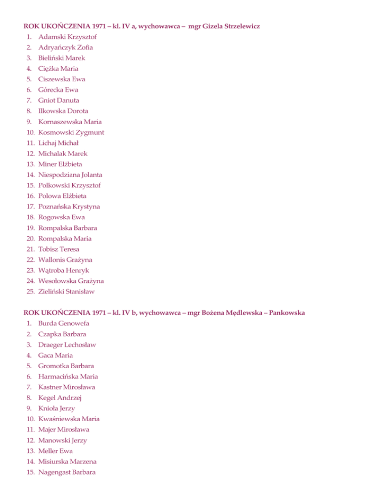 ROK UKOŃCZENIA 1971 – kl. IV a, wychowawca – mgr Gizela Strzelewicz 1. Adamski Krzysztof 2. Adryańczyk Zofia 3. Bieliński Marek 4. Ciężka Maria 5. Ciszewska Ewa 6. Górecka Ewa 7. Gniot Danuta 8. Ilkowska Dorota 9. Kornaszewska Maria 10. Kosmowski Zygmunt 11. Lichaj Michał 12. Michalak Marek 13. Miner Elżbieta 14. Niespodziana Jolanta 15. Polkowski Krzysztof 16. Polowa Elżbieta 17. Poznańska Krystyna 18. Rogowska Ewa 19. Rompalska Barbara 20. Rompalska Maria 21. Tobisz Teresa 22. Wallonis Grażyna 23. Wątroba Henryk 24. Wesołowska Grażyna 25. Zieliński Stanisław ROK UKOŃCZENIA 1971 – kl. IV b, wychowawca – mgr Bożena Mędlewska – Pankowska 1. Burda Genowefa 2. Czapka Barbara 3. Draeger Lechosław 4. Gaca Maria 5. Gromotka Barbara 6. Harmacińska Maria 7. Kastner Mirosława 8. Kegel Andrzej 9. Knioła Jerzy 10. Kwaśniewska Maria 11. Majer Mirosława 12. Manowski Jerzy 13. Meller Ewa 14. Misiurska Marzena 15. Nagengast Barbara 16. Nowak Halina 17. Radziejewska Aniela 18. Sikorska Elżbieta 19. Sytniewska Ewa 20. Szurbik Antoni 21. Zubiel Marek ROK UKOŃCZENIA 1972 – kl. IV a, wychowawca – mgr Henryk Zieliński 1. Banach Gabriela 2. Brukwicka Urszula 3. Brudnik Maria 4. Budziński Andrzej 5. Damska Ewa 6. Ferensztajn Grażyna 7. Gajtkowska Gizela 8. Gołata Maria 9. Grzeszczak Małgorzata 10. Jachimiak Eugeniusz 11. Karczmarczyk Bogumiła 12. Kempiński Jerzy 13. Kensy Ewa 14. Knioła Ryszard 15. Korzeniowska Teresa 16. Kozak Anita 17. Kucharska Teresa 18. Kukla Jolanta 19. Lasik Aleksander 20. Lubiszewska Małgorzata 21. Meller Izabela 22. Michałek Regina 23. Pilarska Krystyna 24. Pipała Teresa 25. Pospieszony Kazimierz 26. Przybylski Marian 27. Pyda Marek 28. Semrau Maria 29. Swalska Teresa 30. Sytniewska Anna 31. Warmbier Danuta ROK UKOŃCZENIA 1972 – kl. IV b, wychowawca – mgr Zbigniew Znaniecki 1. Bauman Henryka 2. Błaszczyńska Elżbieta 3. Boguszewska Maria 4. Brzeziński Maciej 5. Busz Stanisław 6. Filip Teresa 7. Grochal Anna 8. Gruszczyński Paweł 9. Jasieniecka Teresa 10. Michalski Grzegorz 11. Rogowski Roman 12. Stucka Gabriela 13. Tadych Grażyna 14. Tadych Halina 15. Tomaszewski Bogdan 16. Tomaszczyk Jolanta 17. Wilczyńska Krystyna 18. Windyk Małgorzata 19. Wiśniewski Ryszard 20. Zimorski Zbigniew ROK UKOŃCZENIA 1972 – kl. IV c, wychowawca – mgr Wojciech Rumiński 1. Bączkowski Kazimierz 2. Boniowska Danuta 3. Daroń Beniamina 4. Dolatowska Ewa 5. Dolińska Alicja 6. Felcyn Julian 7. Gliszczyńska Elżbieta 8. Grabowska Eugenia 9. Jakubczak Wiesława 10. Kinderman Andrzej 11. Knioła Krystyna 12. Koniec Wojciech 13. Małek Halina 14. Mazurkiewicz Andrzej 15. Milczek Grzegorz 16. Molka Maria 17. Myszkowski Adam 18. Nowak Stanisław 19. Nowakowska Elżbieta 20. Orłowski Alojzy 21. Pogorzelczyk Aurelia 22. Redlak Małgorzata 23. Suchała Regina 24. Winiaszewska Teresa ROK UKOŃCZENIA 1973 – kl. IV a, wychowawca – Franciszek Domisiewicz 1. Balik Halina 2. Baran Sławomir 3. Blechacz Roman 4. Błowacka Maria 5. Bocian Urszula 6. Burzyńska Ewa 7. Depta Danuta 8. Dobosz Andrzej 9. Draeger Maria 10. Gąsioroski Adam 11. Gorączko Wiesław 12. Górna Bożena 13. Guth Ilona 14. Kaczmarek Mariola 15. Kala Wiesława 16. Korpal Marek 17. Kupicka Daria 18. Kulig Bogdan 19. Kujawska Hanna 20. Leppert Andrzej 21. Lewandowski Wiesław 22. Majewska Ewa 23. Mieszkowski Marek 24. Mrosczok Anna 25. Nowak Regina 26. Paczkowska Agnieszka 27. Pasierb Urszula 28. Piotrowiak Maria 29. Przyborowski Krzysztof 30. Rybak Maria 31. Schulz Mieczysława 32. Sikorska Maria 33. Siuchniński Roman 34. Sołdan Jan 35. Stanek Jacek 36. Wiśniowski Wiesław ROK UKOŃCZENIA 1973 – kl. IV b, wychowawca – mgr Jan Gorączko 1. Bilicki Mirosław 2. Erdman Grażyna 3. Gliczyńska Danuta 4. Guzek Regina 5. Jędykiewicz Maria 6. Jurewicz Ewa 7. Kaczmarek Aleksandra 8. Kłosińska Katarzyna 9. Kinderman Stanisław 10. Koszucka Maria 11. Koźlikowski Jacek 12. Malińska Halina 13. Mrozińska Krystyna 14. Musiał Stanisław 15. Nagengast Dorota 16. Nurski Andrzej 17. Pacholczyk Genowefa 18. Redlak Maria 19. Rolof Janina 20. Rumińska Barbara 21. Sierży Elżbieta 22. Sowa Krystyna 23. Szkudlarek Laura 24. Szydlak Anna 25. Walczak Maria 26. Wasilewska Bożena 27. Wegner Krystyna 28. Werdin Grażyna 29. Wójtowicz Wojciech 30. Zboralska Ewa ROK UKOŃCZENIA 1973 – kl. IV c, wychowawca – mgr Barbara Kasperowicz 1. Aszkiełowicz Renata 2. Belka Maria 3. Brodzińska Bożena 4. Fohs Bogumiła 5. Garczewska Bożena 6. Gonia Mirosława 7. Guzek Barbara 8. Grochal Maria 9. Hoppe Małgorzata 10. Ignasiak Renata 11. Jankowska Maria 12. Kaczmarek Joanna 13. Klisz Renata 14. Kurpis Tadeusz 15. Kwiatkowska Bogusława 16. Morawski Tadeusz 17. Nowicki Krzysztof 18. Osmólska Sabina 19. Palacz Leszek 20. Rewoliński Adam 21. Samselska Alicja 22. Samselska Marlena 23. Sarosiek Ryszard 24. Szynakiewicz Wiesława 25. Wałęza Eugeniusz 26. Wenta Witosław 27. Winiecka Danuta 28. Woś Iwona 29. Znaniecka Barbara 30. Zubiel Andrzej ROK UKOŃCZENIA 1974 – kl. IV a, wychowawca – mgr Stanisław Pawlak 1. Andrzejewski Roman 2. Biniakowska Mariola 3. Blechacz Elżbieta 4. Ćwikła Mariusz 5. Dembińska Teresa 6. Gładkowicz Jadwiga 7. Guzek Emilia 8. Jasik Grzegorz 9. Juszczyk Genowefa 10. Kamińska Irena 11. Klisz Teresa 12. Kłosiński Andrzej 13. Kowalska Aleksandra 14. Kutowska Grażyna 15. Lemańska Aleksandra 16. Leppert Lidia 17. Małosek Maria 18. Mieczkowska Halina 19. Misiuro Joanna 20. Nowak Maria Anna 21. Orzędowska Jolanta 22. Pakulska Anna 23. Pawłowska Ewa 24. Pawłowski Janusz 25. Pochylski Andrzej 26. Podemska Wanda 27. Poklękowska Jolanta 28. Stanek Ryszard 29. Stefaniak Elżbieta 30. Swiniarska Maria 31. Tomaszczyk Marzanna 32. Wątroba Władysława 33. Wekwart Alicja 34. Woś Emilia 35. Zaborowska Urszula ROK UKOŃCZENIA 1974 – kl. IV b, wychowawca – mgr Maria Gałdecka 1. Antoniewicz Ewa 2. Baliniak Maria 3. Bąk Bronisława 4. Biejota Andrzej 5. Błońska Gra