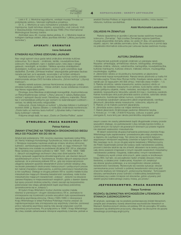 4 Liels ir E. J. Morkūna ieguldījums, veidojot muzeja Trimdas un pretošanās sektoru, īstenojot izglītojošus projektus. Dr. E. J. Morkūns ar savu kompetenci piedalās kultūras mantojuma, īpaši tehnikas objektu, aizsardzību visā Lietuvā. Vińš ir Starptautiskās molinologu asociācijas TIMS (The International Molinological Society) biedrs. Atzīmējot savu 40. muzeja darba jubileju, E. J. Morkūns kopā ar kolēģiem sarīkoja izstādi „Mūsu jaunības tehnika” („Mūsų jaunystės technika“). APSKATI / G R Ā MATAS kopsavilkums / Skróty artykułów analizē Dionīsa Poškas un leģendārā Baubļa saistību, mūsu tautas, vēstures, kultūras savdabības. Aistė Morkūnaitė-Lazauskienė Ceļvedis pa Žemaitiju Raksts iepazīstina ar jaunāko Lietuvas tautas sadzīves muzeja izdevumu „Žemaitija“. Tajā izceltas Žemaitijas reģiona īpatnības, muzejā eksponētās žemaišu sētas, ko veido 31 ēka, citi apskatāmie objekti, zaļumi, tiek atklāta zemnieku dzīve. Šis izdevums ir pirmā daļa no plānotā informatīvā izdevuma par Lietuvas tautas sadzīves muzeju. Irena Seliukaitė Etniskās kultūras izdevumu jaunumi Nav viegli aptvert visus gada laikā iznākušos etniskās kultūras izdevumus. To ir daudz – zinātniski, lietišķi, novadpētniecības izdevumi. No pēdējiem, kam ir dažādi autori, liela daļa ir steigā gatavoti, nerediģēti, ar kļūdām. Tālākos apvidos strādājošiem skolotājiem, kultūras speciālistiem reizēm ir grūti orientēties šajā dažādībā. Žurnālā „Gimtasai kraštas“ atspoguļotās grāmatas šaubas nerada pat tad, ja to apskatā, recenzijās ir arī kritiski vērtējumi. Apskatā autore runā par Lietuvas tautas kultūras centra izdotās elektroniskās sērijas DVD formāta izdevumu „Dzīvā tradīcija” („Gyvoji tradicija“). Minēta nelielā autores Janinas Norkūnienes studija par unikālu etniskās kultūras parādību – Viļńas verbām, kuras izdošanas iniciators bija Neres reģionālais parks. Etnologa Jona Mardosa zinātniskajā monogrāfijā „Austrumlietuvas un Rietumbaltkrievijas verbas” („Rytų Lietuvos ir vakarų Baltarusijos verbos“) apkopoti daudzi avoti, literatūras, pētījumu materiāls. Reizē tas ir izsmeļošākais pētījums par vieniem no kalendārajiem svētkiem – verbas, ko atklāj lietuviešu reliģiozitāte. Izdevumā „Ozols folklorā un kultūrā” („Ąžuolas folklore ir kultūroje“) ievietoti 2009. g. Bijotos (Šilales r.) notikušās zinātniskās konferences „Ozols baltu un kaimińu tautu kultūrā” („Ąžuolas baltų ir kaimyninių tautų kultūroje“) referāti. Krājuma otrajā daļā, ko sauc „Ozols un Dionīss Poška”, autori E T N OLO G IA . PRA C A N AUKOWA Petras Kalnius Zmiany etniczne na terenach środkowego biegu Wilii od połowy XIX do XXI w. Artykuł jest poświęcony 150. rocznicy wyprawy naukowej rzeką Wilią (lit. Neris) hrabiego Konstantego Tyszkiewicza, która się odbyła w 1857 r. Niniejsza rozprawka naukowa analizuje zmiany struktury etnicznej ludności, zamieszkującej środkowy bieg rzeki, w ciągu minionych 150 lat. Napisana ona została na podstawie oficjalnej XIX i XX w. statystyki Rosji carskiej oraz spisów ludności w 1897, 1931, 1942, 1959 i 1989 r., danych szczególnego archiwum Litwy oraz dzieł autorów XIX w., którzy opisywali zagadnienia etnodemograficzne, jak również danych opublikowanych przez K. Tyszkiewicza. Analiza danych statystycznych wykazuje, że w pierwszej połowie XIX w., gdy się rozpoczął proces ulegania wpływom języków słowiaņskich przez ludność wiejską Litwy, na skutek powstałych okoliczności historycznych i politycznych proces ten nabrał charakteru białorusienia, a później polonizacji mieszkaņców, a nie rusyfikacji. Dlatego w drugiej połowie XIX w. szybko malała liczba mieszkaņców mających litewską świadomość narodową, rosła liczba mieszkaņców mających świadomość „tutejszy”. Jedynie na obszarze Janowo-Kiejdany w miejscowościach wiejskich, gdzie z dawien dawna był spory procent drobnej szlachty, Litwini zaczęli się bezpośrednio polonizować bez etapu jakiejkolwiek bądź asymilacji pośredniej (przeistoczenia się w „tutejszy”). W byłym Kraju Wileņskim liczba Litwinów szybko malała również w pierwszym i drugim dziesięcioleciu XX w. Jednakże to zmniejszanie się liczebności przede wszystkim było spowodowane naturalną asymilacją etniczną. Okres (1920-1939 r.) inkorporacji Kraju Wileņskiego w skład Paņstwa Polskiego można uważać za najintensywniejsze lata zmniejszania się wspólnoty Litwinów, ponieważ prócz naturalnej asymilacji ważną rolę zaczął odgrywać czynnik asymilacji przymusowej. Po przyłączeniu w 1939 r. Kraju Wileņskiego do Litwy zostało zahamowane niknięcie wspólnoty Litwinów, jednak w Autoru zināšanai 1. Krājumā tiek publicēti oriģināli zinātniski un pārskata raksti. Nozares: arheoloģija, arhitektūras vēsture, bibliogrāfija, etnoloģija, mākslas zinātne, vēsture, valodniecība, kartogrāfija, novadpētniecība, kultūras mantojums, kultūras vēsture, mākslas vēsture, muzeogrāfija, muzikoloģija, izglītība. 2. Jāiesniedz raksta un tā pielikumu komplekts un jāpievieno elektroniskā kopija kompaktdiskā. Raksta teksts jāizdrukā uz balta A4 formāta papīra Times New Roman šriftā. Kopējais raksta apjoms – ne vairāk par 22 lappusēm (40 000 zīmju). Intervāls starp rindām – 1,5. 3. Raksta struktūra: raksta nosaukums; autora (autoru) vārds un uzvārds; tās iestādes nosaukums un adrese, kurā darbs veikts; raksta teksts (pētījumu objekts, mērķi, metodes, secinājumi); literatūras saraksts; kopsavilkums lietuviešu valodā (0,5 lpp.); ilustrāciju saraksts. Katras ilustrācijas otrā pusē jānorāda autora uzvārds, saīsināts raksta nosaukums, ilustrācijas kārtas numurs, izcelsmes laiks. 4. Literatūras sarakstam (atsaucēm) jābūt oriģinālvalodā