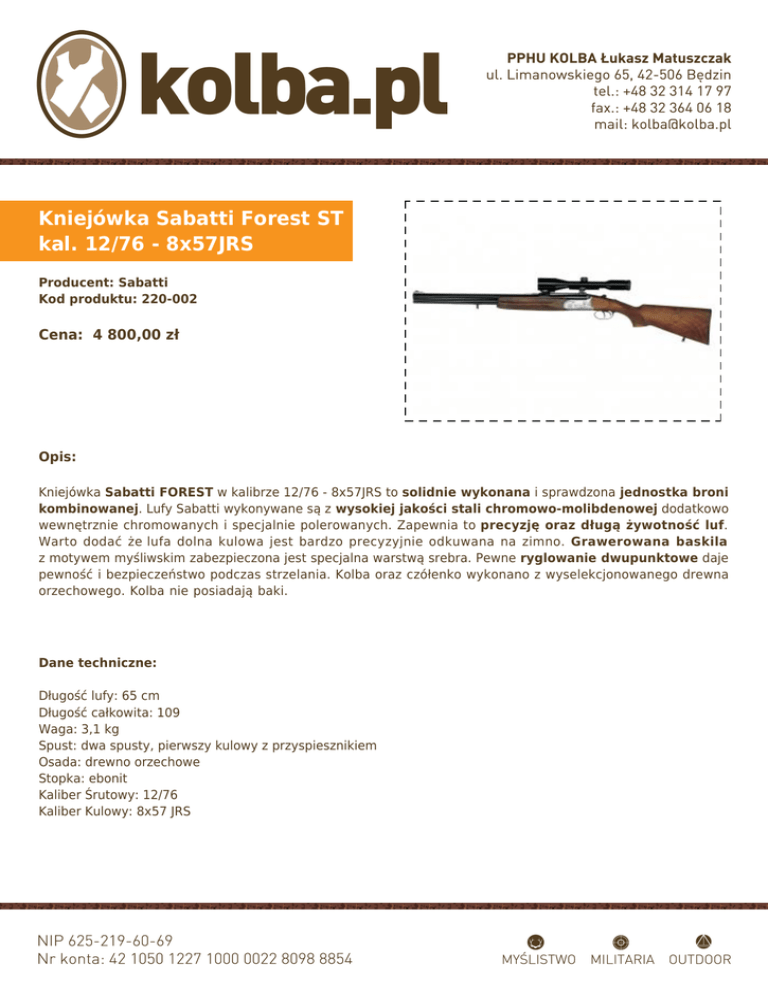 Kniejówka Sabatti Forest ST kal. 12/76 - 8x57JRS Producent: Sabatti Kod produktu: 220-002 Cena: 4 800,00 zł Opis: Kniejówka Sabatti FOREST w kalibrze 12/76 - 8x57JRS to solidnie wykonana i sprawdzona jednostka broni kombinowanej. Lufy Sabatti wykonywane są z wysokiej jakości stali chromowo-molibdenowej dodatkowo wewnętrznie chromowanych i specjalnie polerowanych. Zapewnia to precyzję oraz długą żywotność luf. Warto dodać że lufa dolna kulowa jest bardzo precyzyjnie odkuwana na zimno. Grawerowana baskila z motywem myśliwskim zabezpieczona jest specjalna warstwą srebra. Pewne ryglowanie dwupunktowe daje pewność i bezpieczeństwo podczas strzelania. Kolba oraz czółenko wykonano z wyselekcjonowanego drewna orzechowego. Kolba nie posiadają baki. Dane techniczne: Długość lufy: 65 cm Długość całkowita: 109 Waga: 3,1 kg Spust: dwa spusty, pierwszy kulowy z przyspiesznikiem Osada: drewno orzechowe Stopka: ebonit Kaliber Śrutowy: 12/76 Kaliber Kulowy: 8x57 JRS Dodatkowe informacje: Możliwiość zamówienia kalibru dla lufy gładkiej: 20/76, 12/76 Możliwość zamówienia kalibru dla lufy gwintowanej: 8x57 JRS, 7x65R, 7x57R, 6,5x57R, 6,5x55 SE, 308 Win, 30-06 Spring, 9,3x74R