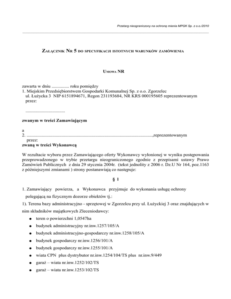 Przetarg nieograniczony na ochronę mienia MPGK Sp. z o.o./2010 ________________________________________________________________________________________________________________________ ZAŁĄCZNIK NR 5 DO SPECYFIKACJI ISTOTNYCH WARUNKÓW ZAMÓWIENIA UMOWA NR zawarta w dniu ............... roku pomiędzy 1. Miejskim Przedsiębiorstwem Gospodarki Komunalnej Sp. z o.o. Zgorzelec ul. Łużycka 3 NIP 6151894671, Regon 231193684, NR KRS 000195605 reprezentowanym przez: .................................. zwanym w treści Zamawiającym a 2. ............................................................................................................,reprezentowanym przez: zwaną w treści Wykonawcą W rezultacie wyboru przez Zamawiającego oferty Wykonawcy wyłonionej w wyniku postępowania przeprowadzonego w trybie przetargu nieograniczonego zgodnie z przepisami ustawy Prawo Zamówień Publicznych z dnia 29 stycznia 2004r. (tekst jednolity z 2006 r. Dz.U Nr 164, poz.1163 z późniejszymi zmianami ) strony postanawiają co następuje: § l 1. Zamawiający powierza, a Wykonawca przyjmuje do wykonania usługę ochrony polegającą na fizycznym dozorze obiektów tj.: 1). Terenu bazy administracyjno - sprzętowej w Zgorzelcu przy ul. Łużyckiej 3 oraz znajdujących w nim składników majątkowych Zleceniodawcy: ● teren o powierzchni 1,0547ha ● budynek administracyjny nr.inw.1257/105/A ● budynek administracyjno-gospodarczy nr.inw.1258/105/A ● budynek gospodarczy nr.inw.1256/101/A ● budynek gospodarczy nr.inw.1255/101/A ● wiata CPN plus dystrybutor nr.inw.1254/104/TS plus nr.inw.9/449 ● garaż – wiata nr.inw.1252/102/TS ● garaż – wiata nr.inw.1253/102/TS Przetarg nieograniczony na ochronę mienia MPGK Sp. z o.o./2010 ________________________________________________________________________________________________________________________ ● myjnia samochodowa nr.inw.1262/291/TS ● myjnia samochodowa - separator nr.inw.1263/291/TS ● ogrodzenie Łużycka nr.inw.1259/291/A ● nawierzchnia placu nr.inw.1260/220/A ● kabel elektryczny podziemny nr.inw.1261/211/A ● pojazdy samochodowe, sprzęt technologiczny garażujący na terenie bazy: KIA – DZG 81CU LUBLIN –ciężarowy – DZG 25 RL POLONEZ – DZG 76AF ŻUK - DZG J827 Ciągnik URSUS C-360 – DZG 37XN Ciągnik URSUS 3512 – DZG 38XN Ciągnik URSUS C-360 – DZG 41XN Ciągnik rolniczy – DZG 05YN STAR - kontenerowiec – DZG52SS STAR – kontenerowiec – DZG S443 STAR - kontenerowiec – DZG L203 JELCZ- kontenerowiec – DZG R905 STAR - zamiatarka – DZG 73CT LUBLIN - śmieciowy – DZG 82CU JELCZ - śmieciarka – DZG 71CT JELCZ - śmieciarka – DZG 72CT JELCZ - śmieciarka – DZG R071 JELCZ - śmieciarka – DZG 47CT SKODA - Liaz - śmieciarka - DZG 48CT VOLVO - śmieciarka – DZG 59CT LUBLIN - skrzyniowy – DZG 11AX MULTIKAR - skrzyniowy - JEZ 5358 STAR - kontenerowiec – piaskarka DZG M189 STAR - podnośnik – DZG R079 JELCZ - piaskarka – DZG 51CT DAF – śmieciarka – DZG S788 Przetarg nieograniczony na ochronę mienia MPGK Sp. z o.o./2010 ________________________________________________________________________________________________________________________ DAF – śmieciarka – DZG S789 Przyczepa ciągnikowa – DZG V258 Przyczepa ciągnikowa – DZG V260 Przyczepa ciągnikowa – DZG V257 Zamiatarka chodnikowa - ZS 13 Zamiatarka chodnikowa – ZS 13 Cyklop - T 214/3 Mikrociągnik LT 4140H Koparko – ładowarka Ostrówek - NK 0451B Wózek akumulatorowy WNA Wózek pogrzebowy – MELEX Ciągnik MTD – kosiarka Ciągniczek TV 521 oraz inne nie wymienione pojazdy mechaniczne i sprzęt technologiczny garażujący na terenie bazy w zależności od zaistniałych potrzeb. 2). Terenu bazy administracyjno- sprzętowej Zakładu Utylizacji Odpadów Komunalnych Jędrzychowicach: ● teren o powierzchni – 4,7 hektara ● hala technologiczna –1264/101/TW ● budynek garażowy- 1265/102/TW ● budynek garażowy kompaktora- 1266/102/TW ● przepompownia odcieków –1267/211/TW ● lokalna przepompownia ścieków- 1268/211/TW ● budynek administracyjno- gospodarczy- 1269/105/TW ● kompaktor –126/580/TW ● ładowarka kołowa- 143/763/TW ● samochód asenizacyjny- 144/743/TW ● samochód hakowy VOLVO – 142/743/TW ● samochód hakowy Jelcz DZG-97TH ● spycharka DT-141/746/TW ● samochód ciężarowy STAR 742 – 1321/743/TW ● stacja transformatorowa- 139/613/TW ● system sterowania i instalacji - 125/492/TW w Przetarg nieograniczony na ochronę mienia MPGK Sp. z o.o./2010 ________________________________________________________________________________________________________________________ ● waga samochodowa +portiernia – 216/660/TW –215/660/TW ● wiata na surowce wtórne –1272/291/TW ● zasieki na odpady –1271/291/TW ● zasobnia na odpady –1270/291/TW ● zespół biofiltrów- 137/659/TW ● ogrodzenie chronionego terenu oraz inne nie wymienione pojazdy mechaniczne i sprzęt technologiczny garażujący na terenie bazy w zależności od zaistniałych potrzeb. 2. Monitorowaniu wraz z reakcją własnych grup interwencyjnych systemów alarmowych zamontowanych w obiektach Zamawiającego. 3. Czas dojazdu grupy interwencyjnej do monitorowanego obiektu Zamawiającego przyjmuje się odpowiednio: – – Baza Administracyjno – Sprzętowa w Zgorzelcu przy ul. Łużyckiej 3 do 5 minut. Baza Administracyjno – Sprzętowa Zakładu Utylizacji Odpadów Komunalnych w Jędrzychowicach do 15 min. – Czas dojazdu może ulec wydłużeniu z powodu trudnych warunków atmosferycznych lub siły wyższej uznanych zgodnie przez obie strony umowy. 4. Wykonawca potwierdza fakt stałego posiadania ważnej polisy ubezpieczeniowej od odpowiedzialności cywilnej dotyczącej jego działalności oraz zobowiązuje się do posiadania takiej polisy przez cały czas obowiązywania umowy . §2 1. Wykonawca w toku umowy zobowiązuje się postępować z najwyższą starannością. 2. Wykonawca i Zamawiający zachowują w 