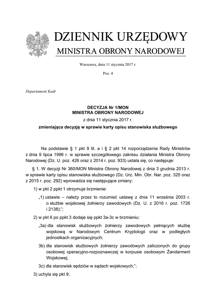 Warszawa, dnia 11 stycznia 2017 r. Poz. 4 Departament Kadr DECYZJA Nr 1/MON MINISTRA OBRONY NARODOWEJ z dnia 11 stycznia 2017 r. zmieniająca decyzję w sprawie karty opisu stanowiska służbowego Na podstawie § 1 pkt 9 lit. a i § 2 pkt 14 rozporządzenia Rady Ministrów z dnia 9 lipca 1996 r. w sprawie szczegółowego zakresu działania Ministra Obrony Narodowej (Dz. U. poz. 426 oraz z 2014 r. poz. 933) ustala się, co następuje: § 1. W decyzji Nr 360/MON Ministra Obrony Narodowej z dnia 3 grudnia 2013 r. w sprawie karty opisu stanowiska służbowego (Dz. Urz. Min. Obr. Nar. poz. 325 oraz z 2015 r. poz. 292) wprowadza się następujące zmiany: 1) w pkt 2 ppkt 1 otrzymuje brzmienie: „1) ustawie – należy przez to rozumieć ustawę z dnia 11 września 2003 r. o służbie wojskowej żołnierzy zawodowych (Dz. U. z 2016 r. poz. 1726 i 2138);”; 2) w pkt 6 po ppkt 3 dodaje się ppkt 3a-3c w brzmieniu: „3a) dla stanowisk służbowych żołnierzy zawodowych pełniących służbę wojskową w Narodowym Centrum Kryptologii oraz w podległych jednostkach organizacyjnych; 3b) dla stanowisk służbowych żołnierzy zawodowych zaliczonych do grupy osobowej operacyjno-rozpoznawczej w korpusie osobowym Żandarmerii Wojskowej; 3c) dla stanowisk sędziów w sądach wojskowych;”; 3) uchyla się pkt 9; 4) pkt 12a otrzymuje brzmienie: „12a. Projekty KOSS opracowane w jednostkach wojskowych podległych organom, o których mowa w pkt 21 ppkt 2 lit. c, przed ich przesłaniem do akceptacji Dyrektora Departamentu Kadr poddaje się zaopiniowaniu, w systemie elektronicznym, przez te organy lub osoby przez nie upoważnione.”; 5) pkt 21 otrzymuje brzmienie: „21. Organem właściwym do akceptacji projektów KOSS jest: 1) Minister Obrony Narodowej – w przypadku projektów KOSS opracowanych przez Dyrektora Departamentu Kadr; 2) Dyrektor Departamentu Kadr lub osoba przez niego upoważniona – w przypadku projektów KOSS opracowanych dla stanowisk służbowych: a) zaszeregowanych do stopni etatowych od pułkownika (komandora) włącznie, b) stanowisk służbowych dowódców jednostek wojskowych oraz ich zastępców, c) dla których opracowanie projektu KOSS należy do Szefa Sztabu Generalnego WP, Dowódcy Generalnego Rodzajów Sił Zbrojnych, Dowódcy Operacyjnego Rodzajów Sił Zbrojnych, Dowódcy Wojsk Obrony Terytorialnej, Dowódcy Garnizonu Warszawa, Komendanta Głównego Żandarmerii Wojskowej oraz innych dowódców jednostek wojskowych bezpośrednio podległych Ministrowi Obrony Narodowej, d) w innych przypadkach niewymienionych w pkt 1, 3 i 4; 3) organy właściwe do wyznaczania na stanowiska służbowe i zwalniania z tych stanowisk, zgodnie z kompetencjami określonymi w art. 44 ustawy; 4) bezpośredni przełożeni organów, o których mowa w pkt 3, jeżeli do tych organów należy opracowanie projektu KOSS.”; 6) po pkt 27 dodaje się pkt 27a w brzmieniu: „27a. Uwierzytelniony wydruk KOSS przesyła się do organu właściwego do powołania do zawodowej służby wojskowej lub wyznaczenia na stanowisko służbowe wraz z wnioskiem o powołanie lub wyznaczenie na to stanowisko.”; 7) w załączniku Nr 1 „KARTA OPISU STANOWISKA SŁUŻBOWEGO” część IV – „WYMAGANIA BEZPIECZEŃSTWA” otrzymuje brzmienie: CZĘŚC IV – WYMAGANIA BEZPIECZEŃSTWA Poświadczenie bezpieczeństwa w zakresie dostępu do informacji niejawnych Upoważnienie kierownika jednostki organizacyjnej w zakresie dostępu do informacji niejawnych oznaczonych klauzulą „ZASTRZEŻONE” 8) w załączniku Nr 2 „METODYKA OPRACOWANIA KARTY OPISU STANOWISKA SŁUŻBOWEGO” w rozdziale II części IV – „WYMAGANIA BEZPIECZEŃSTWA” otrzymuje brzmienie: Część IV – WYMAGANIA BEZPIECZEŃSTWA Opis pola informacyjnego Komentarz Poświadczenie bezpieczeństwa w zakresie dostępu do informacji niejawnych wpisać odpowiednio: WYMAGANE albo NIEWYMAGANE Upoważnienie kierownika jednostki organizacyjnej w zakresie dostępu do informacji niejawnych oznaczonych klauzulą „ZASTRZEŻONE” wpisać odpowiednio: WYMAGANE albo NIEWYMAGANE § 2. Projekty KOSS znajdujące się w systemie elektronicznym niezaakceptowane do dnia wejścia w życie decyzji, podlegają wycofaniu przez dowódcę jednostki wojskowej z dniem wejścia w życie decyzji. § 3. Decyzja wchodzi w życie z dniem 31 marca 2017 r., z wyjątkiem przepisów § 1 pkt 7 i 8, które wchodzą w życie po upływie 14 dni od dnia ogłoszenia. Minister Obrony Narodowej: A. Macierewicz