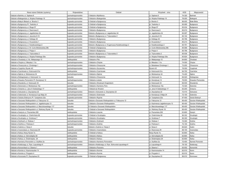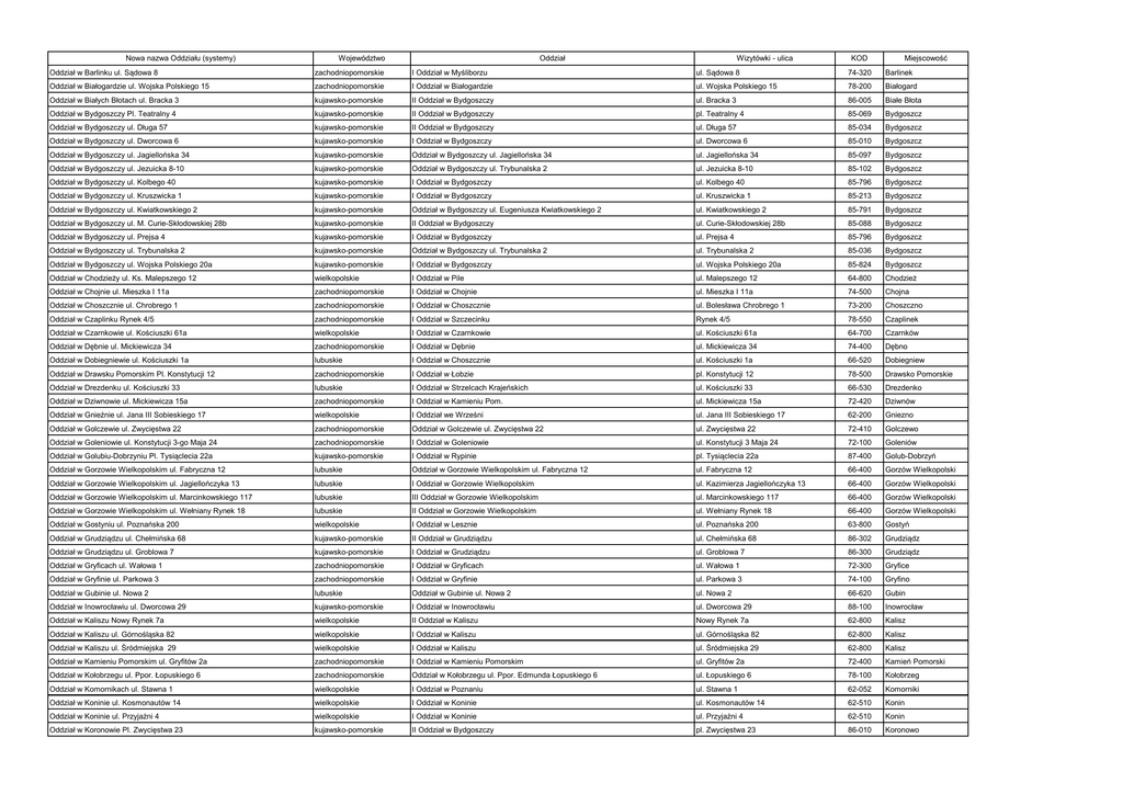 Nowa nazwa Oddziału (systemy) Województwo Oddział Wizytówki - ulica KOD Miejscowość Oddział w Barlinku ul. Sądowa 8 zachodniopomorskie I Oddział w Myśliborzu ul. Sądowa 8 74-320 Barlinek Oddział w Białogardzie ul. Wojska Polskiego 15 zachodniopomorskie I Oddział w Białogardzie ul. Wojska Polskiego 15 78-200 Białogard Oddział w Białych Błotach ul. Bracka 3 kujawsko-pomorskie II Oddział w Bydgoszczy ul. Bracka 3 86-005 Białe Błota Oddział w Bydgoszczy Pl. Teatralny 4 kujawsko-pomorskie II Oddział w Bydgoszczy pl. Teatralny 4 85-069 Bydgoszcz Oddział w Bydgoszczy ul. Długa 57 kujawsko-pomorskie II Oddział w Bydgoszczy ul. Długa 57 85-034 Bydgoszcz Oddział w Bydgoszczy ul. Dworcowa 6 kujawsko-pomorskie I Oddział w Bydgoszczy ul. Dworcowa 6 85-010 Bydgoszcz Oddział w Bydgoszczy ul. Jagiellońska 34 kujawsko-pomorskie Oddział w Bydgoszczy ul. Jagiellońska 34 ul. Jagiellońska 34 85-097 Bydgoszcz Oddział w Bydgoszczy ul. Jezuicka 8-10 kujawsko-pomorskie Oddział w Bydgoszczy ul. Trybunalska 2 ul. Jezuicka 8-10 85-102 Bydgoszcz Oddział w Bydgoszczy ul. Kolbego 40 kujawsko-pomorskie I Oddział w Bydgoszczy ul. Kolbego 40 85-796 Bydgoszcz Oddział w Bydgoszczy ul. Kruszwicka 1 kujawsko-pomorskie I Oddział w Bydgoszczy ul. Kruszwicka 1 85-213 Bydgoszcz Oddział w Bydgoszczy ul. Kwiatkowskiego 2 kujawsko-pomorskie Oddział w Bydgoszczy ul. Eugeniusza Kwiatkowskiego 2 ul. Kwiatkowskiego 2 85-791 Bydgoszcz Oddział w Bydgoszczy ul. M. Curie-Skłodowskiej 28b kujawsko-pomorskie II Oddział w Bydgoszczy ul. Curie-Skłodowskiej 28b 85-088 Bydgoszcz Oddział w Bydgoszczy ul. Prejsa 4 kujawsko-pomorskie I Oddział w Bydgoszczy ul. Prejsa 4 85-796 Bydgoszcz Oddział w Bydgoszczy ul. Trybunalska 2 kujawsko-pomorskie Oddział w Bydgoszczy ul. Trybunalska 2 ul. Trybunalska 2 85-036 Bydgoszcz Oddział w Bydgoszczy ul. Wojska Polskiego 20a kujawsko-pomorskie I Oddział w Bydgoszczy ul. Wojska Polskiego 20a 85-824 Bydgoszcz Oddział w Chodzieży ul. Ks. Malepszego 12 wielkopolskie I Oddział w Pile ul. Malepszego 12 64-800 Chodzież Oddział w Chojnie ul. Mieszka I 11a zachodniopomorskie I Oddział w Chojnie ul. Mieszka I 11a 74-500 Chojna Oddział w Choszcznie ul. Chrobrego 1 zachodniopomorskie I Oddział w Choszcznie ul. Bolesława Chrobrego 1 73-200 Choszczno Oddział w Czaplinku Rynek 4/5 zachodniopomorskie I Oddział w Szczecinku Rynek 4/5 78-550 Czaplinek Oddział w Czarnkowie ul. Kościuszki 61a wielkopolskie I Oddział w Czarnkowie ul. Kościuszki 61a 64-700 Czarnków Oddział w Dębnie ul. Mickiewicza 34 zachodniopomorskie I Oddział w Dębnie ul. Mickiewicza 34 74-400 Dębno Oddział w Dobiegniewie ul. Kościuszki 1a lubuskie I Oddział w Choszcznie ul. Kościuszki 1a 66-520 Dobiegniew Oddział w Drawsku Pomorskim Pl. Konstytucji 12 zachodniopomorskie I Oddział w Łobzie pl. Konstytucji 12 78-500 Drawsko Pomorskie Oddział w Drezdenku ul. Kościuszki 33 lubuskie I Oddział w Strzelcach Krajeńskich ul. Kościuszki 33 66-530 Drezdenko Oddział w Dziwnowie ul. Mickiewicza 15a zachodniopomorskie I Oddział w Kamieniu Pom. ul. Mickiewicza 15a 72-420 Dziwnów Oddział w Gnieźnie ul. Jana III Sobieskiego 17 wielkopolskie I Oddział we Wrześni ul. Jana III Sobieskiego 17 62-200 Gniezno Oddział w Golczewie ul. Zwycięstwa 22 zachodniopomorskie Oddział w Golczewie ul. Zwycięstwa 22 ul. Zwycięstwa 22 72-410 Golczewo Oddział w Goleniowie ul. Konstytucji 3-go Maja 24 zachodniopomorskie I Oddział w Goleniowie ul. Konstytucji 3 Maja 24 72-100 Goleniów Oddział w Golubiu-Dobrzyniu Pl. Tysiąclecia 22a kujawsko-pomorskie I Oddział w Rypinie pl. Tysiąclecia 22a 87-400 Golub-Dobrzyń Oddział w Gorzowie Wielkopolskim ul. Fabryczna 12 lubuskie Oddział w Gorzowie Wielkopolskim ul. Fabryczna 12 ul. Fabryczna 12 66-400 Gorzów Wielkopolski Oddział w Gorzowie Wielkopolskim ul. Jagiellończyka 13 lubuskie I Oddział w Gorzowie Wielkopolskim ul. Kazimierza Jagiellończyka 13 66-400 Gorzów Wielkopolski Oddział w Gorzowie Wielkopolskim ul. Marcinkowskiego 117 lubuskie III Oddział w Gorzowie Wielkopolskim ul. Marcinkowskiego 117 66-400 Gorzów Wielkopolski Oddział w Gorzowie Wielkopolskim ul. Wełniany Rynek 18 lubuskie II Oddział w Gorzowie Wielkopolskim ul. Wełniany Rynek 18 66-400 Gorzów Wielkopolski Oddział w Gostyniu ul. Poznańska 200 wielkopolskie I Oddział w Lesznie ul. Poznańska 200 63-800 Gostyń Oddział w Grudziądzu ul. Chełmińska 68 kujawsko-pomorskie II Oddział w Grudziądzu ul. Chełmińska 68 86-302 Grudziądz Oddział w Grudziądzu ul. Groblowa 7 kujawsko-pomorskie I Oddział w Grudziądzu ul. Groblowa 7 86-300 Grudziądz Oddział w Gryficach ul. Wałowa 1 zachodniopomorskie I Oddział w Gryficach ul. Wałowa 1 72-300 Gryfice Oddział w Gryfinie ul. Parkowa 3 zachodniopomorskie I Oddział w Gryfinie ul. Parkowa 3 74-100 Gryfino Oddział w Gubinie ul. Nowa 2 lubuskie Oddział w Gubinie ul. Nowa 2 ul. Nowa 2 66-620 Gubin Oddział w Inowrocławiu ul. Dworcowa 29 kujawsko-pomorskie I Oddział w Inowrocławiu ul. Dworcowa 29 88-100 Inowrocław Oddział w Kaliszu Nowy Rynek 7a wielkopolskie II Oddział w Kaliszu Nowy Rynek 7a 62-800 Kalisz Oddział w Kaliszu ul. Górnośląska 82 wielkopolskie I Oddział w Kaliszu ul. Górnośląska 82 62-800 Kalisz Oddział w Kaliszu ul. Śródmiejska 29 wielkopolskie I Oddział w Kaliszu ul. Śródmiejska 29 62-800 Kalisz Oddział w Kamieniu Pomorskim ul. Gryfitów 2a zachodniopomorskie I Oddział w Kamieniu Pomorskim ul. Gryfitów 2a 72-400 Kamień Pomorski Oddział w Kołobrzegu ul. Ppor. Łopuskiego 6 zachodniopomorskie Oddział w Kołobrzegu ul. Ppor. Edmunda Łopuskiego 6 ul. Łopuskiego 6 78-100 Kołobrzeg Oddział w Komornikach ul. Stawna 1 wielkopolskie I Oddział w Poznaniu ul. Stawna 1 62-052 Komorniki Oddział w Koninie ul. Kosmonautów 14 wielkopolskie I Oddział w Koninie ul. Kosmonautów 14 62-510 Konin Oddział w Koninie ul. Przyjaźni 4 wielkopolskie I Oddział w Koninie ul. Przyjaźni 4 62-510 Konin Oddzi