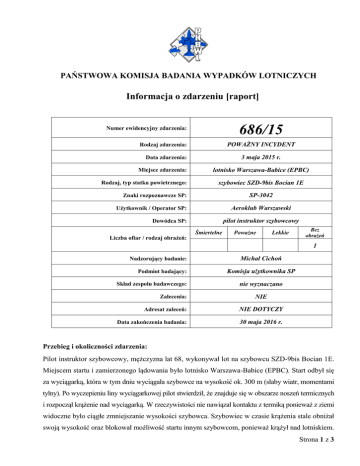 PAŃSTWOWA KOMISJA BADANIA WYPADKÓW LOTNICZYCH Informacja o zdarzeniu [raport] 686/15 Numer ewidencyjny zdarzenia: POWAŻNY INCYDENT Rodzaj zdarzenia: 3 maja 2015 r. Data zdarzenia: Miejsce zdarzenia: Rodzaj, typ statku powietrznego: lotnisko Warszawa-Babice (EPBC) szybowiec SZD-9bis Bocian 1E SP-3042 Znaki rozpoznawcze SP: Użytkownik / Operator SP: Aeroklub Warszawski Dowódca SP: Liczba ofiar / rodzaj obrażeń: pilot instruktor szybowcowy Śmiertelne Poważne Lekkie Bez obrażeń 1 Nadzorujący badanie: Podmiot badający: Skład zespołu badawczego: Zalecenia: Michał Cichoń Komisja użytkownika SP nie wyznaczano NIE Adresat zaleceń: NIE DOTYCZY Data zakończenia badania: 30 maja 2016 r. Przebieg i okoliczności zdarzenia: Pilot instruktor szybowcowy, mężczyzna lat 68, wykonywał lot na szybowcu SZD-9bis Bocian 1E. Miejscem startu i zamierzonego lądowania było lotnisko Warszawa-Babice (EPBC). Start odbył się za wyciągarką, która w tym dniu wyciągała szybowce na wysokość ok. 300 m (słaby wiatr, momentami tylny). Po wyczepieniu liny wyciągarkowej pilot stwierdził, że znajduje się w obszarze noszeń termicznych i rozpoczął krążenie nad wyciągarką. W rzeczywistości nie nawiązał kontaktu z termiką ponieważ z ziemi widoczne było ciągłe zmniejszanie wysokości szybowca. Szybowiec w czasie krążenia stale obniżał swoją wysokość oraz blokował możliwość startu innym szybowcom, ponieważ krążył nad lotniskiem. Strona 1 z 3 Kierownik lotów wydał przez radio polecenie: „Bocian 42 do lądowania”. Pilot nie zareagował na komendę kierownika lotów i dalej obniżał lot w krążeniu. Komenda „Bocian 42 do lądowania” została podana jeszcze kilka razy. Na wysokości 150 m pilot zorientował się, że nie krąży w obszarze noszeń termicznych. Na wysokości ok. 100 m rozpoczął wykonywanie kręgu nadlotniskowego z okolic wyciągarki, nie uwzględniając utraty wysokości w locie po kręgu. Kierownik lotów po ocenie wysokości szybowca wydał polecenie: „Bocian ląduj z wiatrem” (pas trawiasty był wolny, pilot mógł bezpiecznie wylądować). Pilot nie posłuchał komendy kierownika lotów i wykonywał lot do IV zakrętu kręgu szybowcowego. Na pozycji z wiatrem wysokość lotu wynosiła ok. 30 m. Pilot kontynuował lot i na wschodnim skraju pasa trawiastego wykonał zakręt o 180º na kierunek „28”. W czasie zakrętu wykonywanego na wysokości 5÷10 m pilot zawadził skrzydłem szybowca o ziemię i wylądował. Fakt zahaczenia prawym skrzydłem o ziemię zgłosiła przez radio na częstotliwości 122.300 MHz załoga samolotu (która oczekiwała na zgodę na start z pasa 28) oraz świadkowie zdarzenia. Po lądowaniu nie stwierdzono uszkodzeń zewnętrznych SP. Pilot nie doznał obrażeń. Zdarzenie zaistniało o godz. 14:22 LMT. Pilot instruktor nie słyszał komend kierującego lotami, miał również wątpliwości co do prawidłowej pracy wariometru. W związku z tym dokonano przeglądu wariometru i radiostacji w szybowcu – nie stwierdzono nieprawidłowości. Przyczyną braku słyszalności poleceń kierownika lotów było najprawdopodobniej ustawienie poziomu odsłuchu na minimum. Wykonano także przegląd szybowca pod kątem uszkodzeń wewnętrznych – nie stwierdzono uszkodzeń. Pilot instruktor posiadał ważne badania lotniczo-lekarskie, KTP i KWT. Nalot ogólny pilota na szybowcach wynosił: 670 godz. (na samolotach: 11700 godz.). Nalot ogólny na typie szybowca, na którym nastąpiło zdarzenie: 200 godz. Nalot w ostatnich 90 dniach: ok. 29 godz., nalot w ciągu ostatnich 24 h przed zdarzeniem: 2 godz. Nalot szybowca Bocian od początku eksploatacji wynosił 3489 godz. 39 min. w 22205 lotach. Przyczyny zdarzenia lotniczego: 1. Wykonywanie lotu niezgodnie z zasadami budowy kręgu nadlotniskowego po starcie za wyciągarką; 2. Poszukiwanie noszeń termicznych na krytycznej wysokości lotu; 3. Brak decyzji pilota o lądowaniu przeciwnie do kierunku startu (lądowania z wiatrem) po utracie wysokości umożliwiającej budowę kręgu nadlotniskowego; 4. Wykonanie zakrętu o 180º na krytycznie małej wysokości, co doprowadziło do zaczepienia skrzydłem szybowca o ziemię. Okoliczności sprzyjające: 1. Niewłaściwa ocena wysokości przez pilota w trakcie wykonywania lotu; 2. Brak słyszalności poleceń kierownika lotów z powodu nadmiernego wyciszenia radia w szybowcu. Strona 2 z 3 Działania profilaktyczne podjęte przez podmiot badający: Pilot instruktor został zawieszony w wykonywaniu lotów do czasu wyjaśnienia zdarzenia. Instruktorzy zostali powiadomieni o zdarzeniu. Zalecenia dotyczące bezpieczeństwa: Komisja nie formułowała zaleceń dotyczących bezpieczeństwa. Koniec Nadzorujący badanie: Imię i nazwisko Podpis Michał Cichoń podpis na oryginale Strona 3 z 3