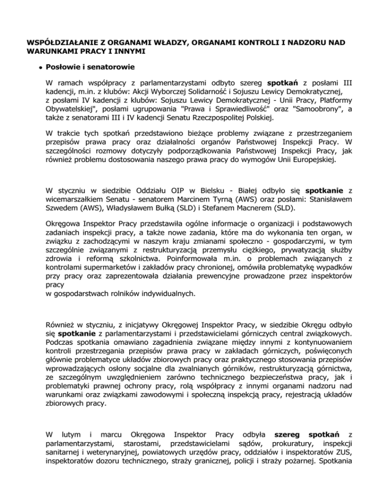 WSPÓŁDZIAŁANIE Z ORGANAMI WŁADZY, ORGANAMI KONTROLI I NADZORU NAD WARUNKAMI PRACY I INNYMI Posłowie i senatorowie W ramach współpracy z parlamentarzystami odbyto szereg spotkań z posłami III kadencji, m.in. z klubów: Akcji Wyborczej Solidarność i Sojuszu Lewicy Demokratycznej, z posłami IV kadencji z klubów: Sojuszu Lewicy Demokratycznej - Unii Pracy, Platformy Obywatelskiej", posłami ugrupowania "Prawa i Sprawiedliwość" oraz "Samoobrony", a także z senatorami III i IV kadencji Senatu Rzeczpospolitej Polskiej. W trakcie tych spotkań przedstawiono bieżące problemy związane z przestrzeganiem przepisów prawa pracy oraz działalności organów Państwowej Inspekcji Pracy. W szczególności rozmowy dotyczyły podporządkowania Państwowej Inspekcji Pracy, jak również problemu dostosowania naszego prawa pracy do wymogów Unii Europejskiej. W styczniu w siedzibie Oddziału OIP w Bielsku - Białej odbyło się spotkanie z wicemarszałkiem Senatu - senatorem Marcinem Tyrną (AWS) oraz posłami: Stanisławem Szwedem (AWS), Władysławem Bułką (SLD) i Stefanem Macnerem (SLD). Okręgowa Inspektor Pracy przedstawiła ogólne informacje o organizacji i podstawowych zadaniach inspekcji pracy, a także nowe zadania, które ma do wykonania ten organ, w związku z zachodzącymi w naszym kraju zmianami społeczno - gospodarczymi, w tym szczególnie związanymi z restrukturyzacją przemysłu ciężkiego, prywatyzacją służby zdrowia i reformą szkolnictwa. Poinformowała m.in. o problemach związanych z kontrolami supermarketów i zakładów pracy chronionej, omówiła problematykę wypadków przy pracy oraz zaprezentowała działania prewencyjne prowadzone przez inspektorów pracy w gospodarstwach rolników indywidualnych. Również w styczniu, z inicjatywy Okręgowej Inspektor Pracy, w siedzibie Okręgu odbyło się spotkanie z parlamentarzystami i przedstawicielami górniczych central związkowych. Podczas spotkania omawiano zagadnienia związane między innymi z kontynuowaniem kontroli przestrzegania przepisów prawa pracy w zakładach górniczych, poświęconych głównie problematyce układów zbiorowych pracy oraz praktycznego stosowania przepisów wprowadzających osłony socjalne dla zwalnianych górników, restrukturyzacją górnictwa, ze szczególnym uwzględnieniem zarówno technicznego bezpieczeństwa pracy, jak i problematyki prawnej ochrony pracy, rolą współpracy z innymi organami nadzoru nad warunkami oraz związkami zawodowymi i społeczną inspekcją pracy, rejestracją układów zbiorowych pracy. W lutym i marcu Okręgowa Inspektor Pracy odbyła szereg spotkań z parlamentarzystami, starostami, przedstawicielami sądów, prokuratury, inspekcji sanitarnej i weterynaryjnej, powiatowych urzędów pracy, oddziałów i inspektoratów ZUS, inspektoratów dozoru technicznego, straży granicznej, policji i straży pożarnej. Spotkania takie odbyły się na terenie działania oddziałów OIP w Rybniku, Zawierciu, Częstochowie oraz Bielsku - Białej (w Cieszynie i Żywcu). Celem spotkań było omówienie dotychczasowej współpracy pomiędzy inspektorami pracy, a innymi organami nadzoru. W marcu kierownictwo Okręgowego Inspektoratu Pracy w Katowicach spotkało się z parlamentarzystami Akcji Wyborczej "Solidarność" i Sojuszu Lewicy Demokratycznej z województwa śląskiego. Program obu spotkań obejmował m.in. prezentację wyników działalności Okręgowego Inspektoratu Pracy za rok 2000, omówienie zadań inspekcji pracy w roku 2001, jak również informację o tematyce wpływających do okręgu skarg. W październiku i listopadzie 2001r. Okręgowa Inspektor Pracy spotkała się z posłami IV Kadencji Sejmu Rzeczpospolitej Polskiej. Podczas spotkań szefowa katowickiego okręgu Inspekcji Pracy przedstawiła zakres działania i zadania Państwowej Inspekcji Pracy oraz podstawowe problemy związane z działalnością kontrolno-nadzorczą tego urzędu, ze szczególnym omówieniem zagadnień związanych ze współpracą Państwowej Inspekcji Pracy z samorządami, problematyką skarg pracowniczych i wypadków przy pracy, zakładami pracy chronionej, kontrolami przeprowadzanymi wspólnie z innymi organami. Szczególną uwagę zwróciła na luki prawne w obowiązujących przepisach prawa pracy, które często wręcz uniemożliwiają walkę z negatywnymi zjawiskami, takimi jak np. zatrudnianie na czarno. Uczestnicy spotkania uznali podjęcie bieżącej współpracy za niezmiernie pożyteczne, szczególnie w zakresie informowania o występujących problemach i nieprawidłowościach w sferze ochrony pracy. Parlamentarzystom wręczono sprawozdanie z działalności Okręgowego Inspektoratu Pracy w 2000 roku. W październiku kierownik Oddziału OIP w Rybniku uczestniczył, na zaproszenie pracodawców zrzeszonych w "Forum Firm Miasta Radlin", w spotkaniu z udziałem senatora R.P. - Adama Graczyńskiego oraz Powiatowego Inspektora Nadzoru Budowlanego w Wodzisławiu Śląskim. Na spotkaniu zaprezentowano zmiany w przepisach prawa pracy, ze szczególnym uwzględnieniem zmian w ustawie o PIP i wiążące się z tym konsekwencje dla pracodawców. W listopadzie Okręgowa Inspektor Pracy została zaproszona do udziału w spotkaniu kadry kierowniczej zakładów górniczych z sekretarzem stanu w Ministerstwie Gospodarki Andrzejem Szarawarskim oraz parlamentarzystami województwa śląskiego, zorganizowanym przez Porozumienie Związków Zawodowych "Kadra". Spotkanie przebiegające pod hasłem: "Uporządkowanie i konsolidacja sektora" poświęcone było aktualnej kondycji górnictwa węgla kamiennego oraz przedsiębiorstw blisko związanych z kopalniami, a także zamierzeniom w sferze dalszej restrukturyzacji. Urzędy administracji terenowej i samorządowej W marcu w siedzibie Okręgowego Inspektoratu Pracy w Katowicach odbyło się spotkanie Okręgowej Inspektor Pracy z wiceprzewodniczącym Zarządu Województwa Śląskiego. W spotkaniu wzięli również udział zastępcy OIP oraz in